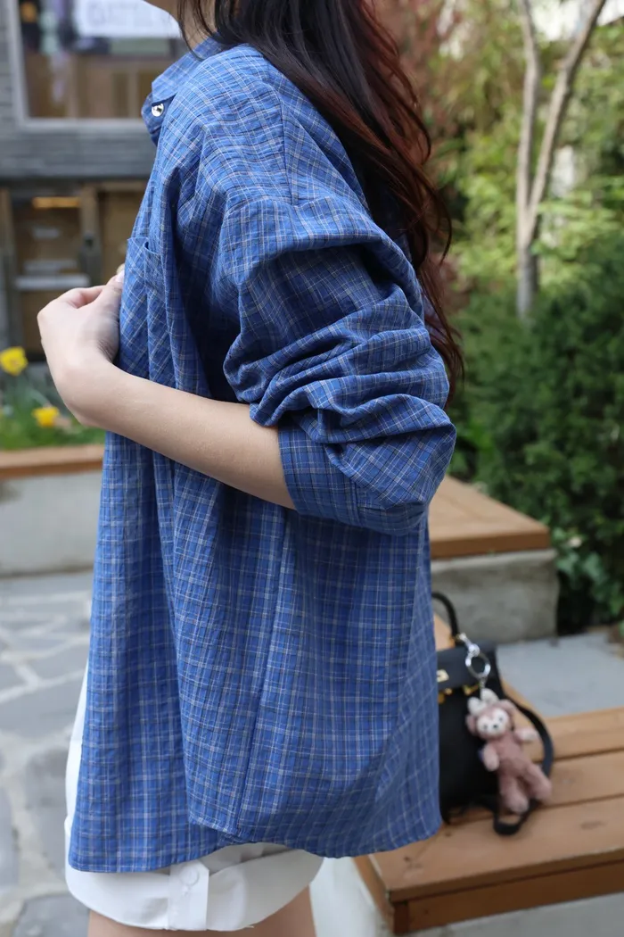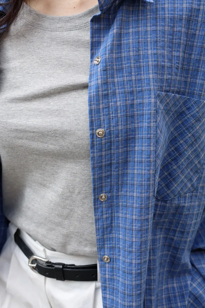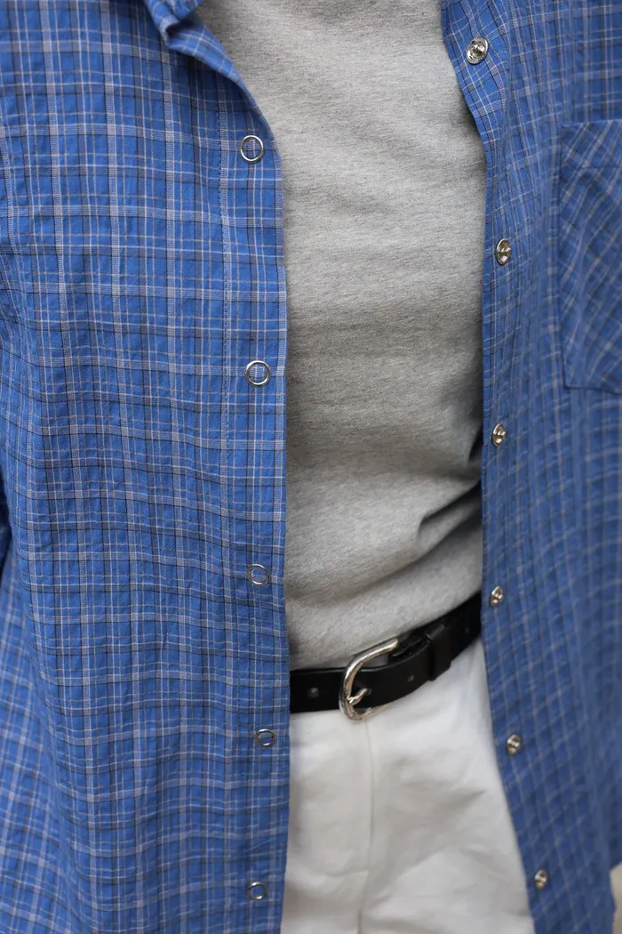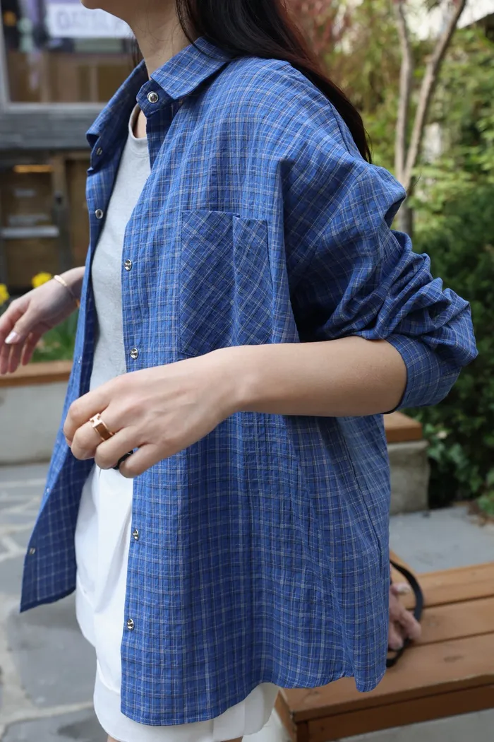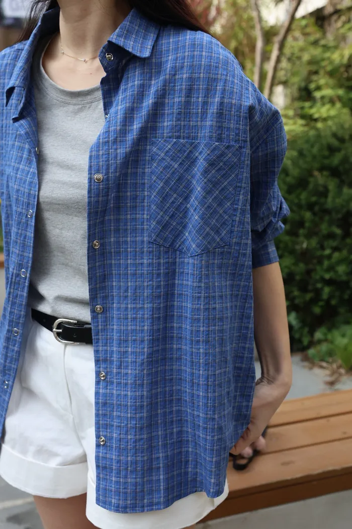 AE04 休閒寶藍撞色細格壓扣襯衫