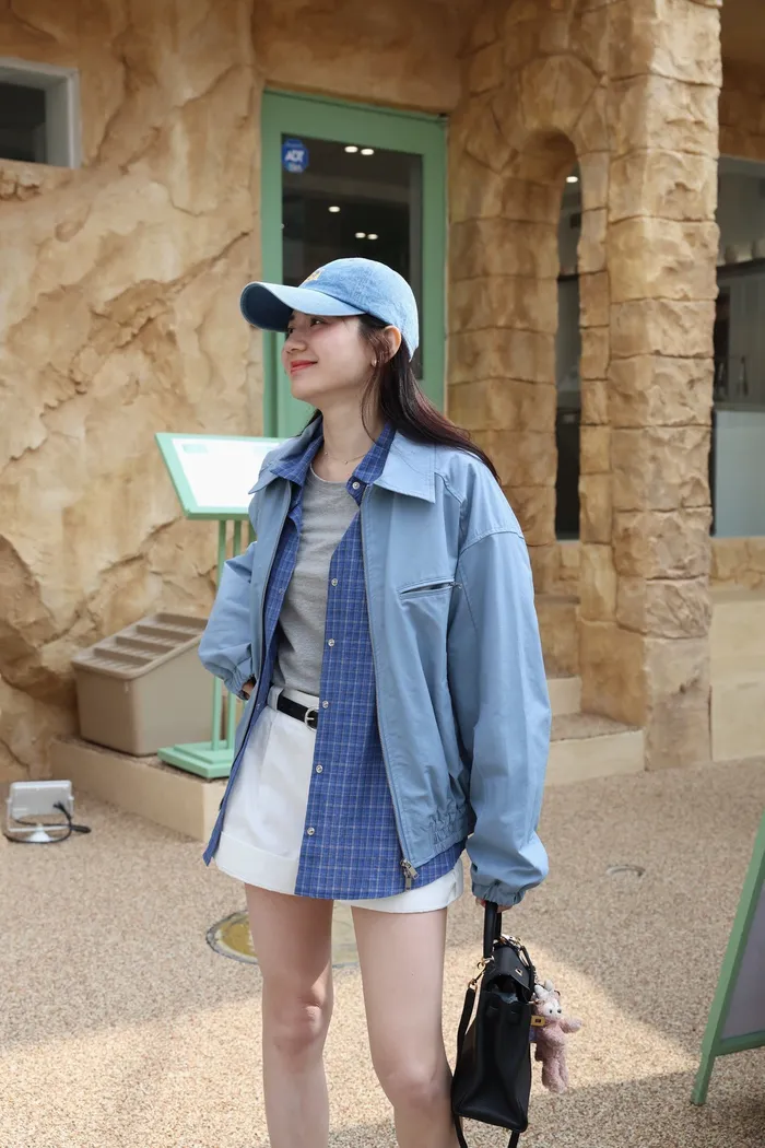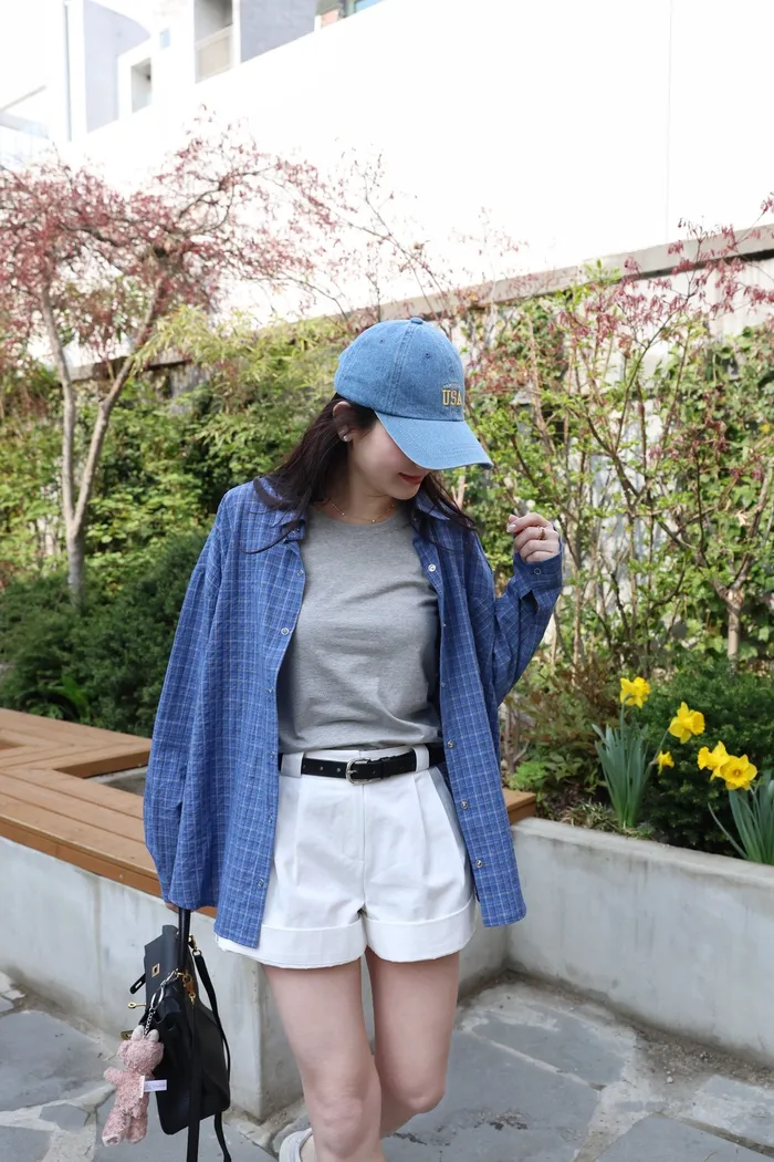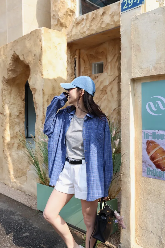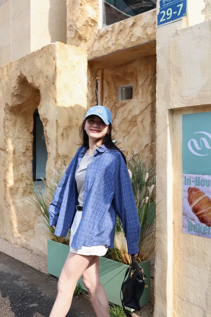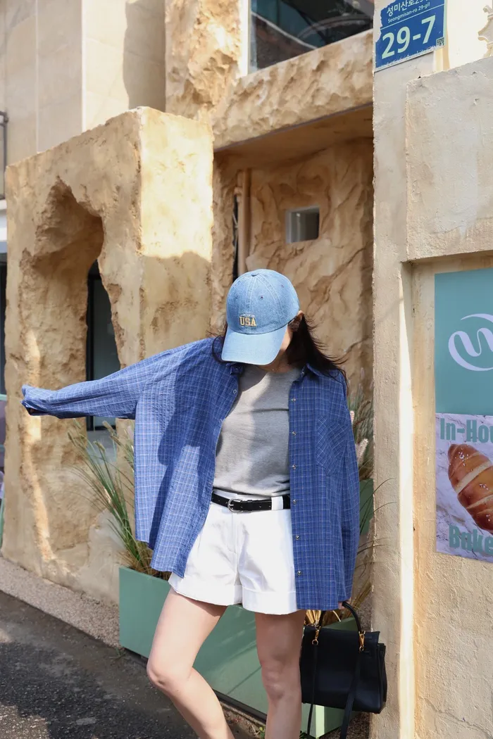 AE04 休閒寶藍撞色細格壓扣襯衫