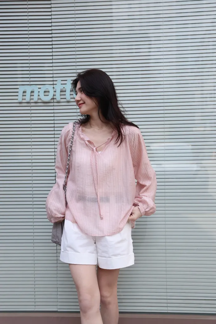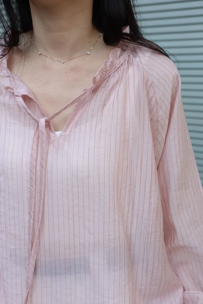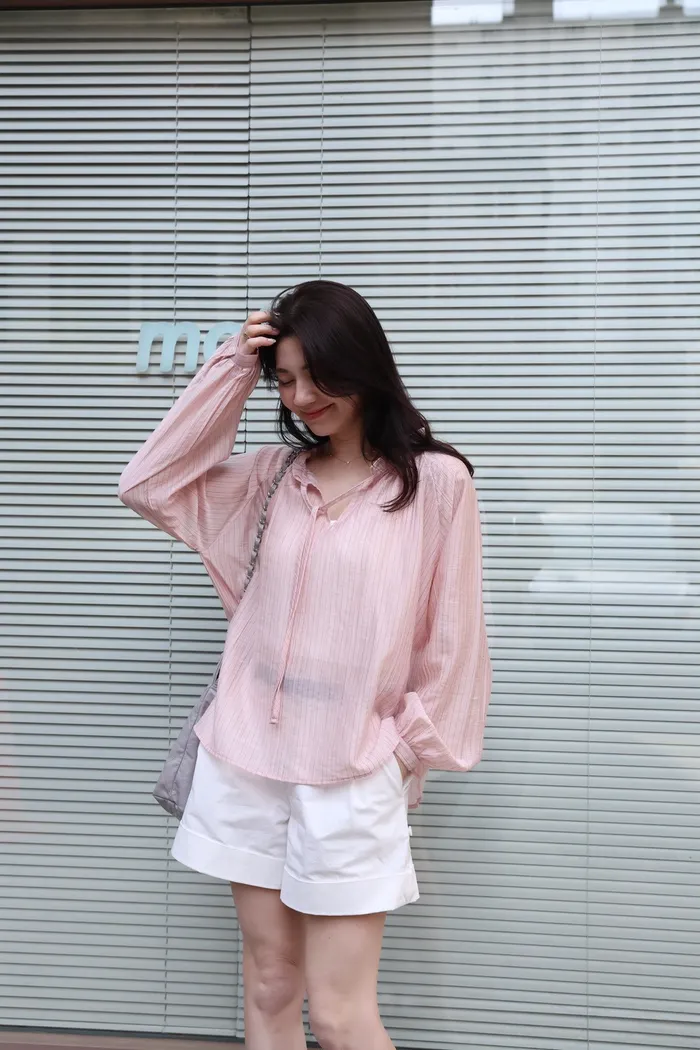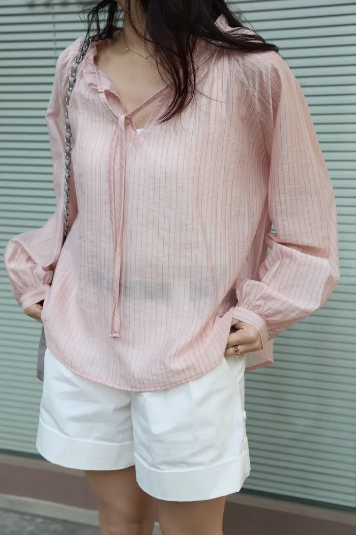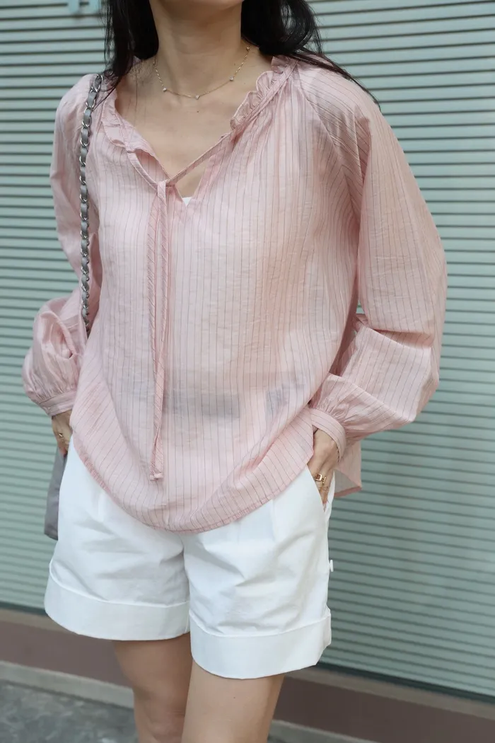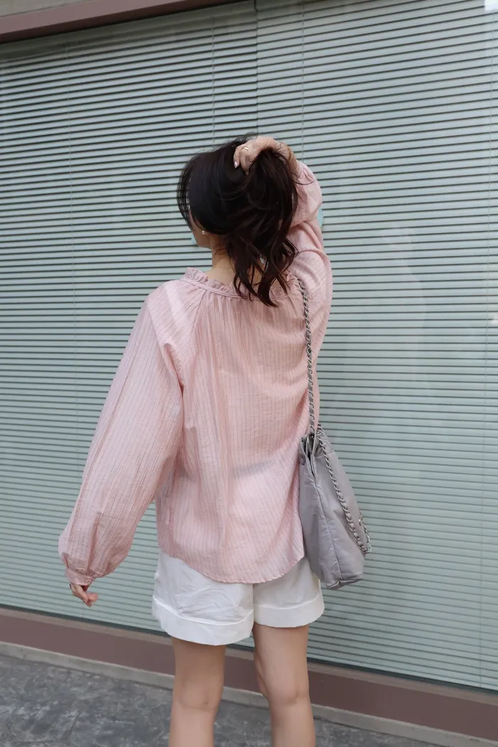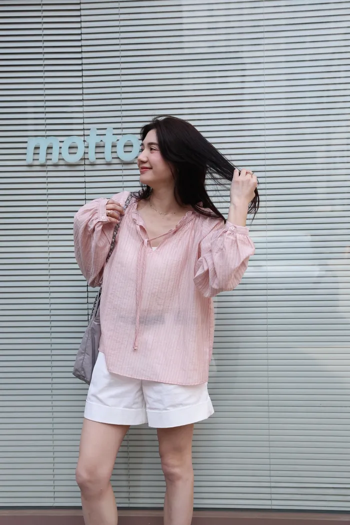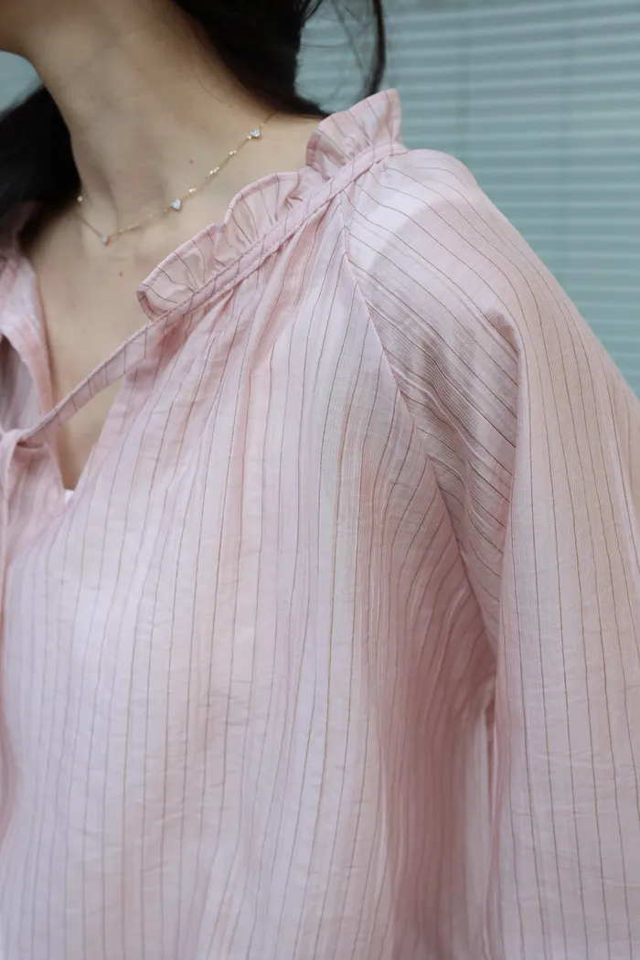AE08 絲光感細條紋綁帶荷葉領落肩上衣(粉/米白)