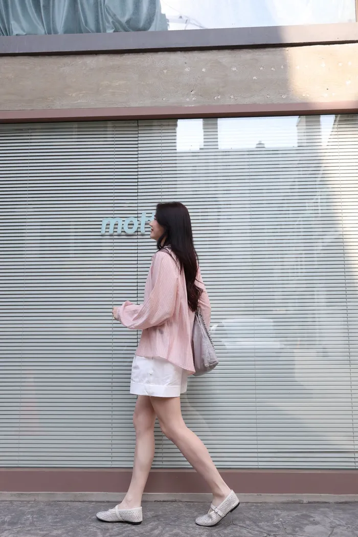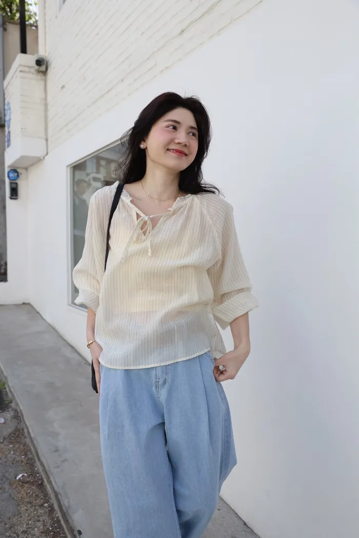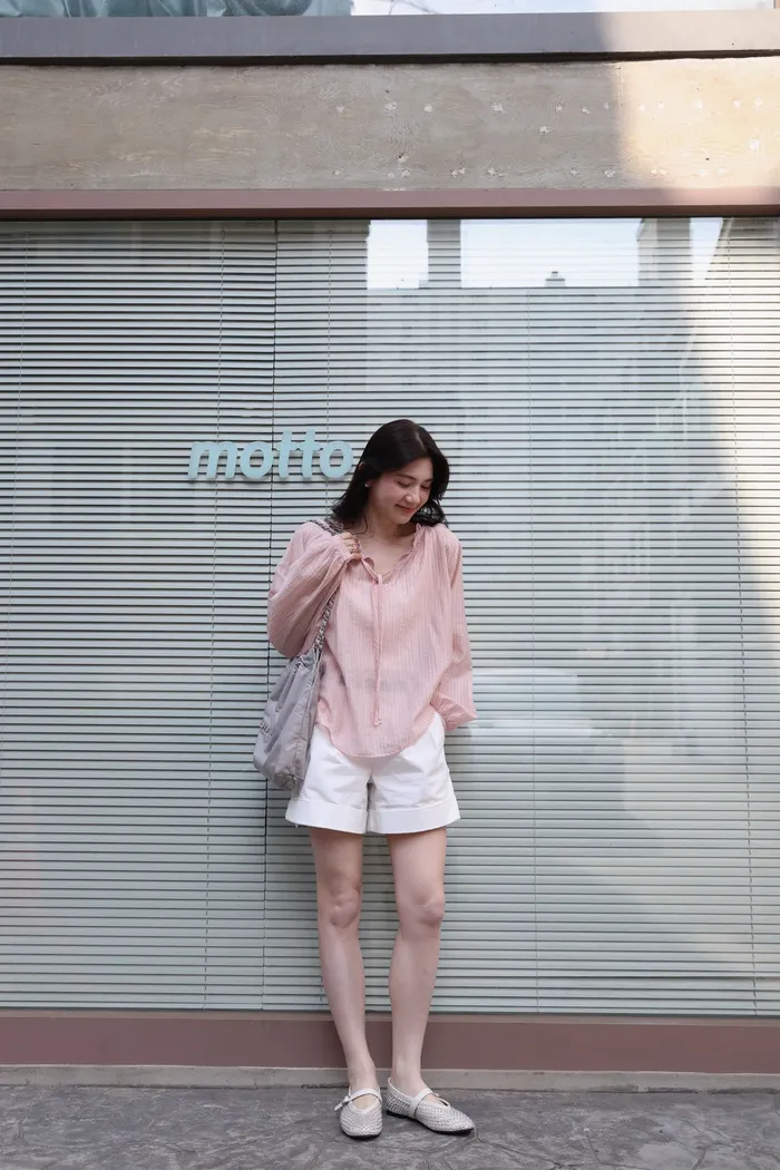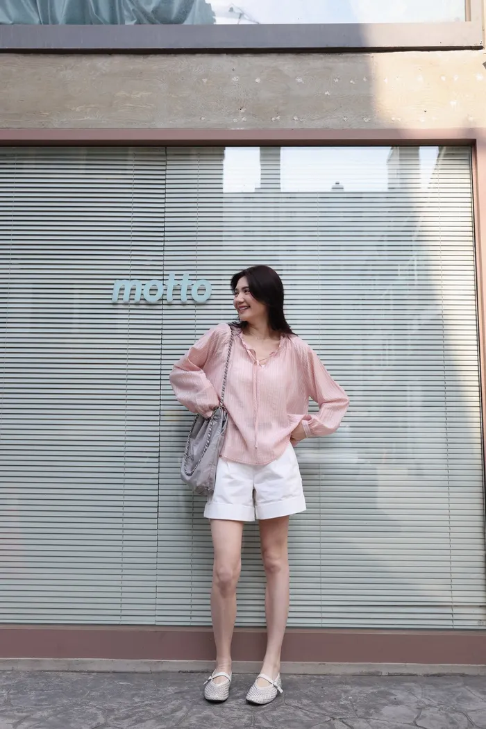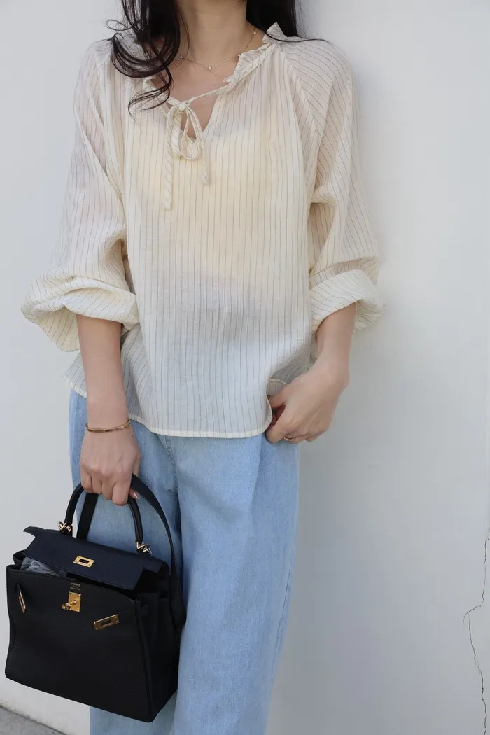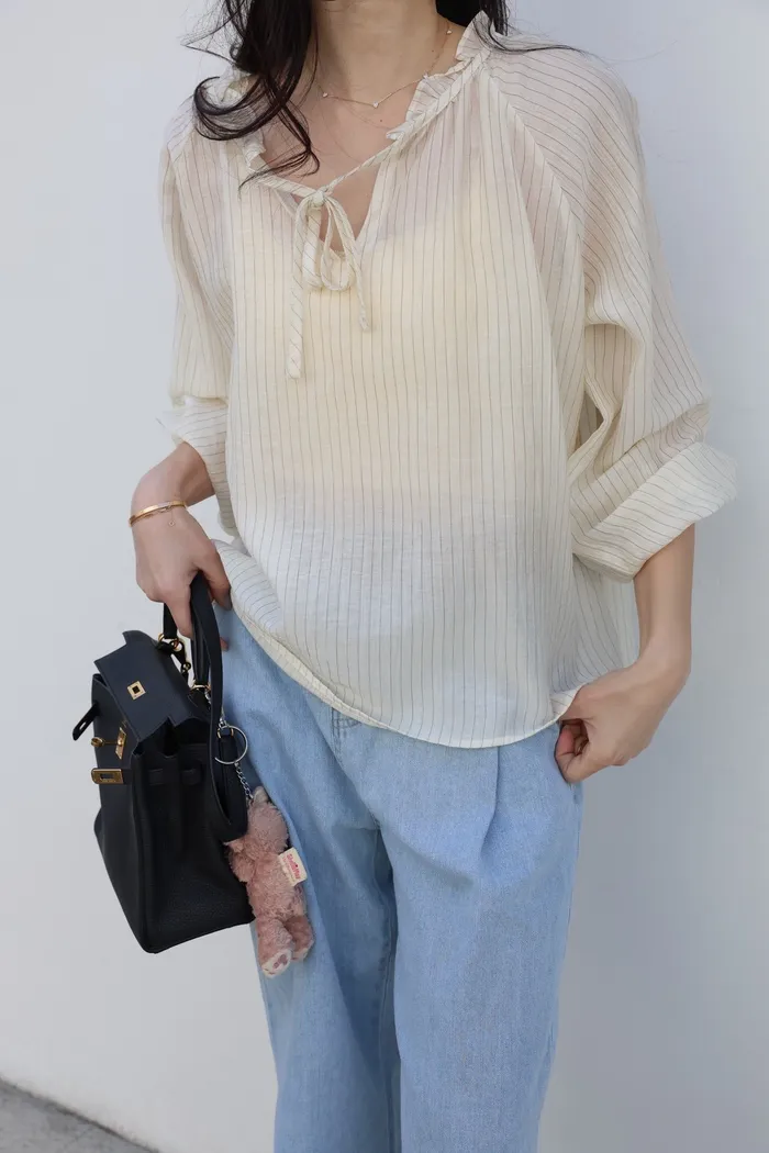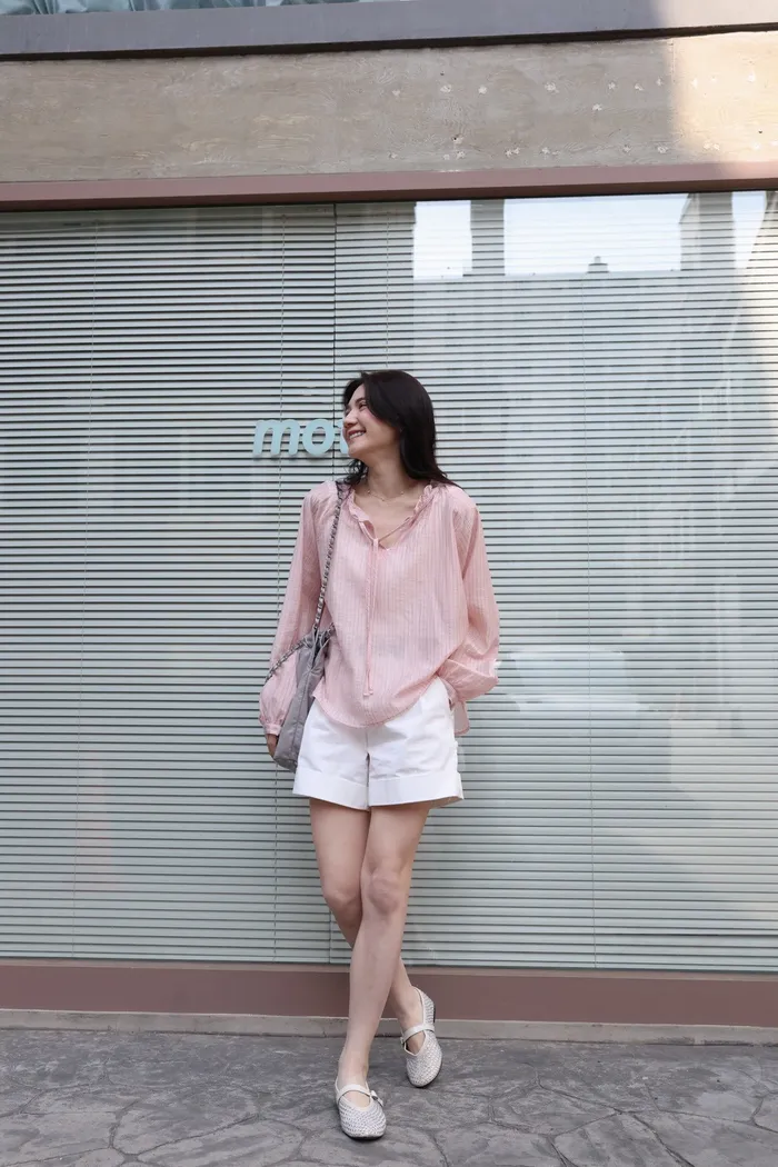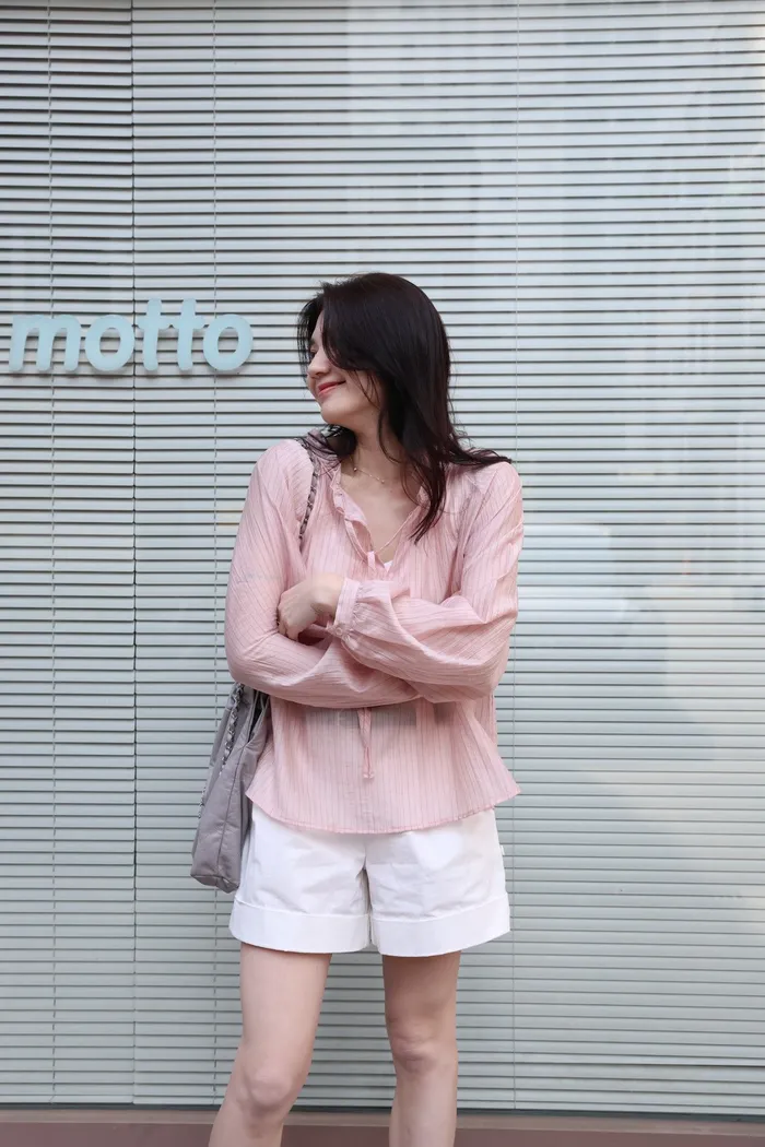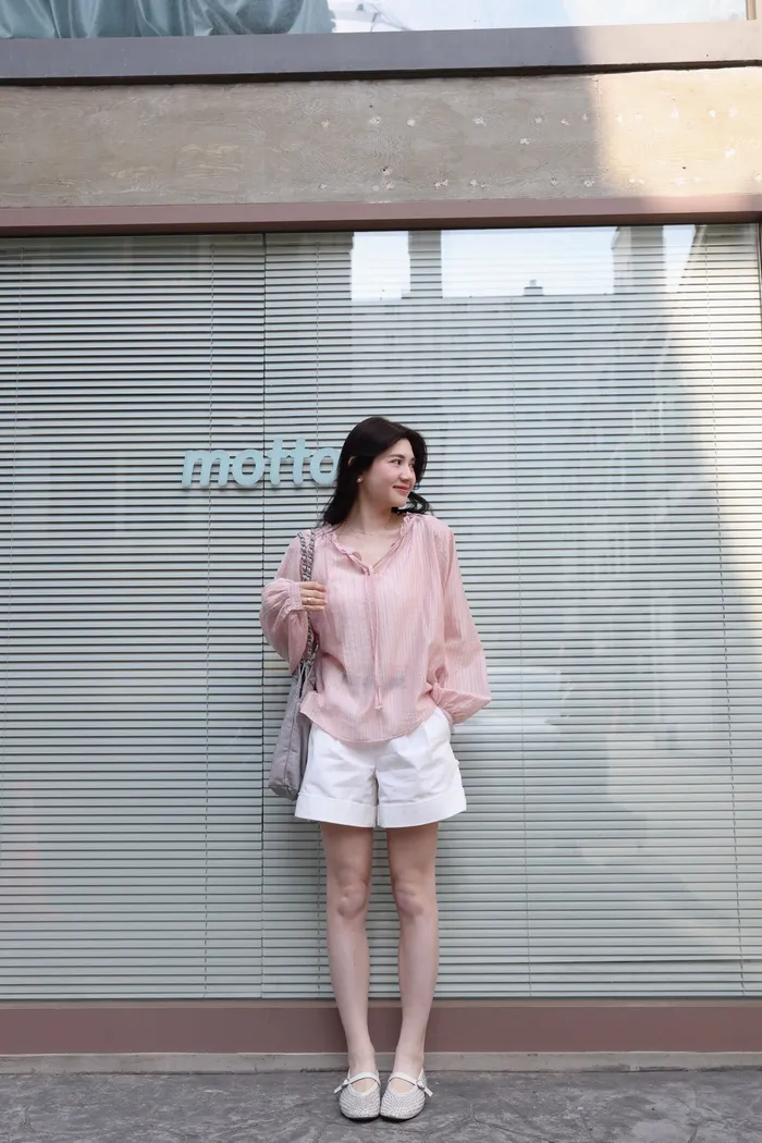 AE08 絲光感細條紋綁帶荷葉領落肩上衣(粉/米白)