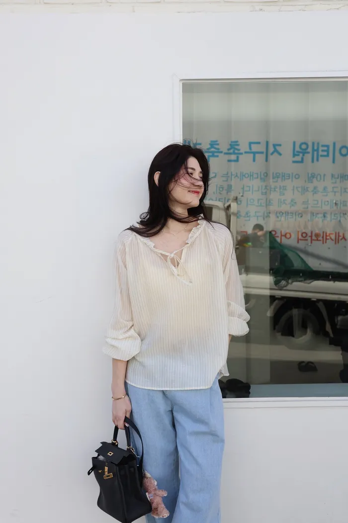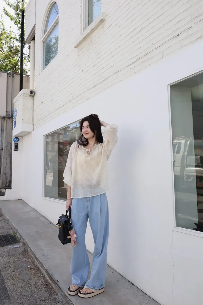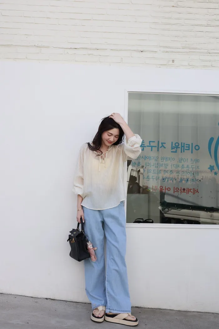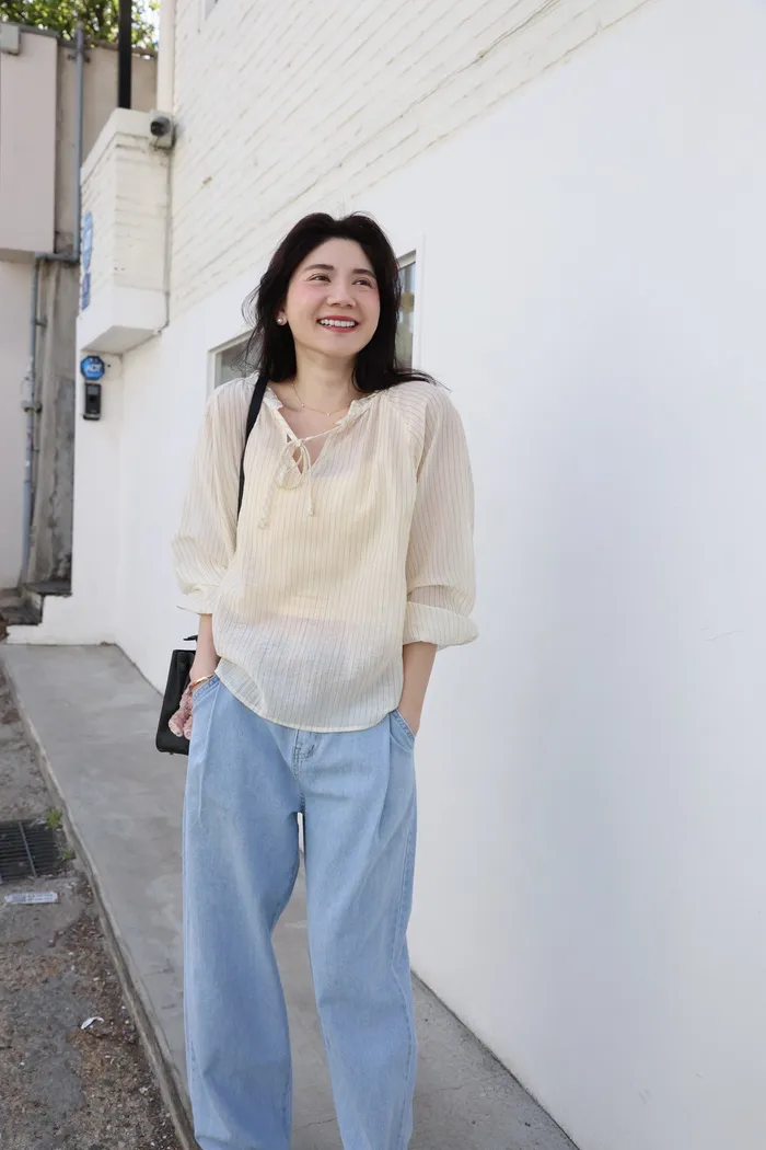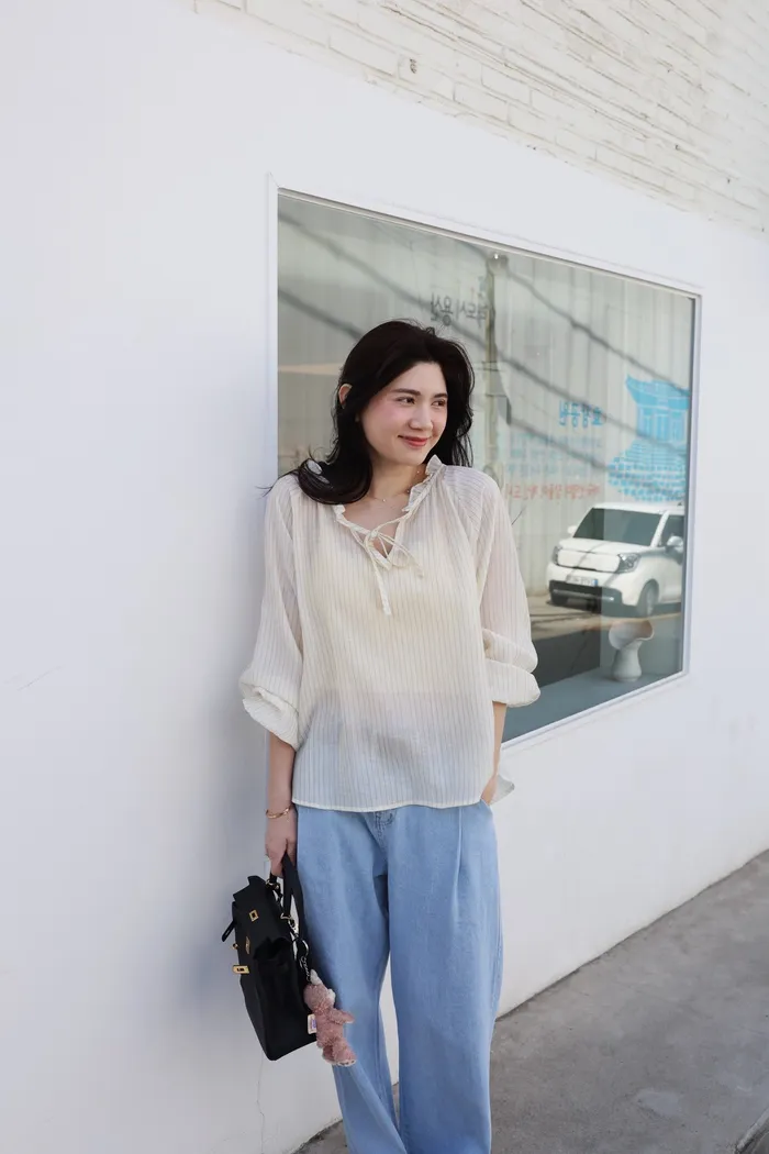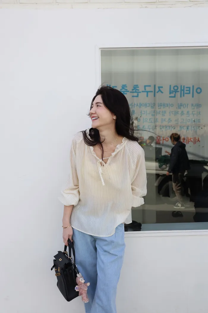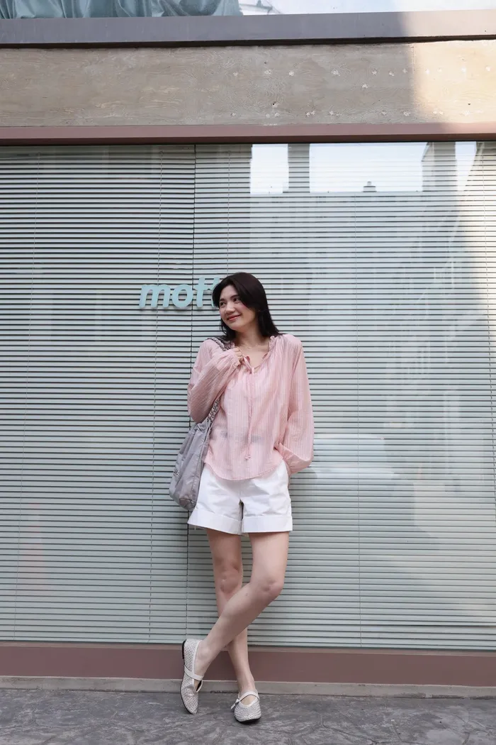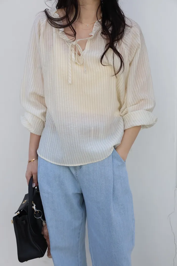 AE08 絲光感細條紋綁帶荷葉領落肩上衣(粉/米白)