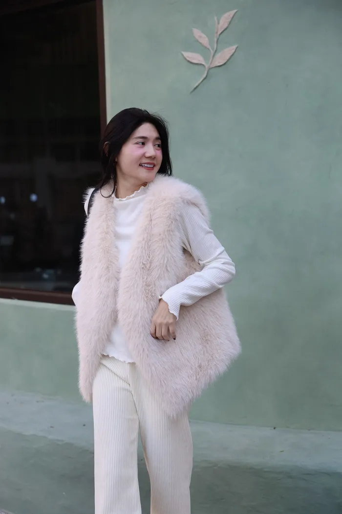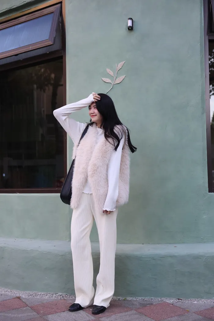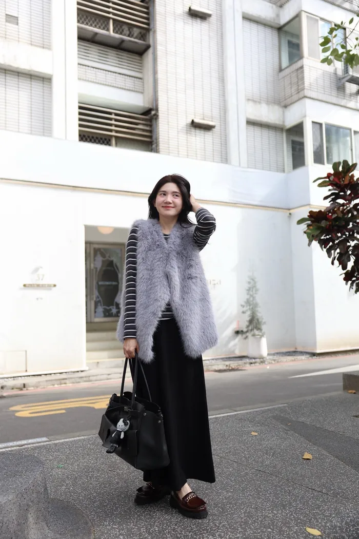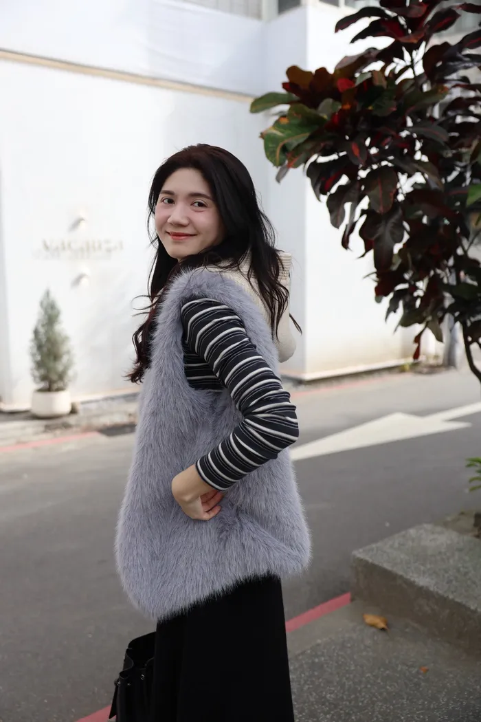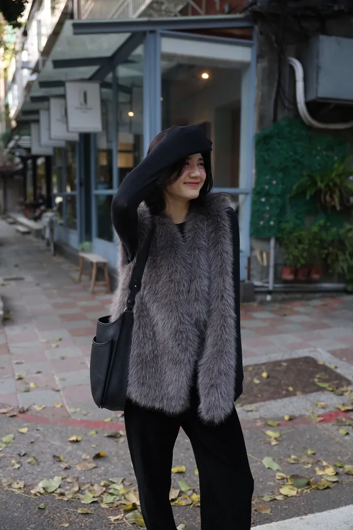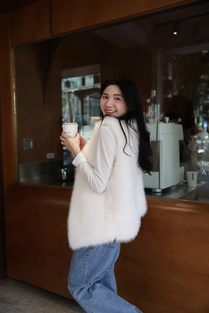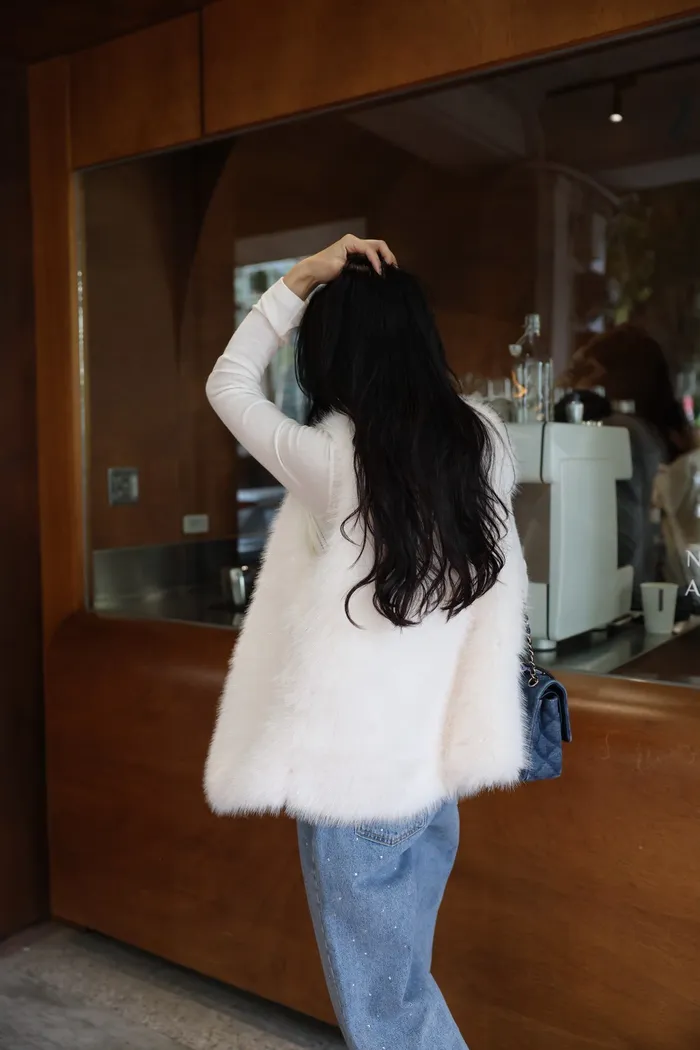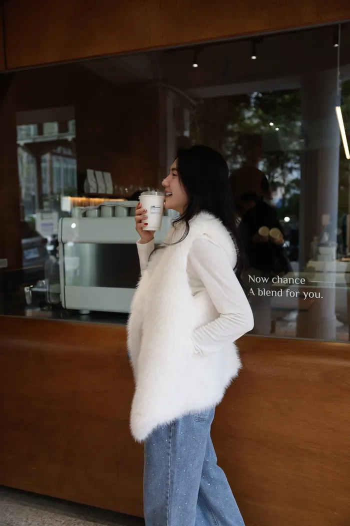 DL02 低調貴婦閃亮毛毛口袋背心(米白/灰/咖/杏)