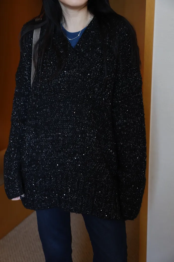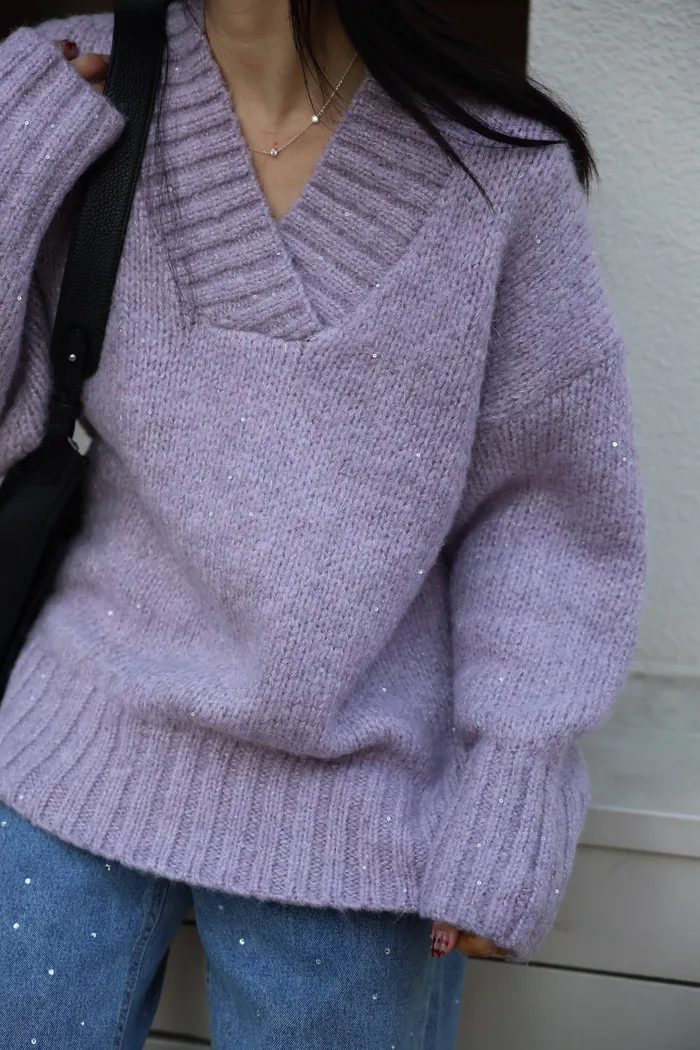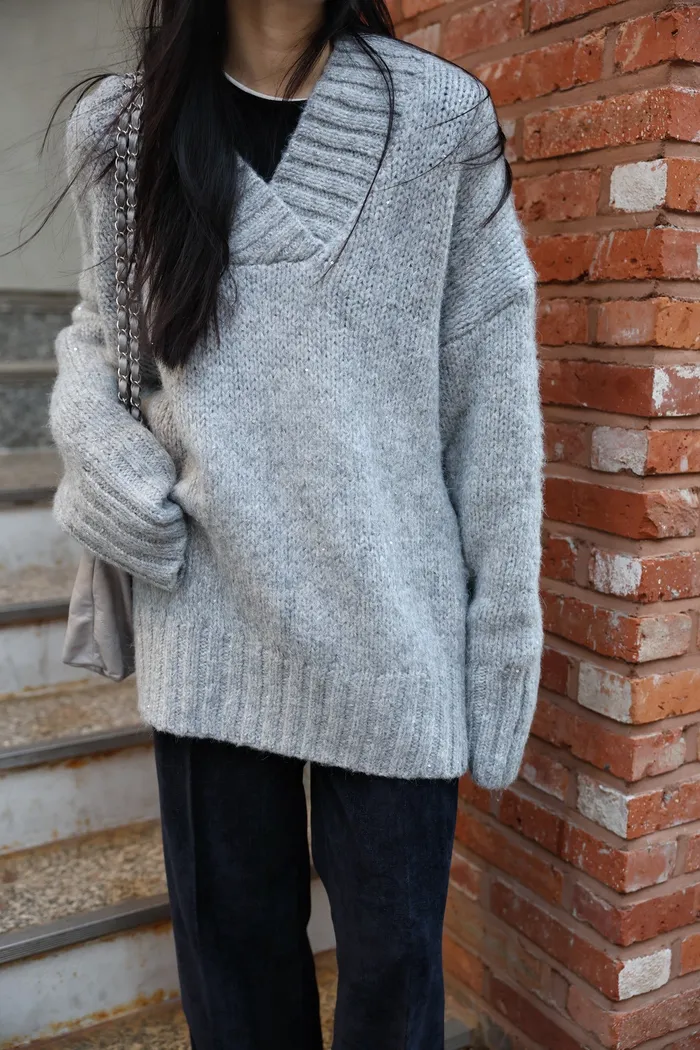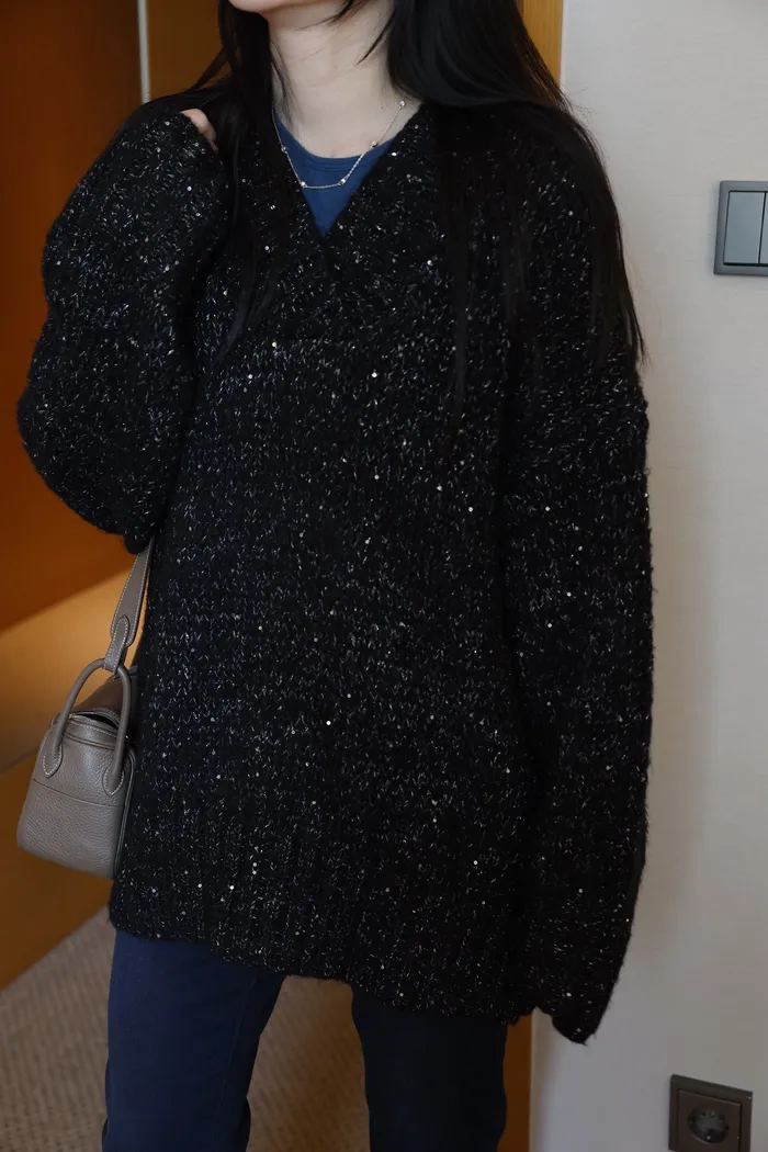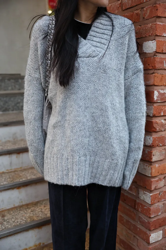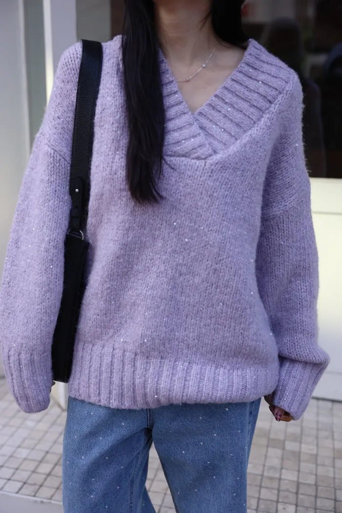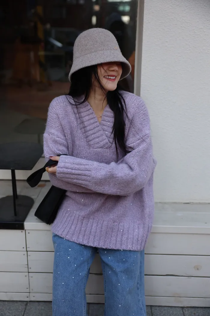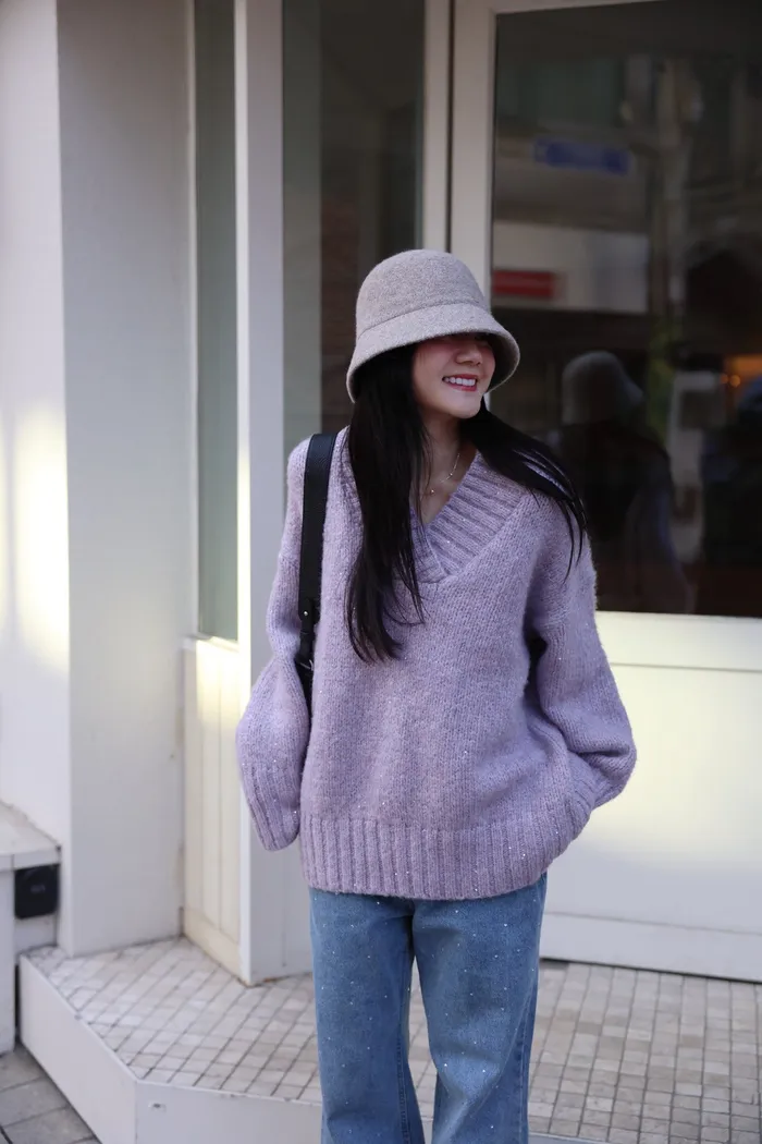JA10 閃亮V領羊毛長版針織上衣(粉紫/灰/墨)