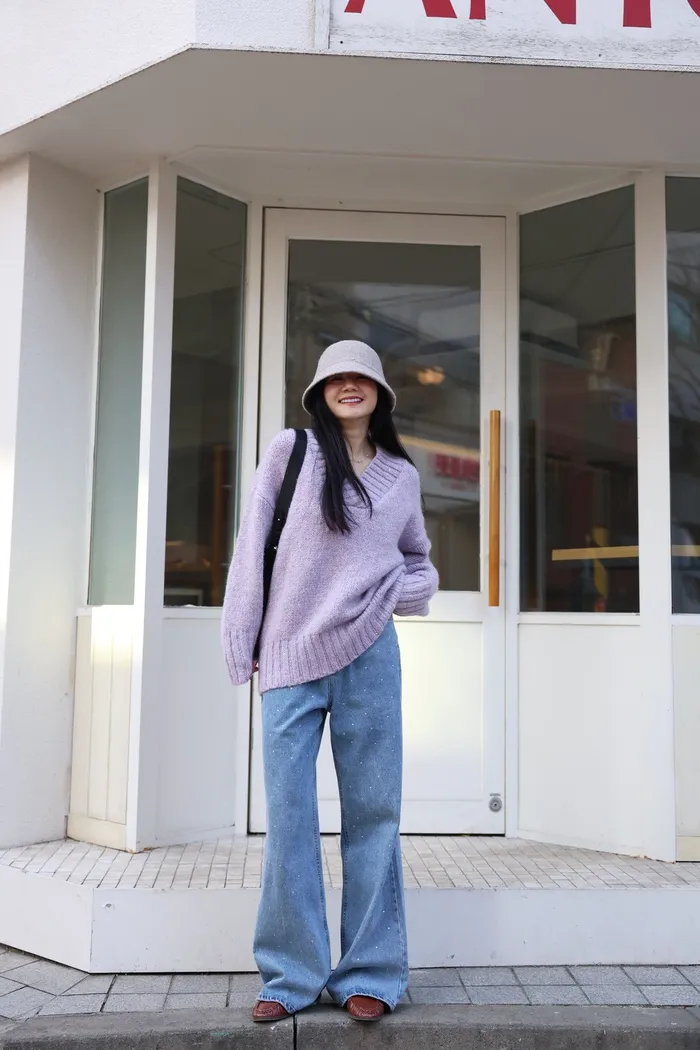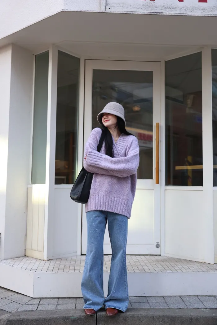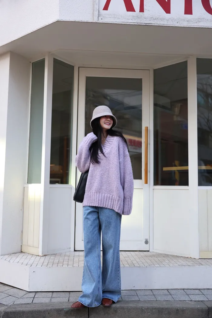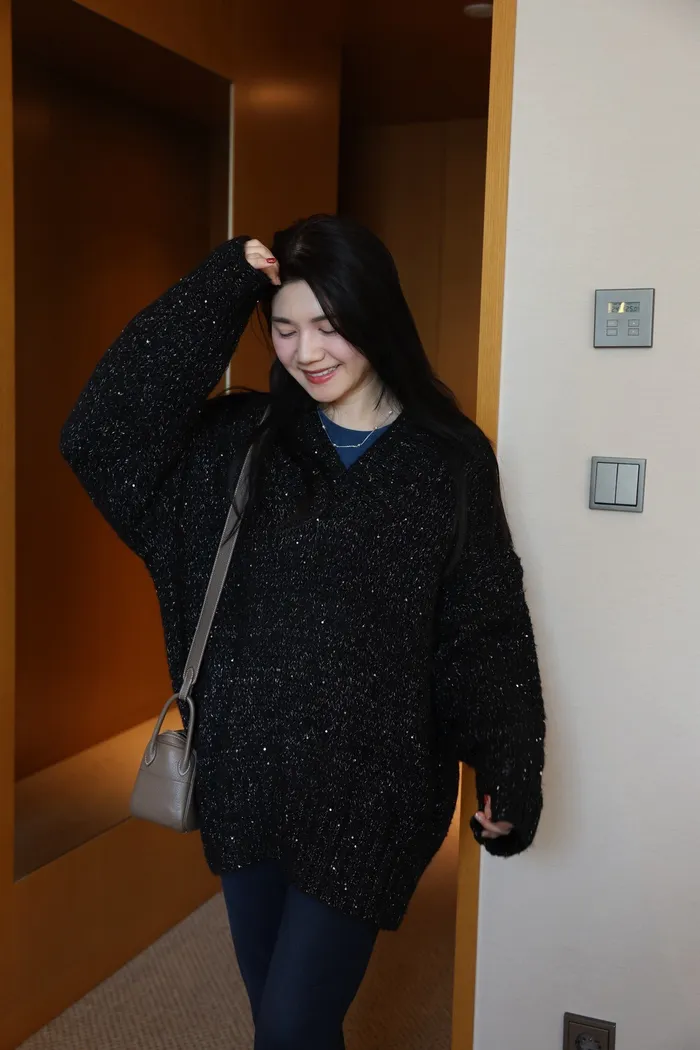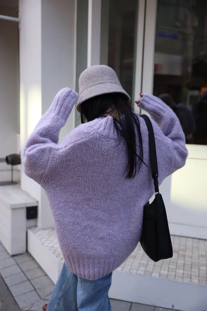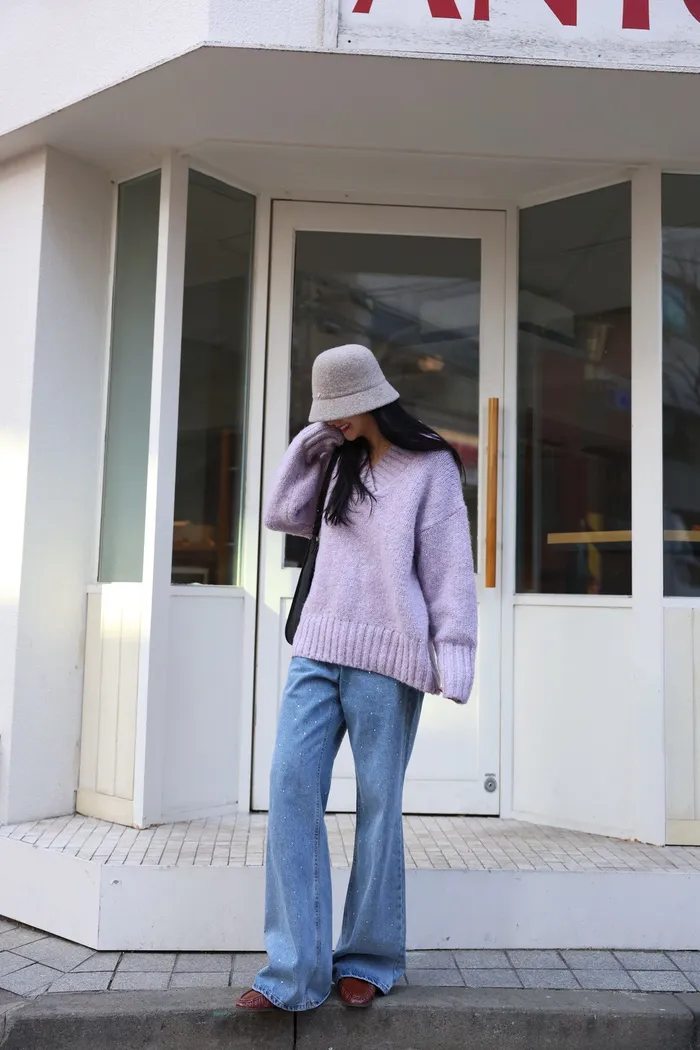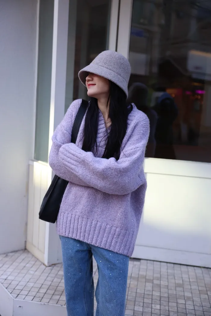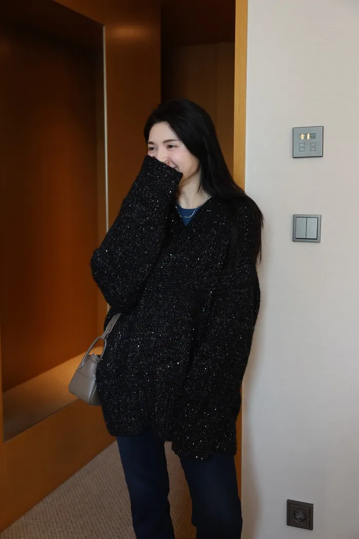 JA10 閃亮V領羊毛長版針織上衣(粉紫/灰/墨)