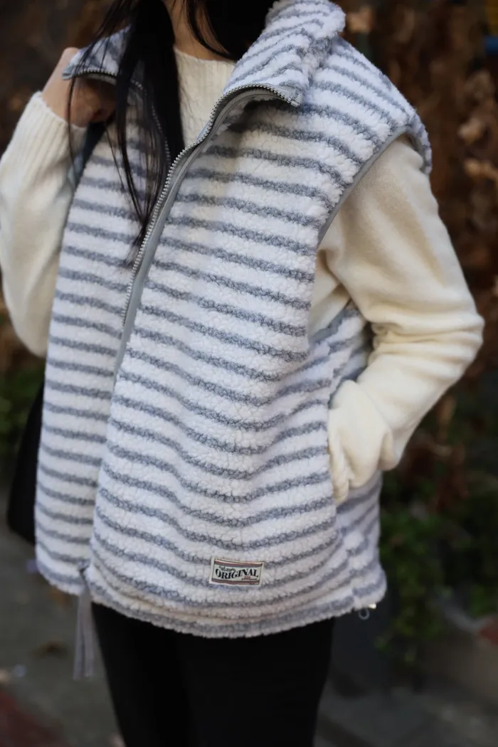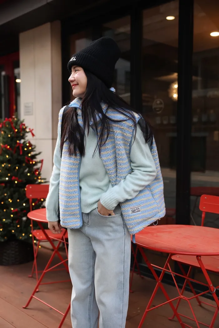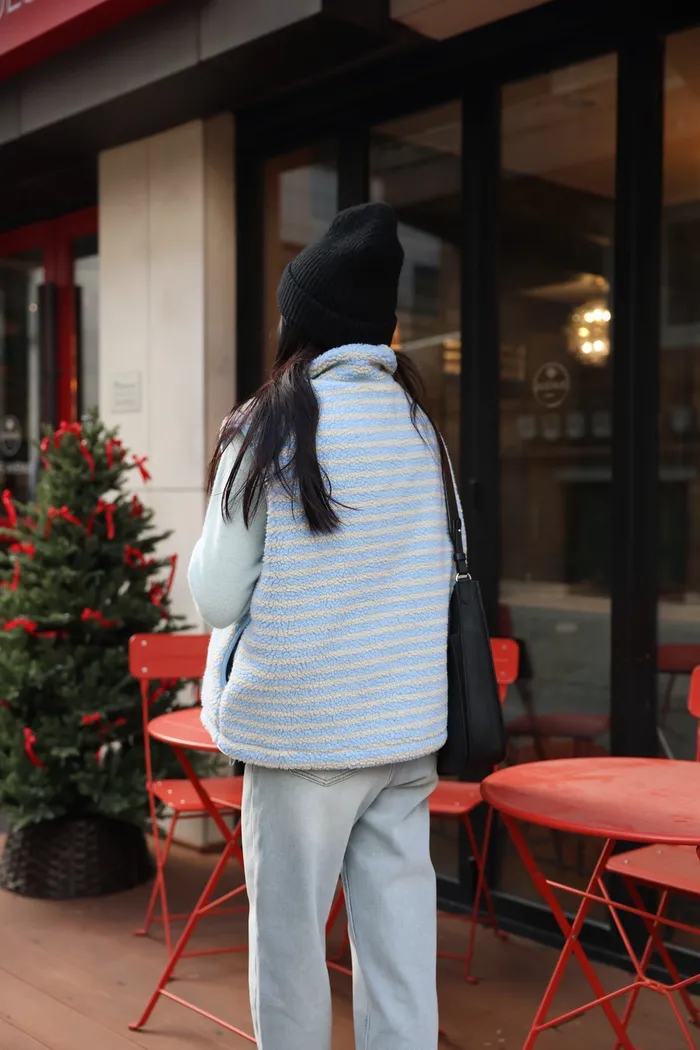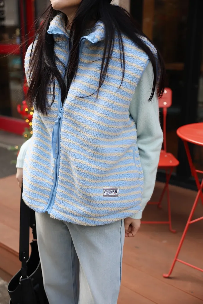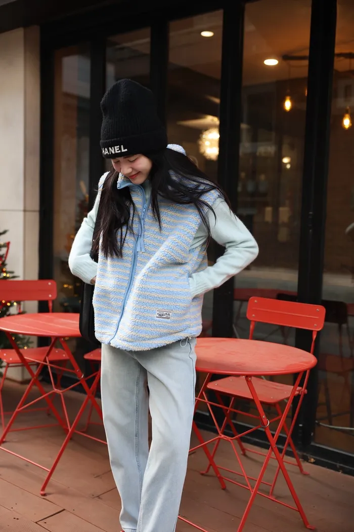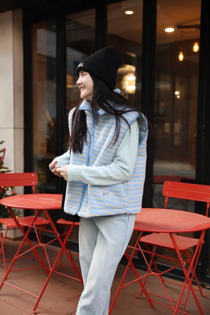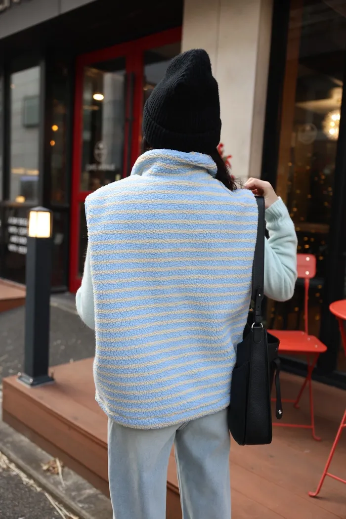 JA33 Q羔毛條紋立領拉鏈背心(灰白條紋/藍杏條紋)