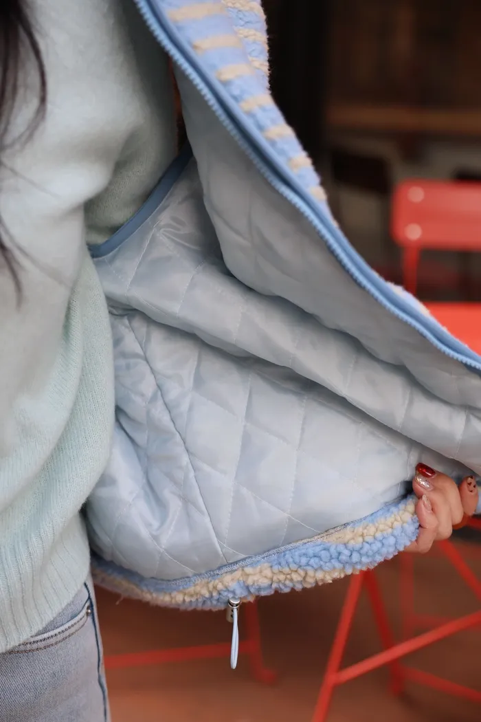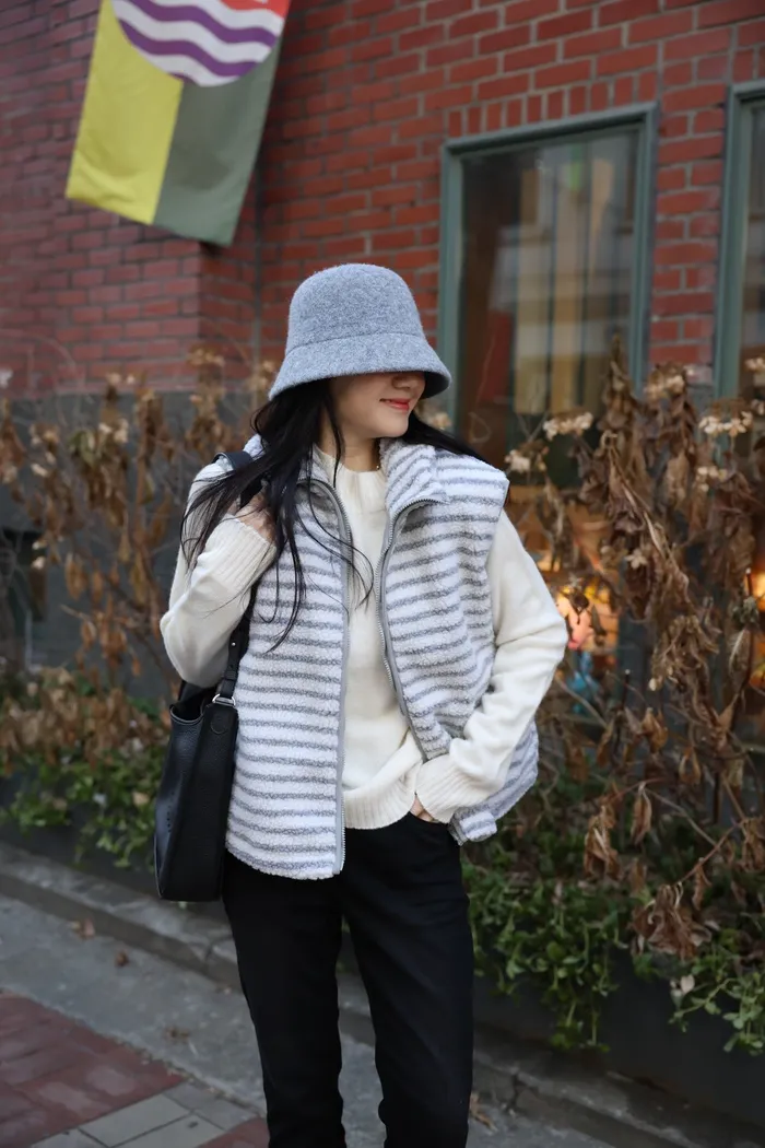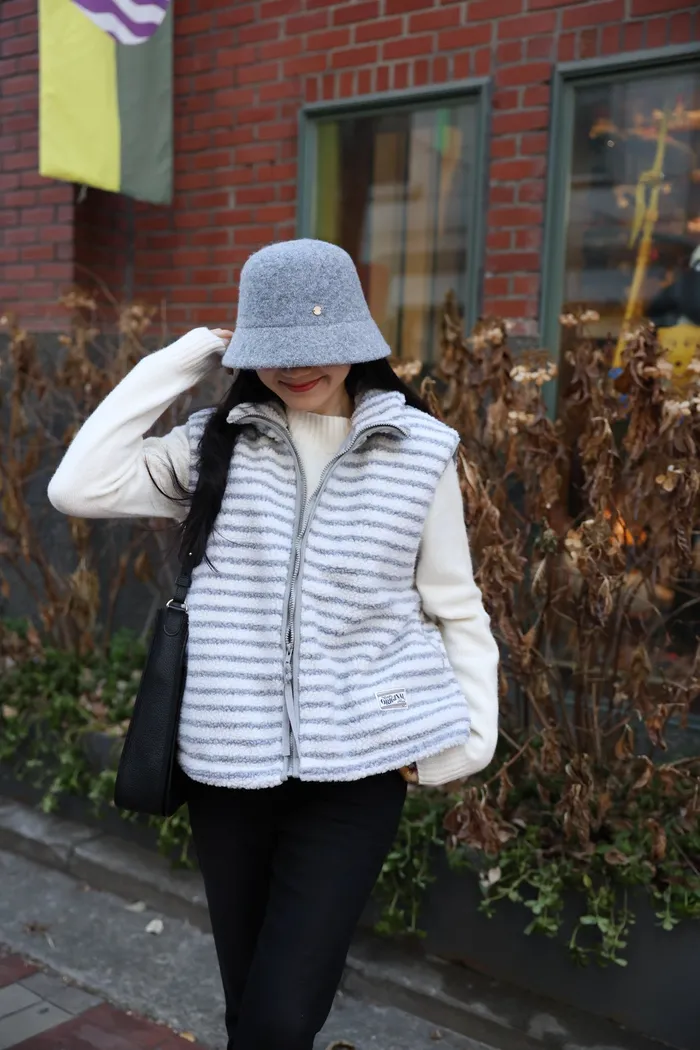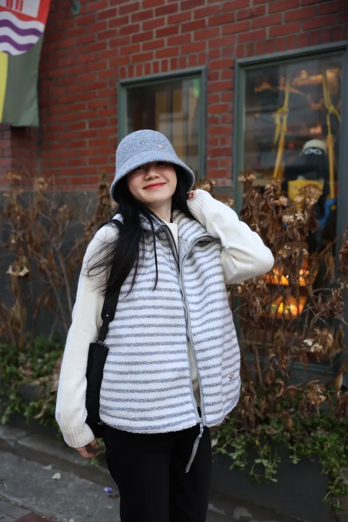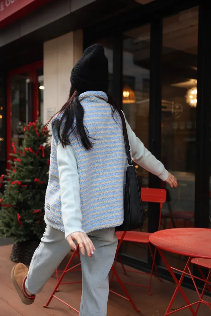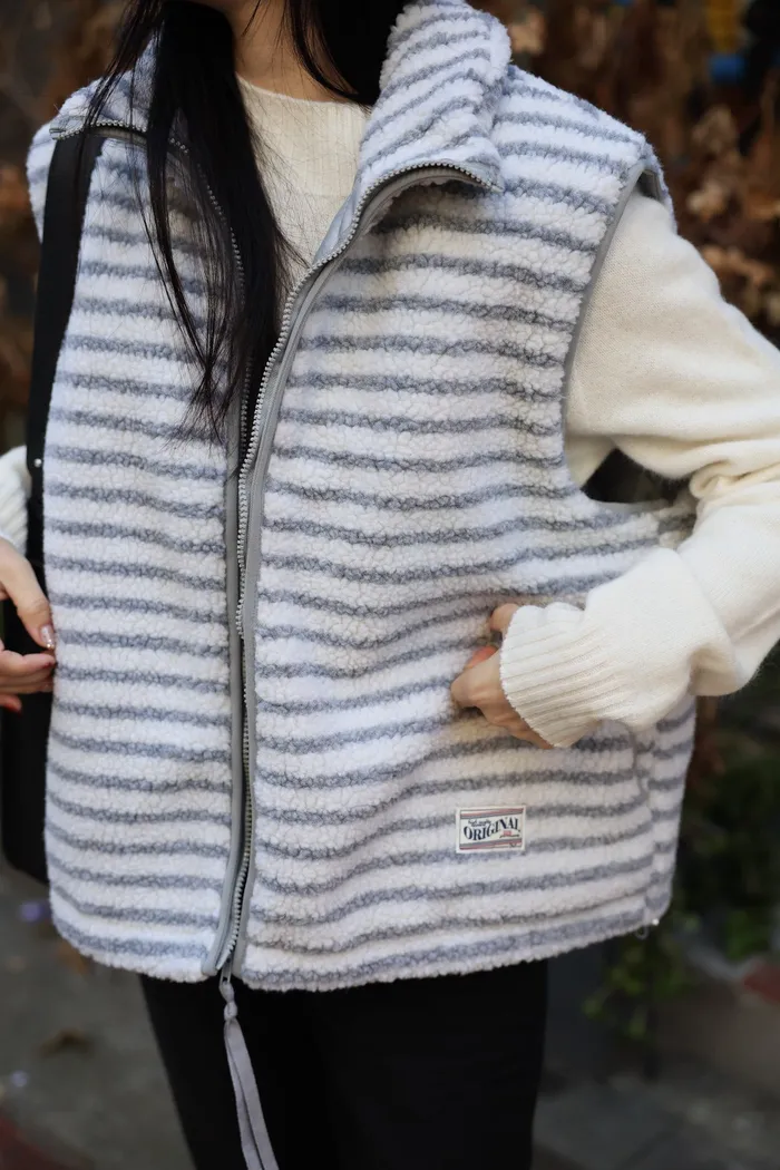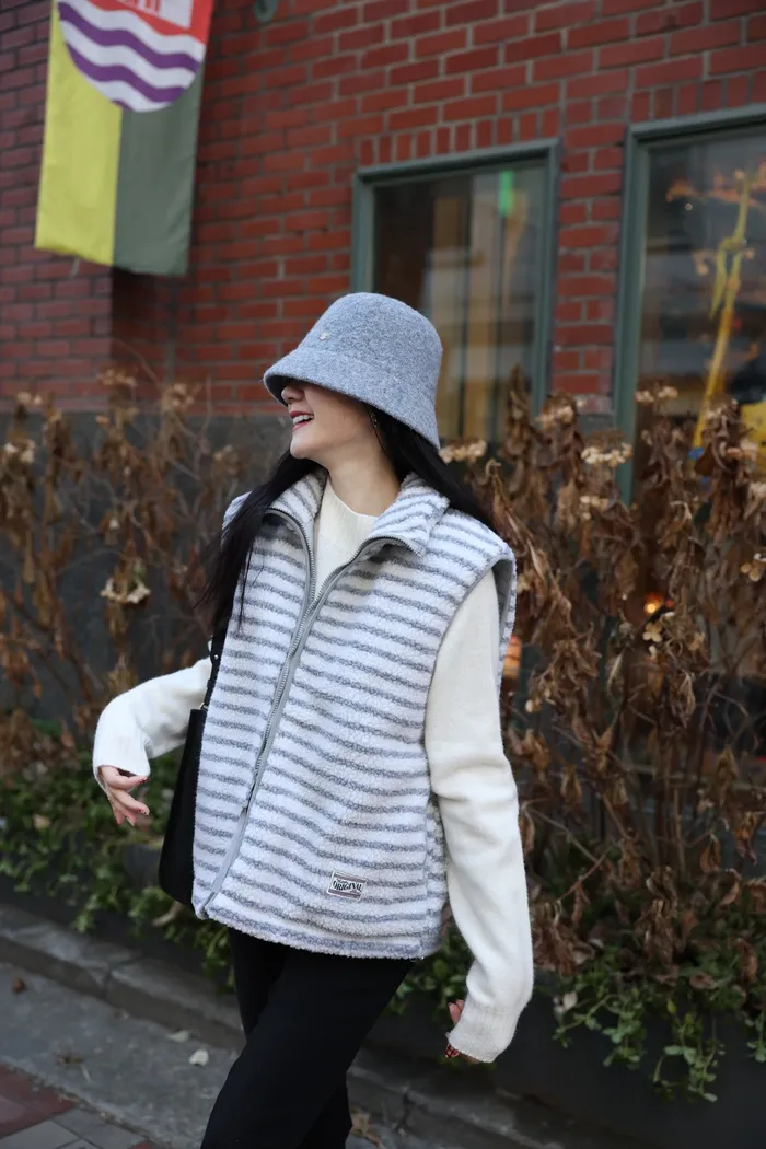 JA33 Q羔毛條紋立領拉鏈背心(灰白條紋/藍杏條紋)