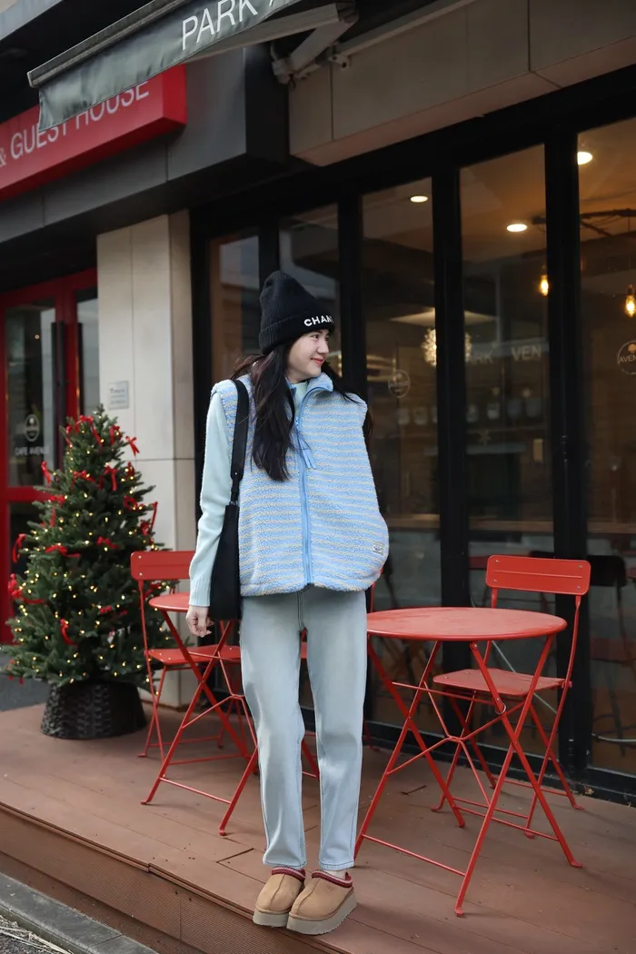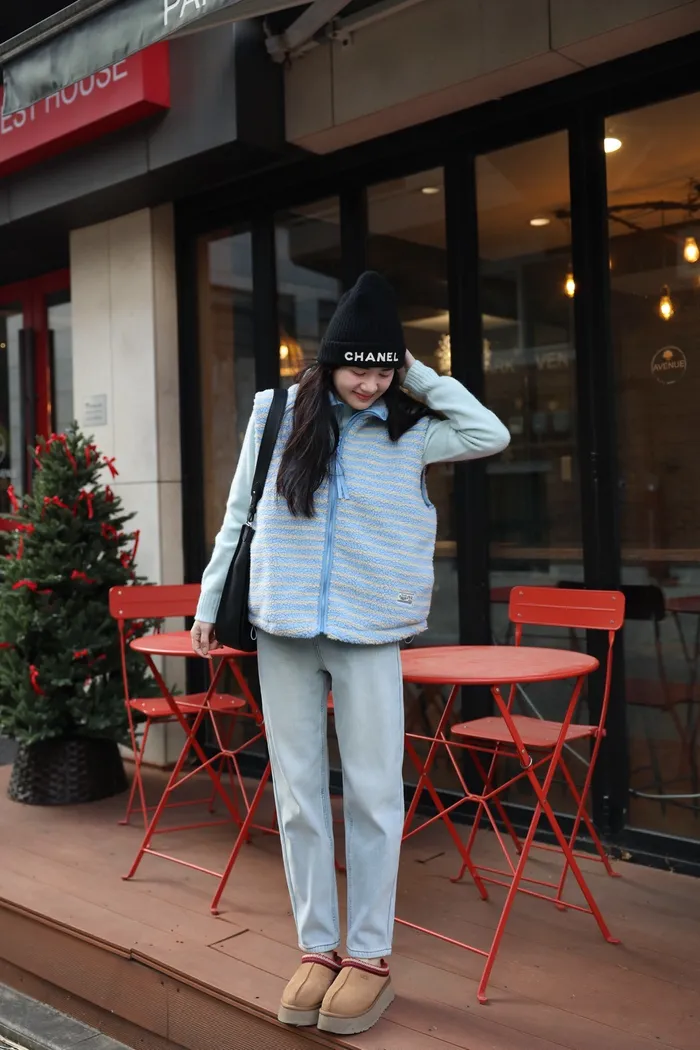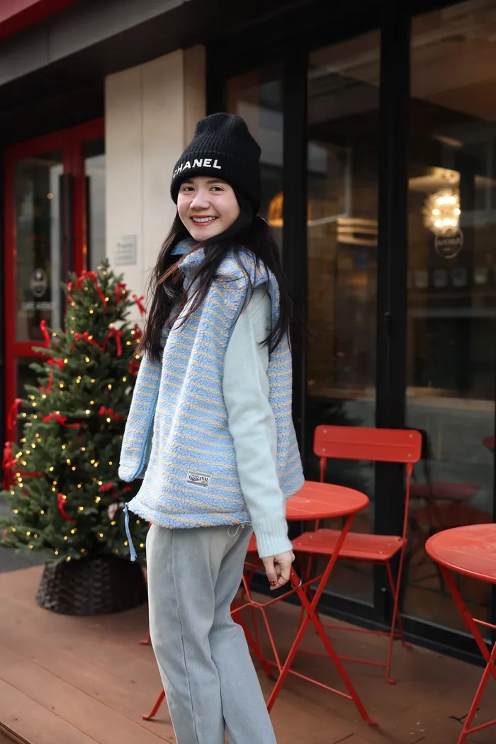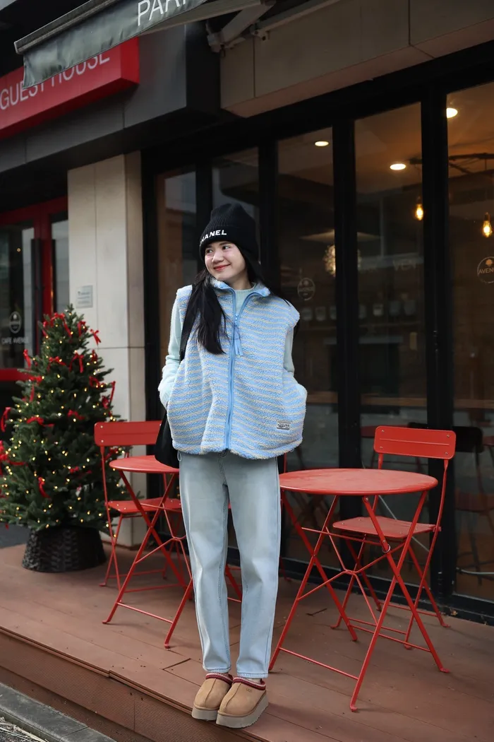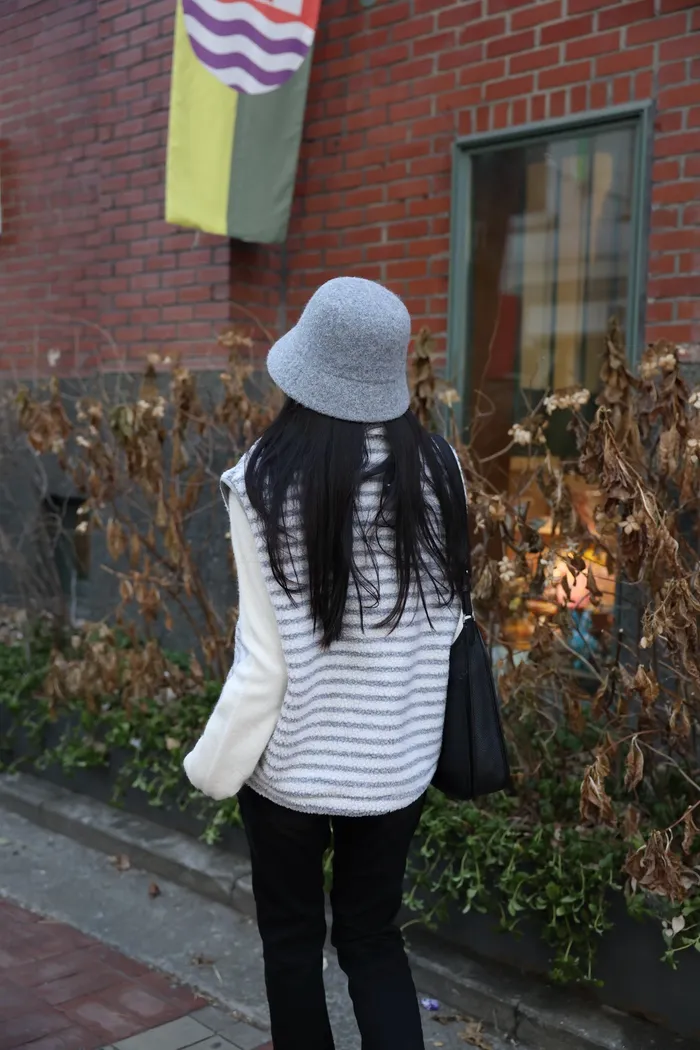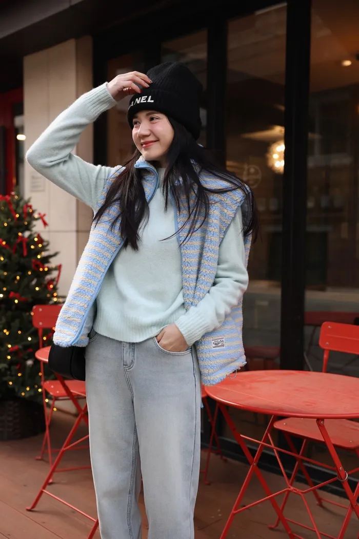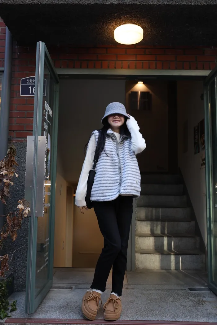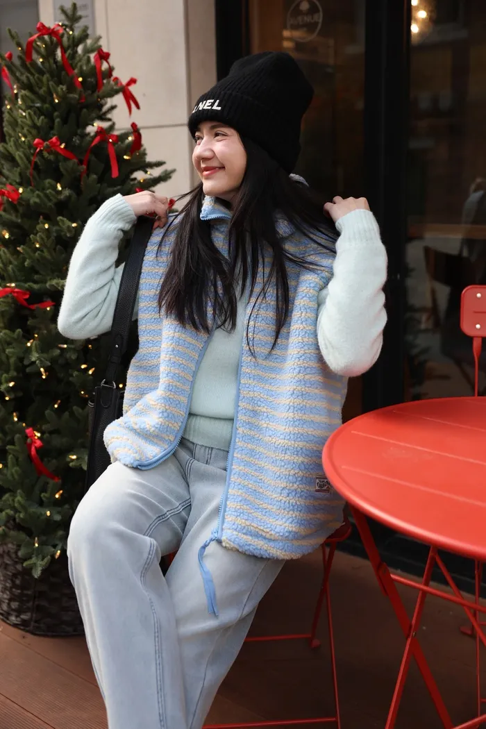 JA33 Q羔毛條紋立領拉鏈背心(灰白條紋/藍杏條紋)