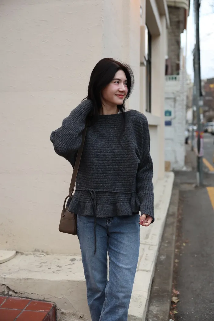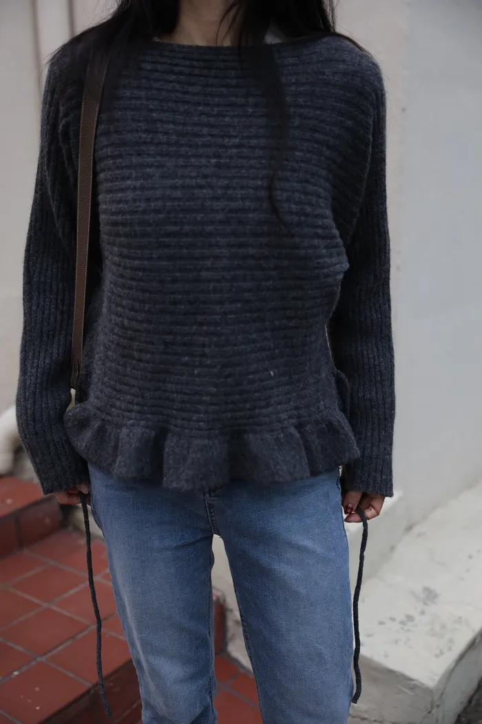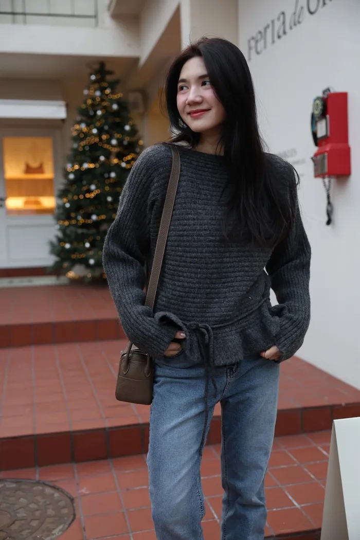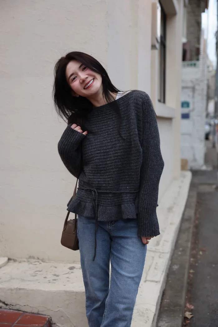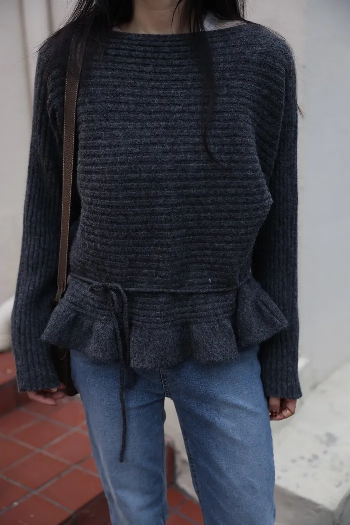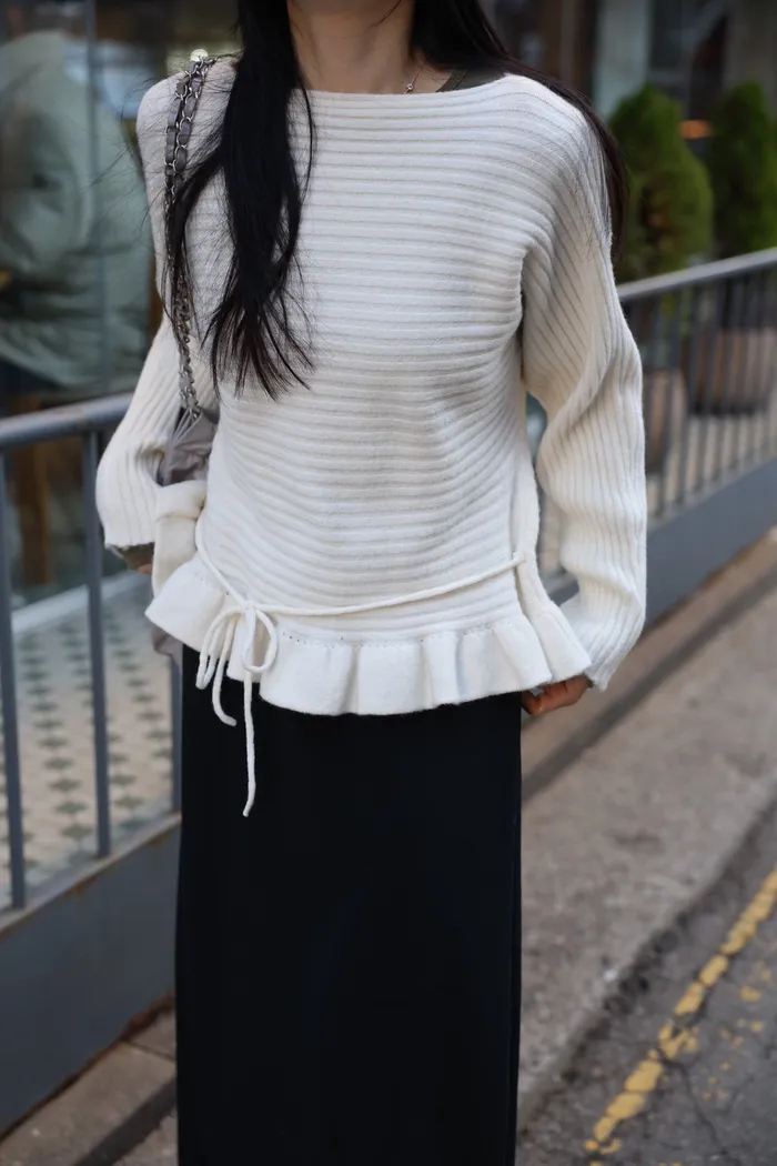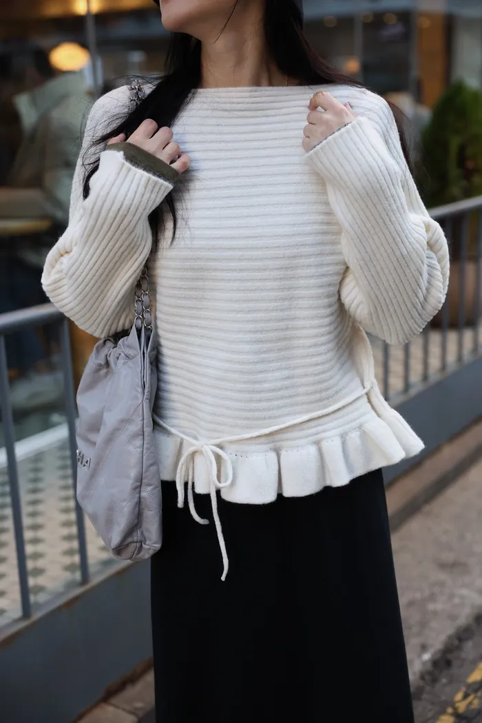 JA35 一字領下擺造型荷葉綁帶針織上衣(灰/米白/紅)