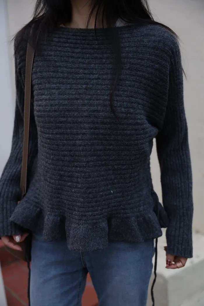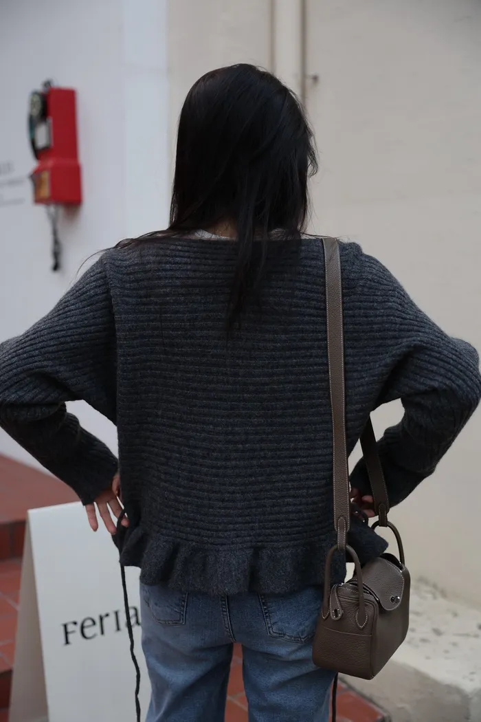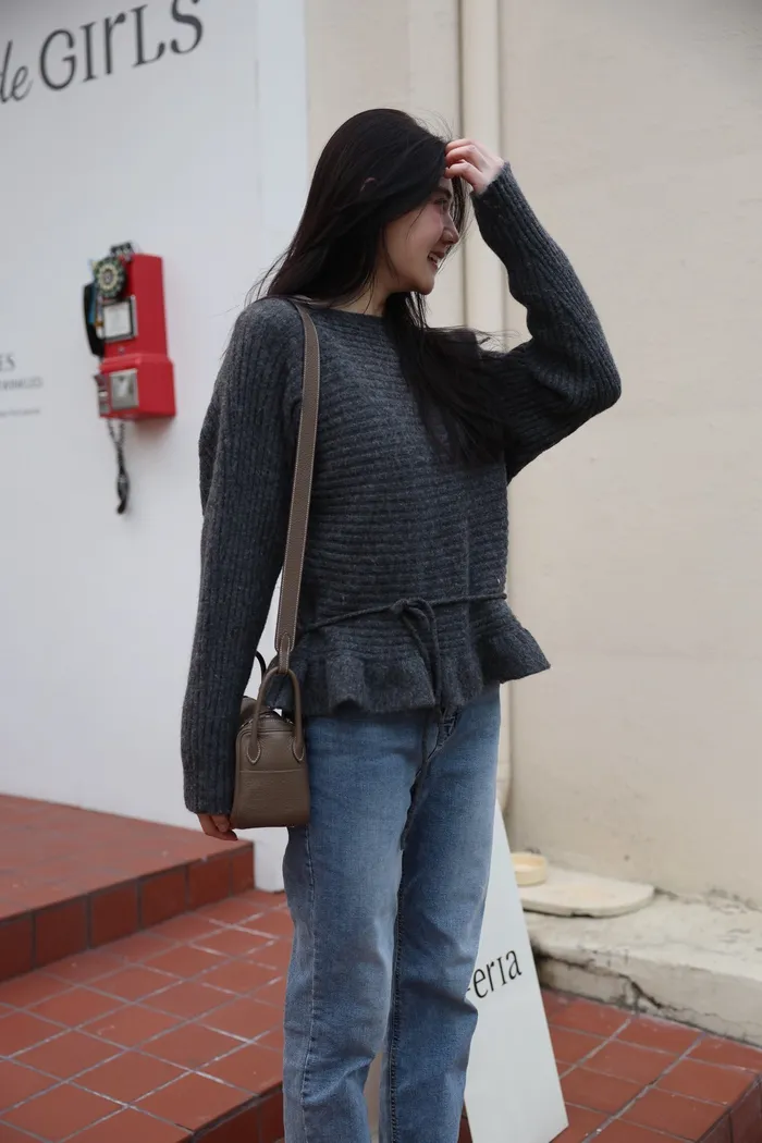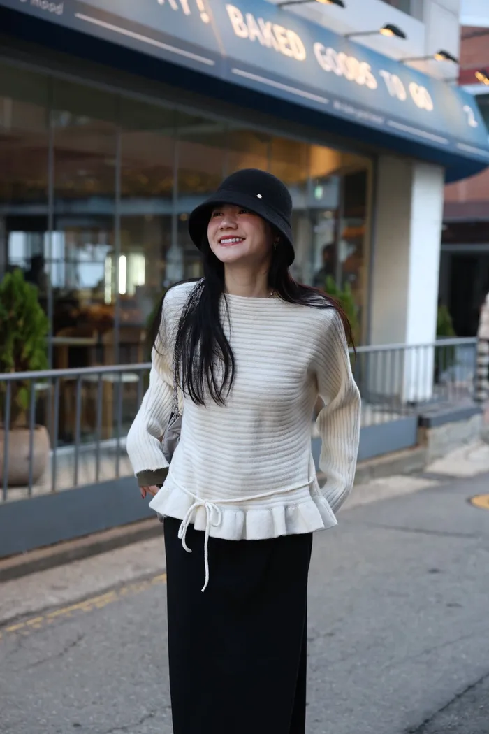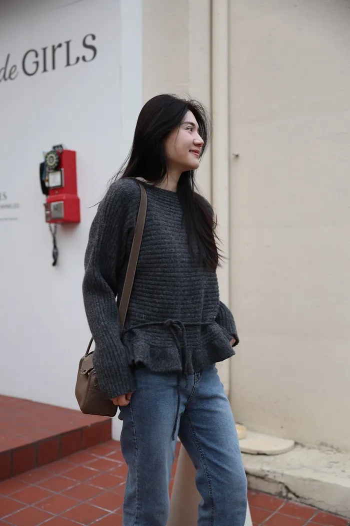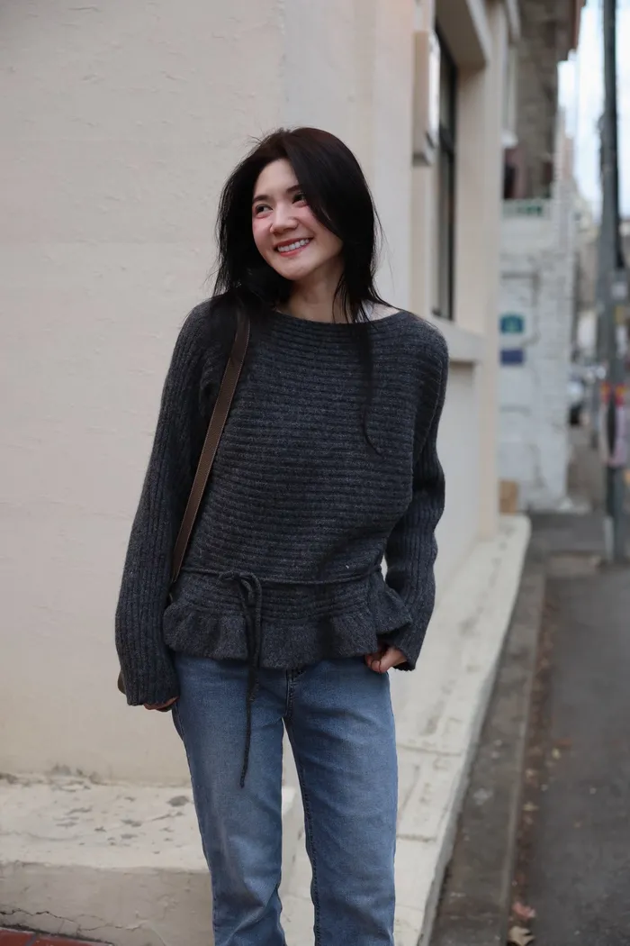 JA35 一字領下擺造型荷葉綁帶針織上衣(灰/米白/紅)