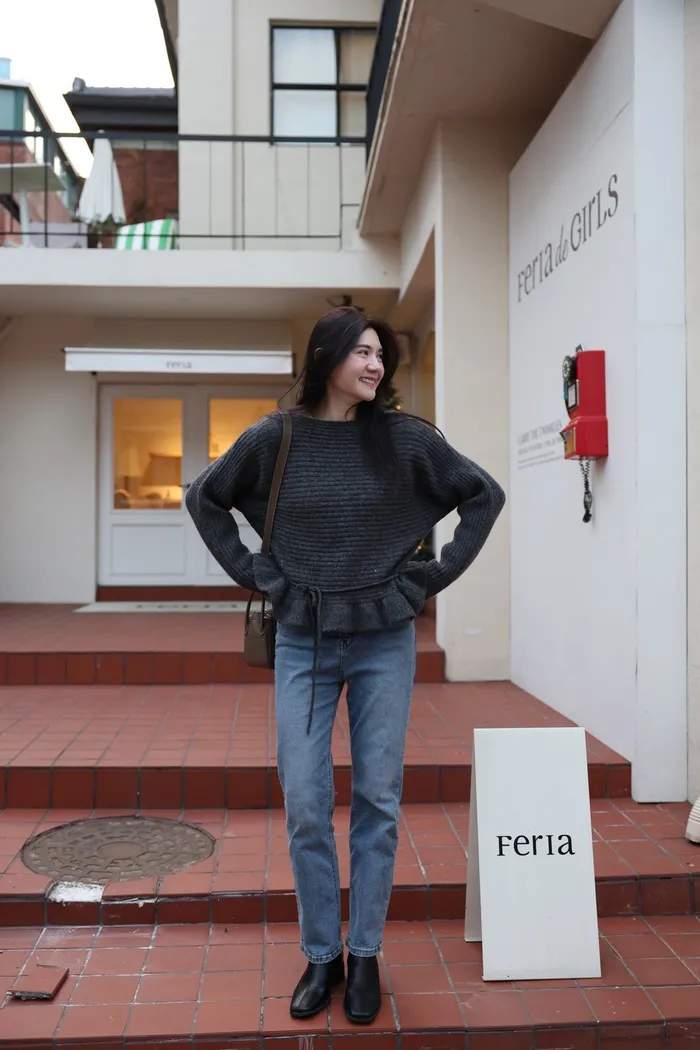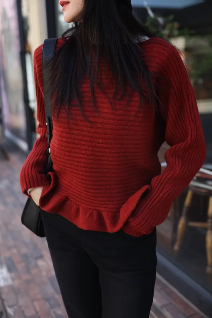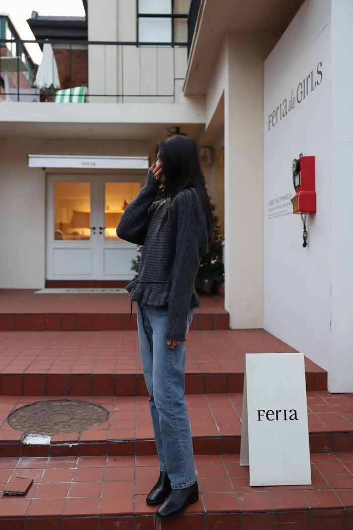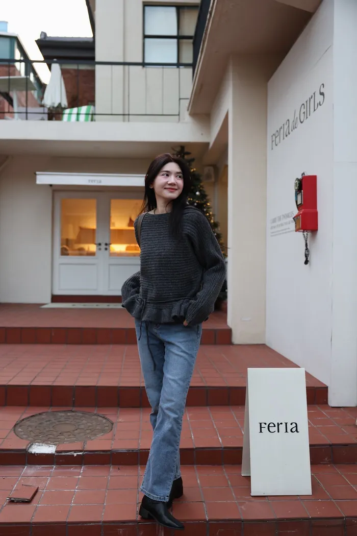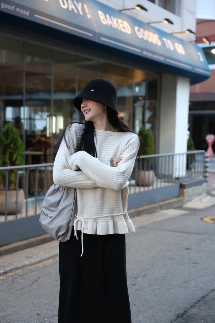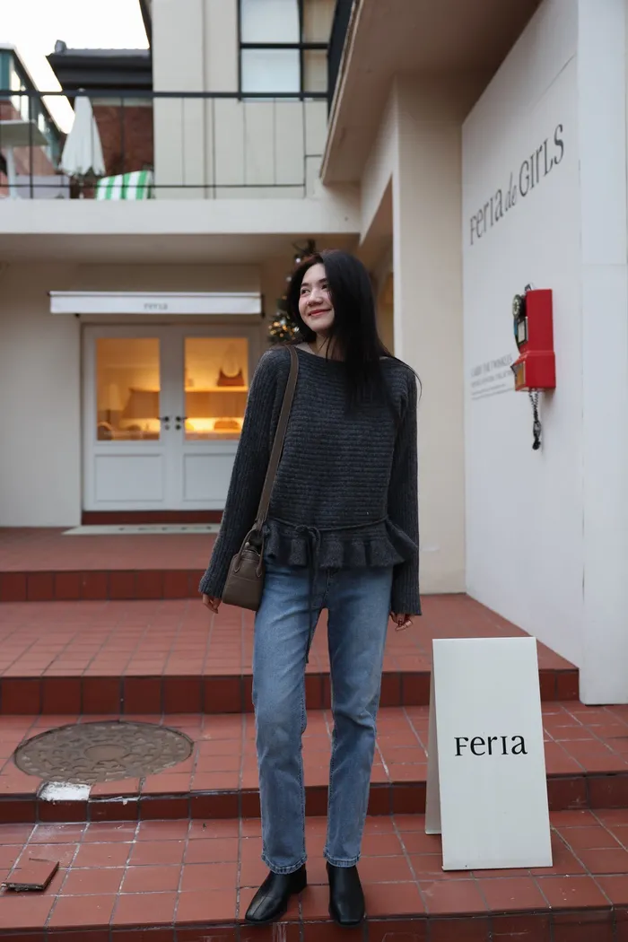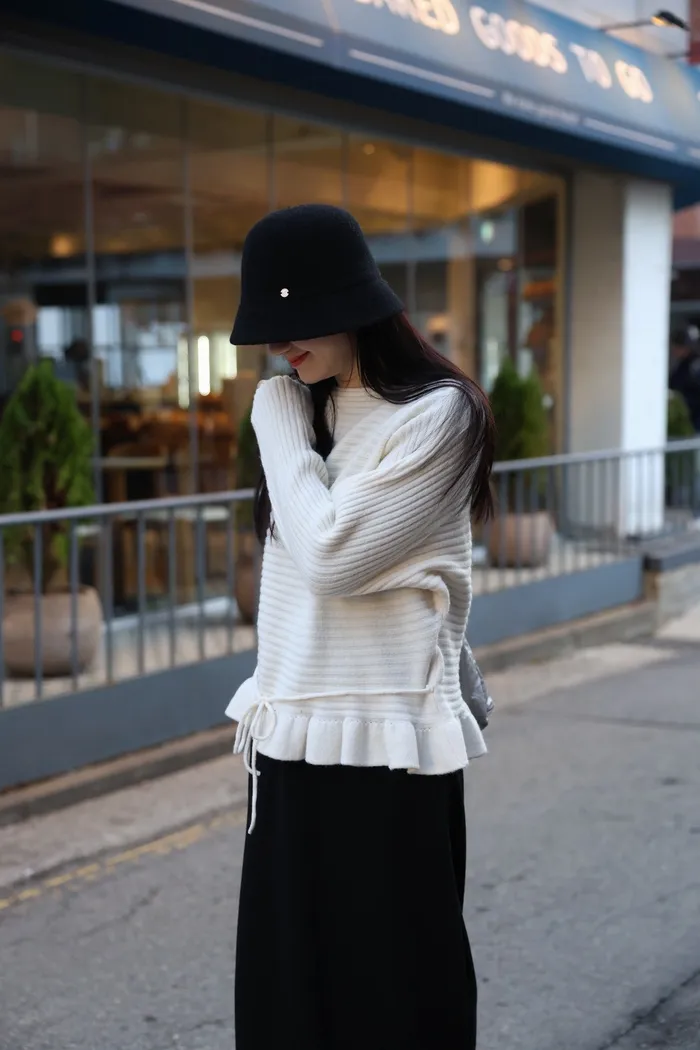 JA35 一字領下擺造型荷葉綁帶針織上衣(灰/米白/紅)