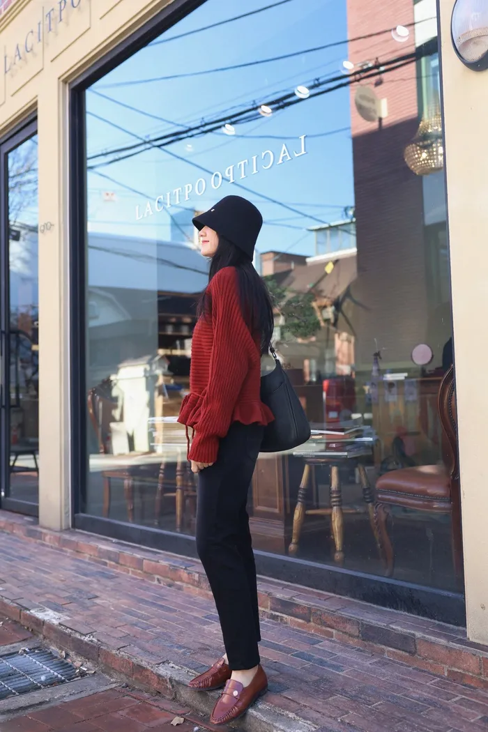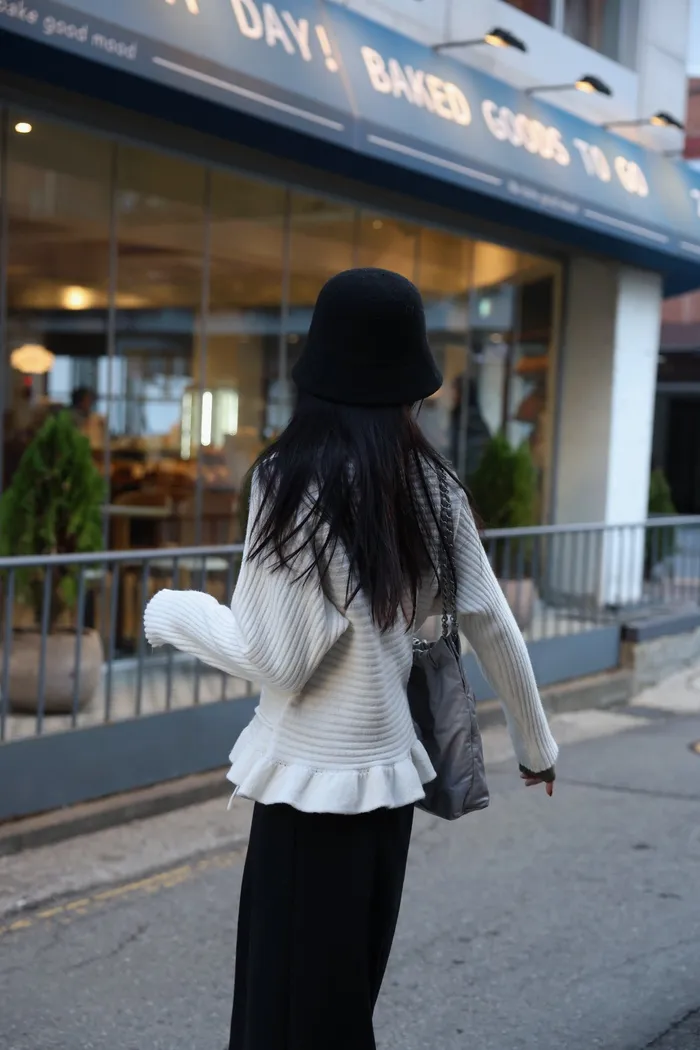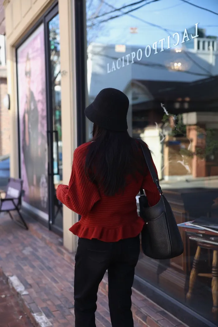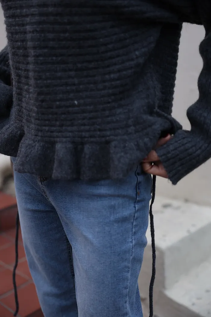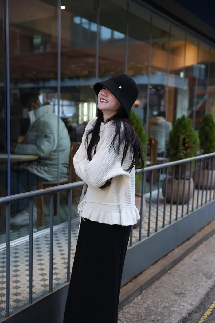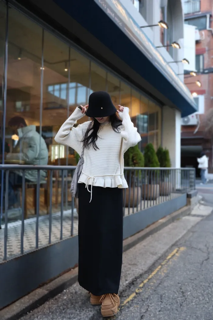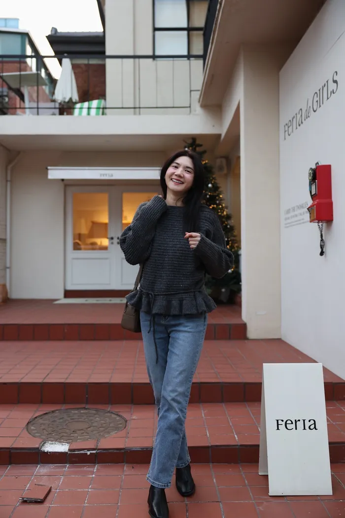 JA35 一字領下擺造型荷葉綁帶針織上衣(灰/米白/紅)