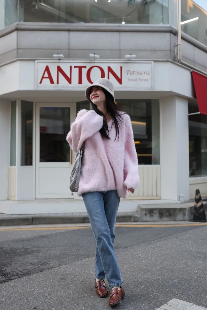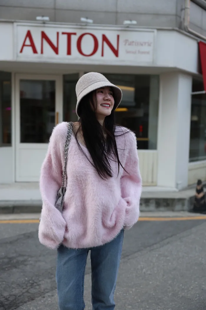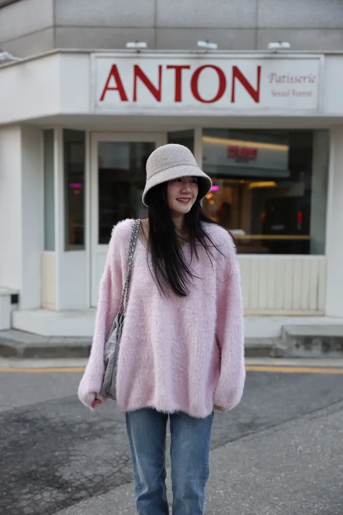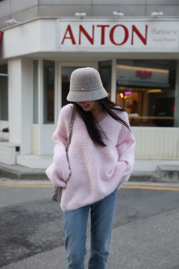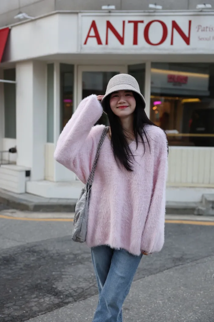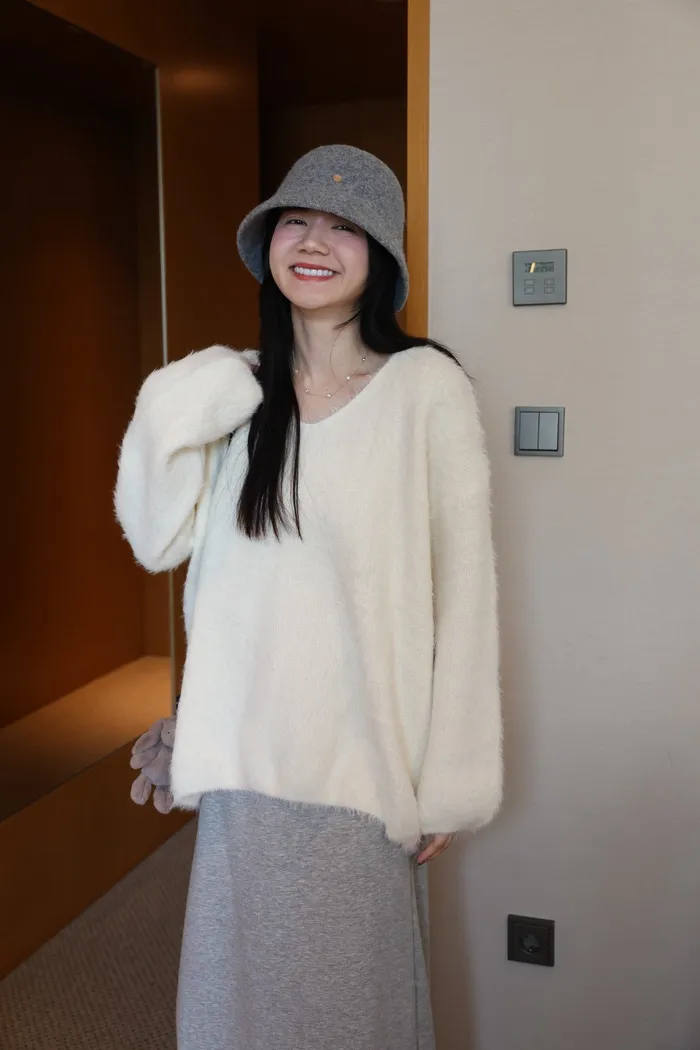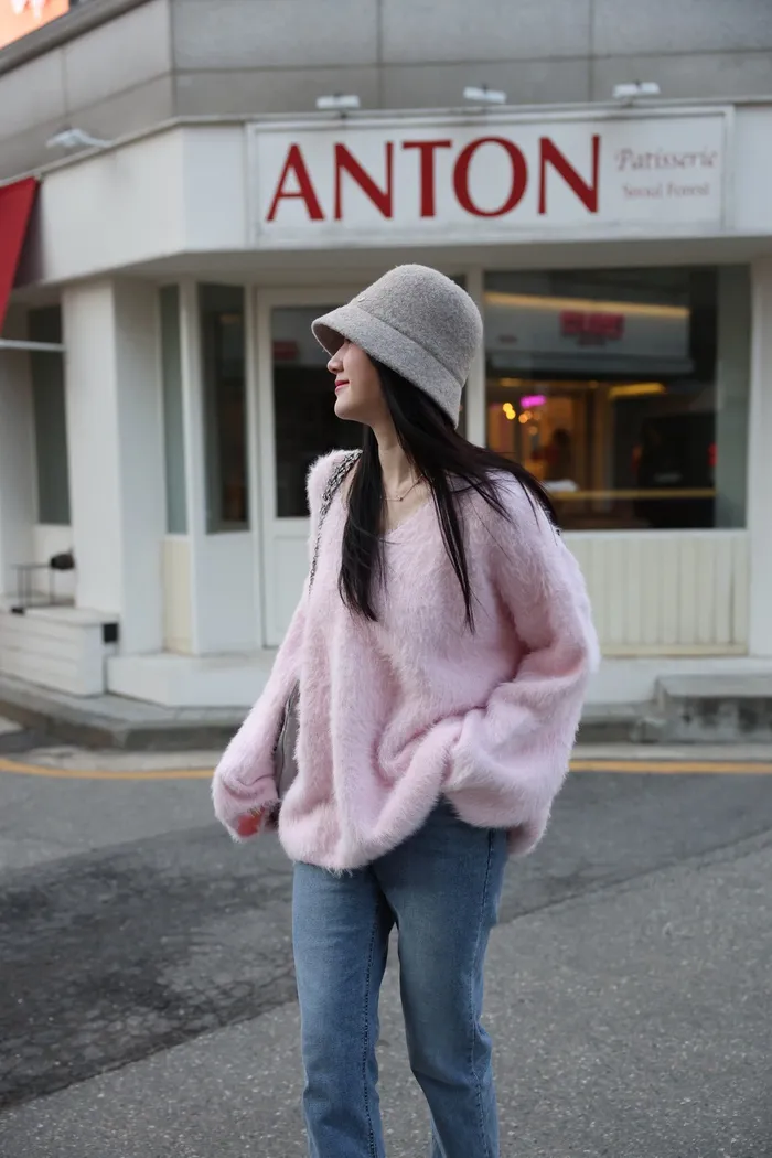 JA37 溫柔系大V領慵懶針織上衣(米白/粉/墨)