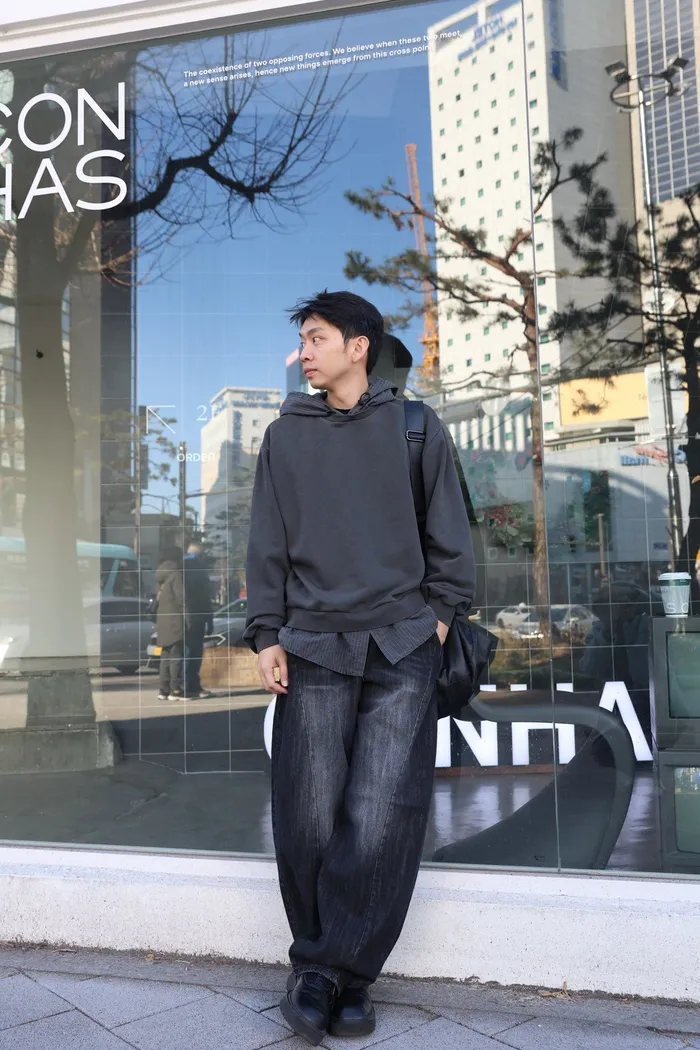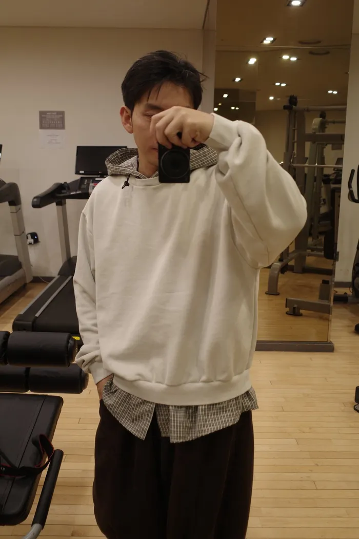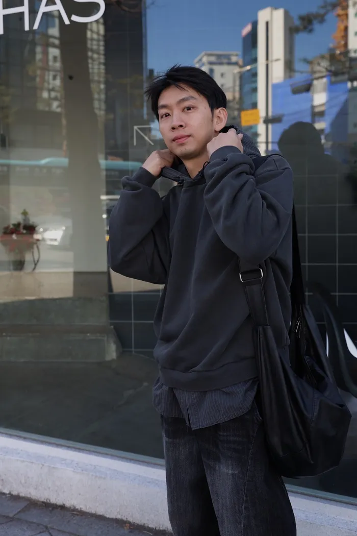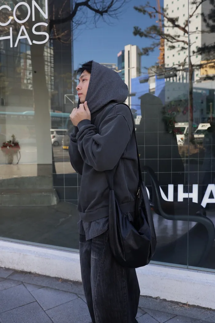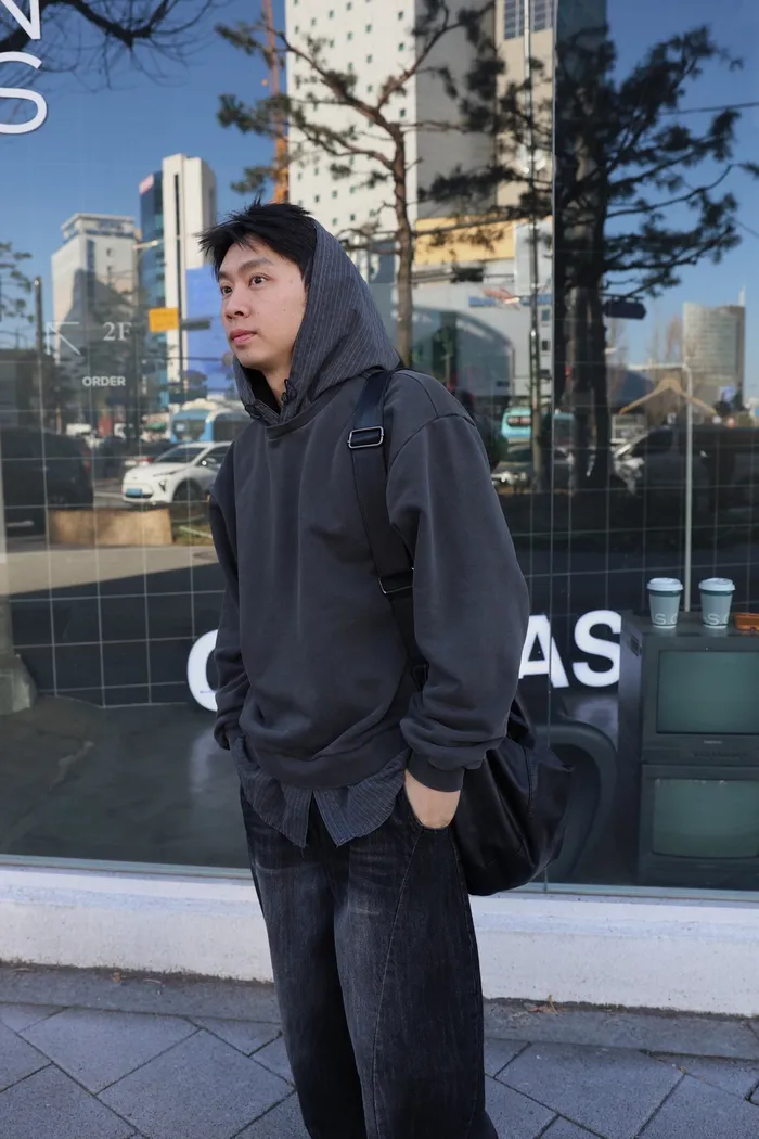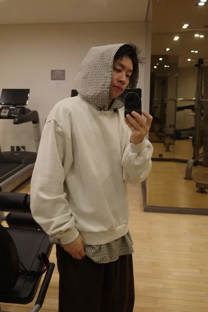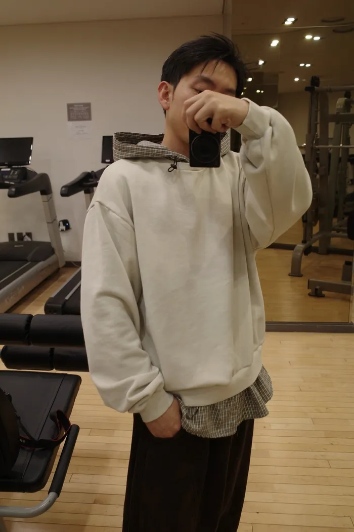 JA44 男裝!設計感異材質假兩件連帽大學T(杏/墨)