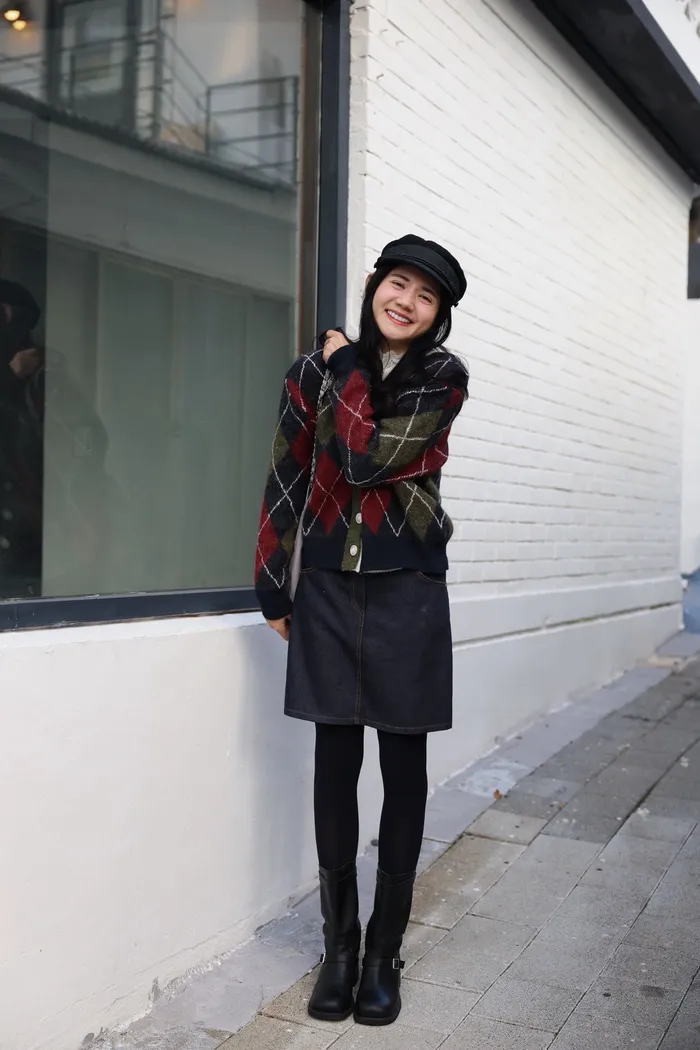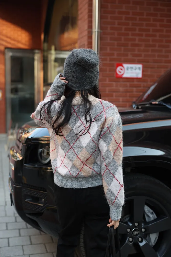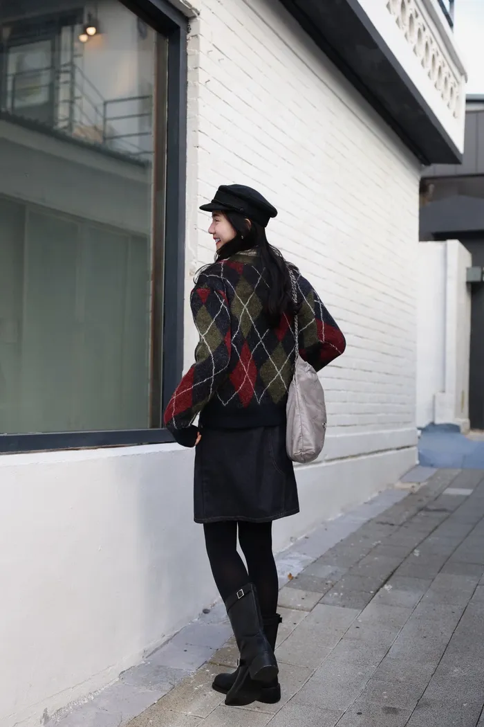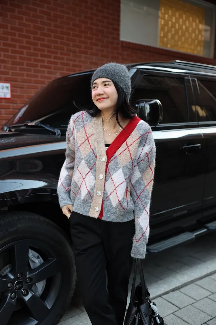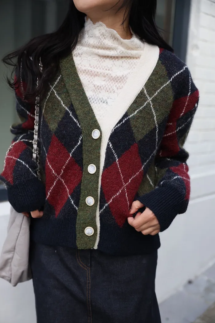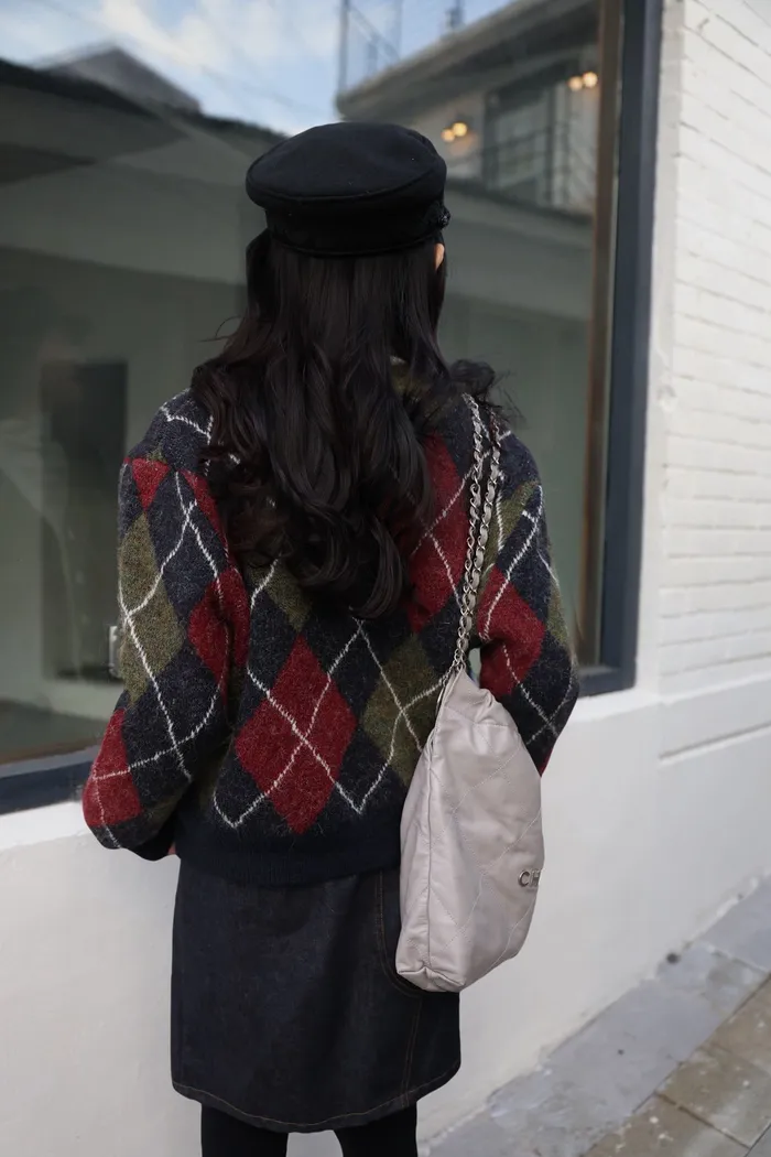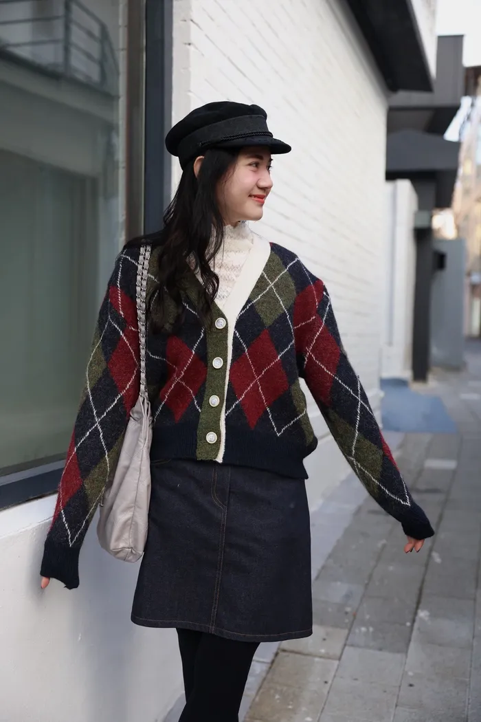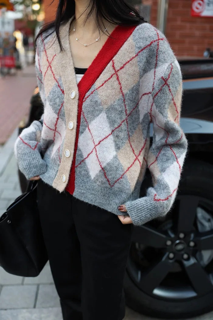NV03 菱格紋開襟撞色針織外罩衫(紅灰/綠藍)