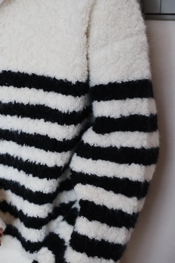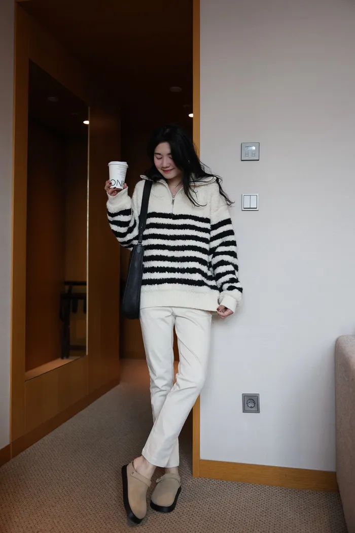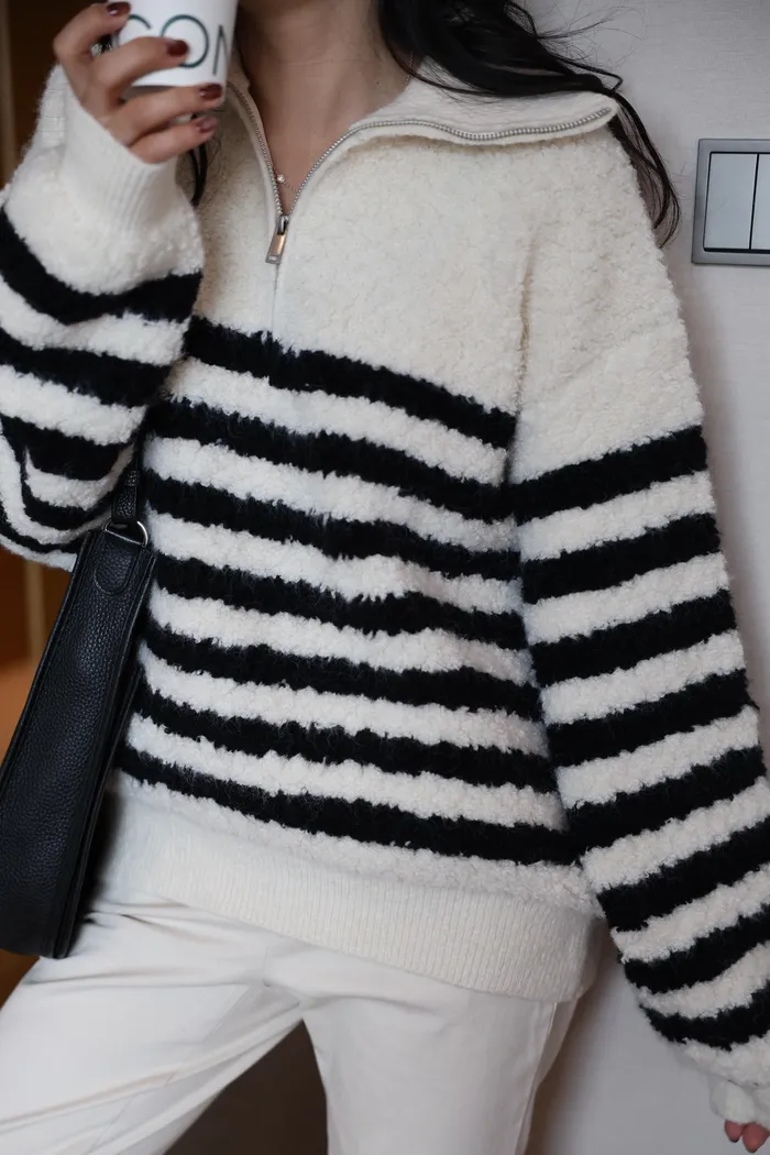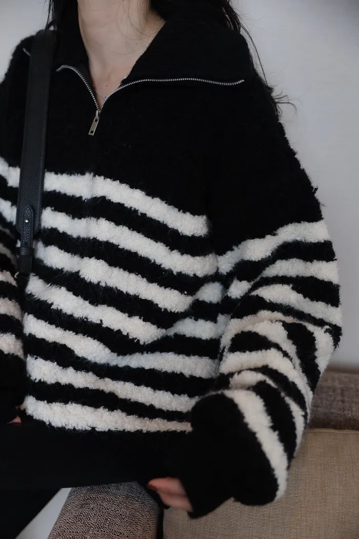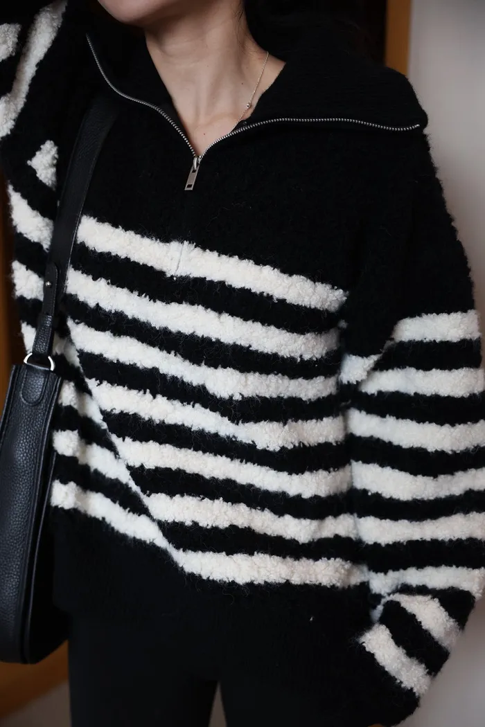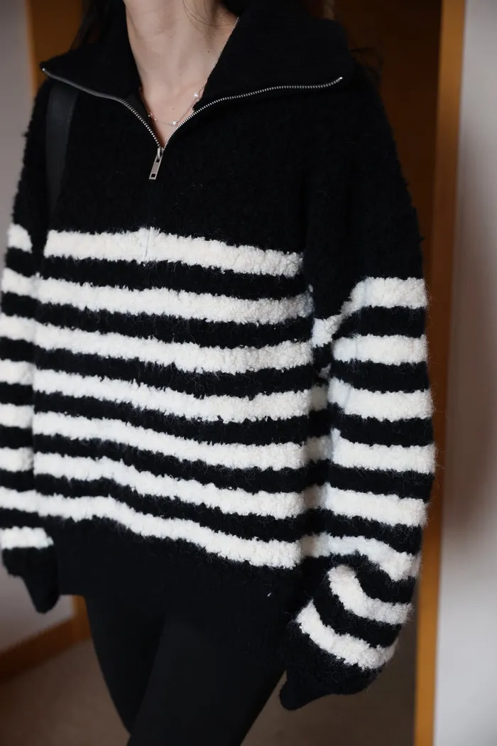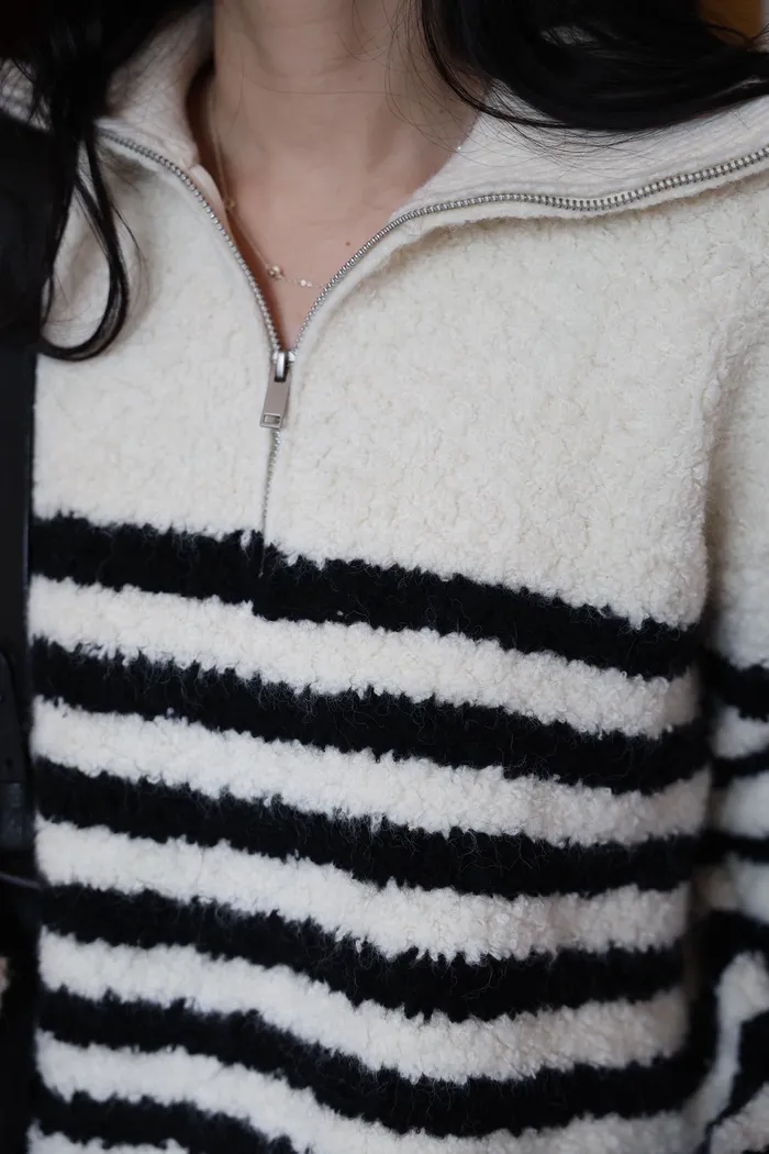 NV09 QQ毛翻領拉鏈條紋毛衣(白/黑)