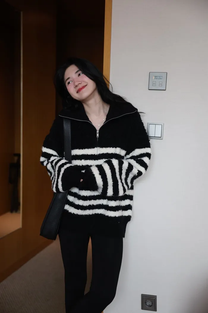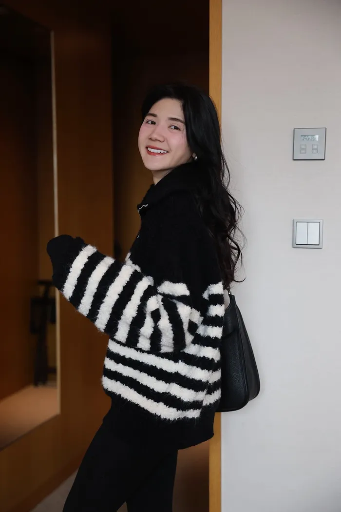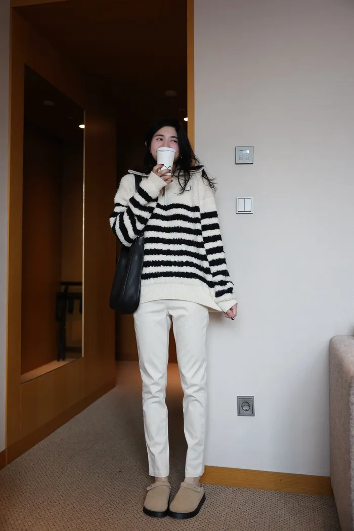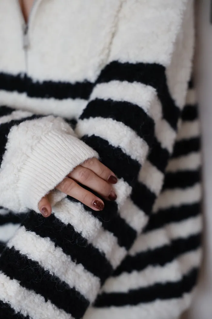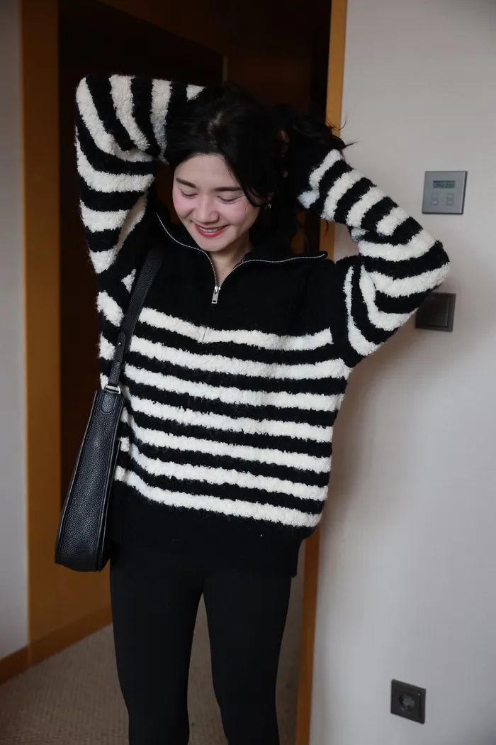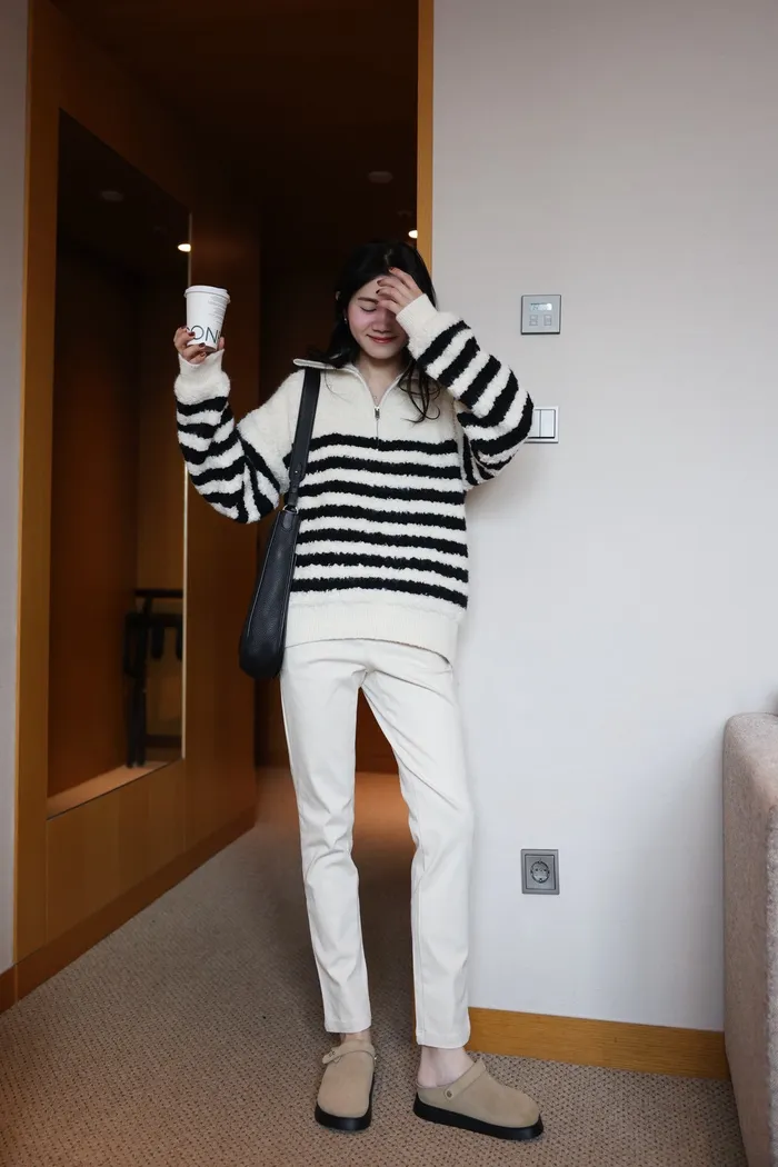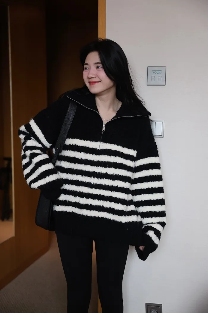 NV09 QQ毛翻領拉鏈條紋毛衣(白/黑)