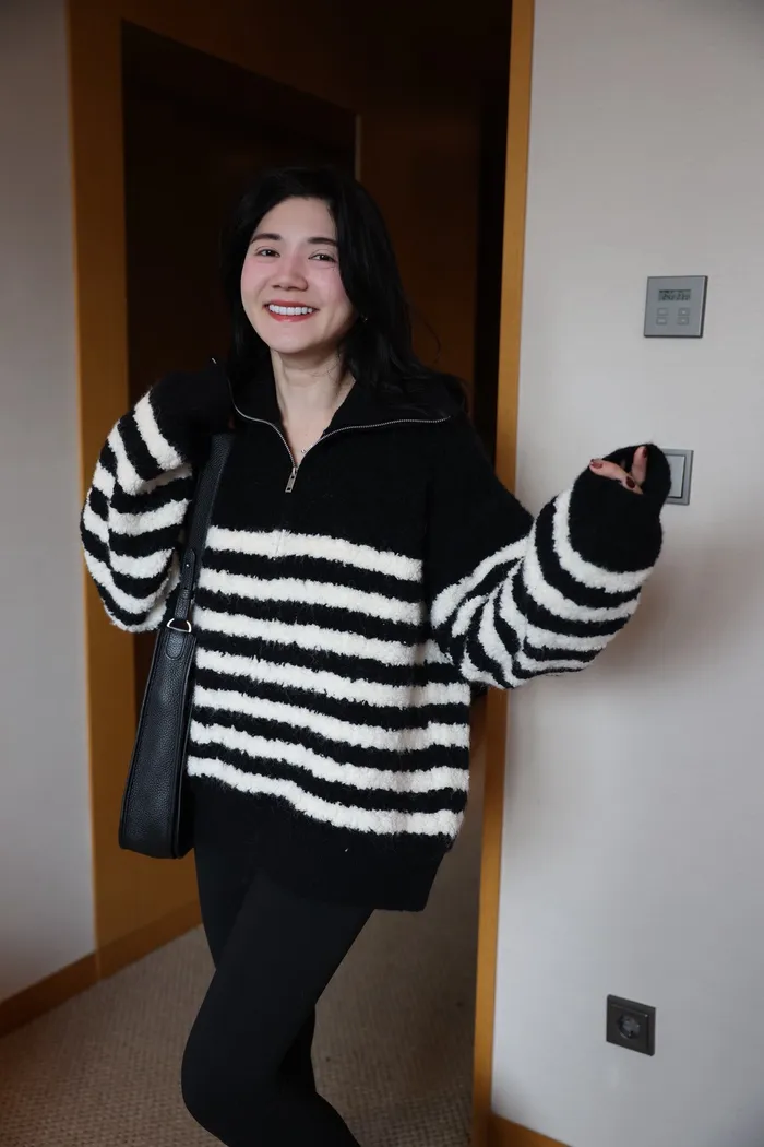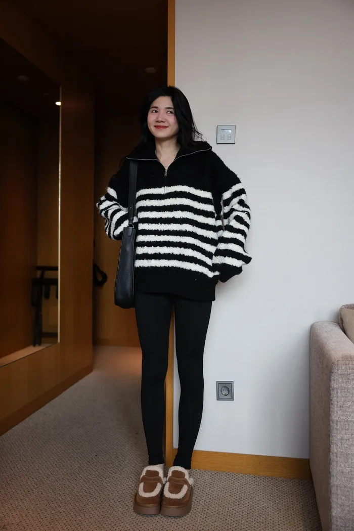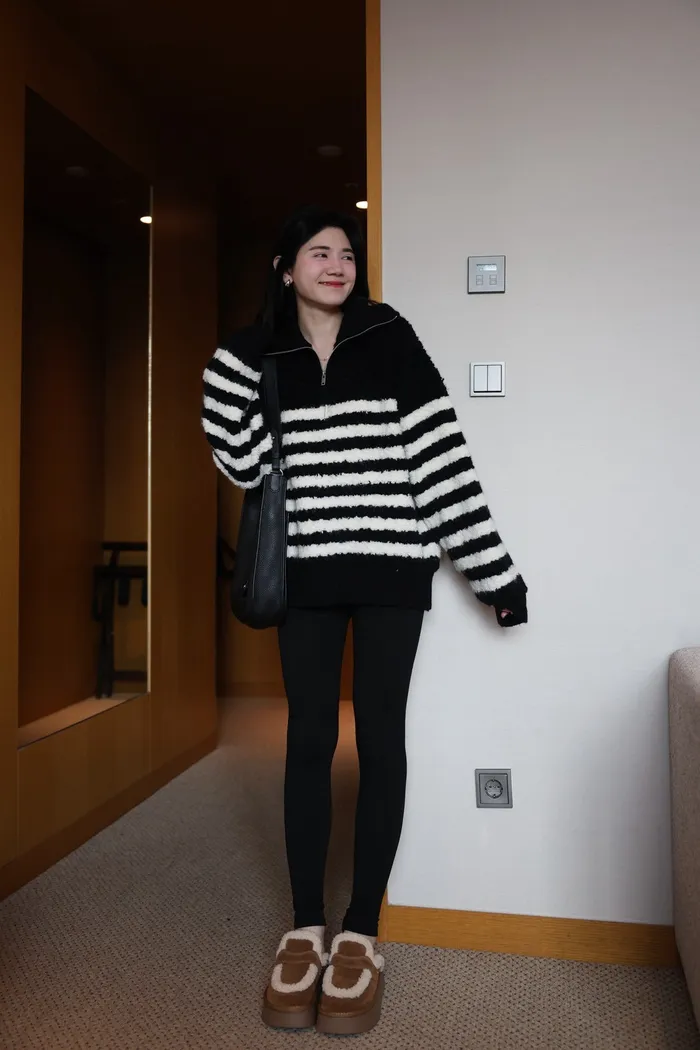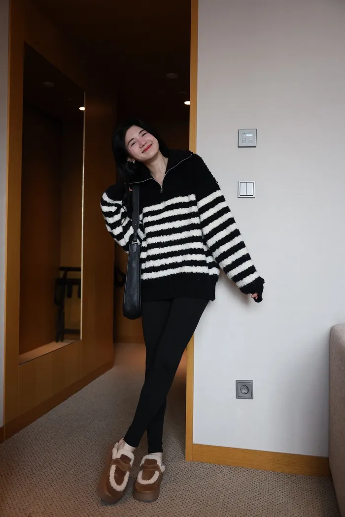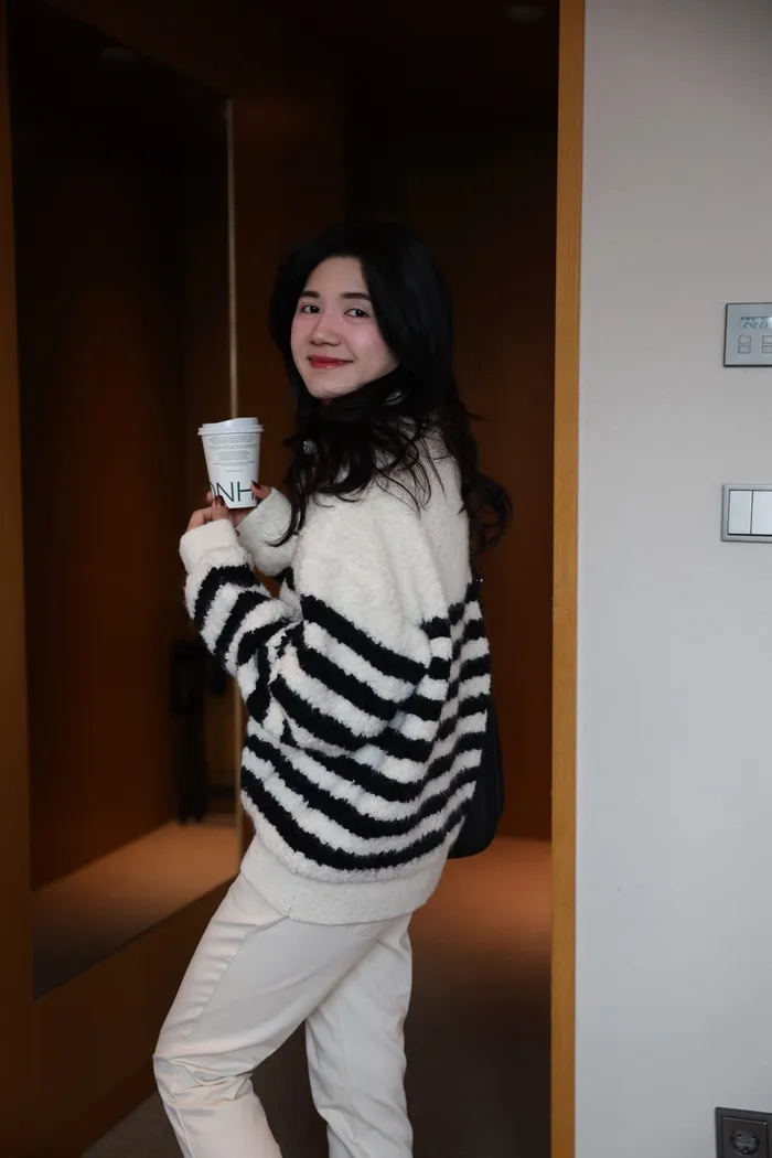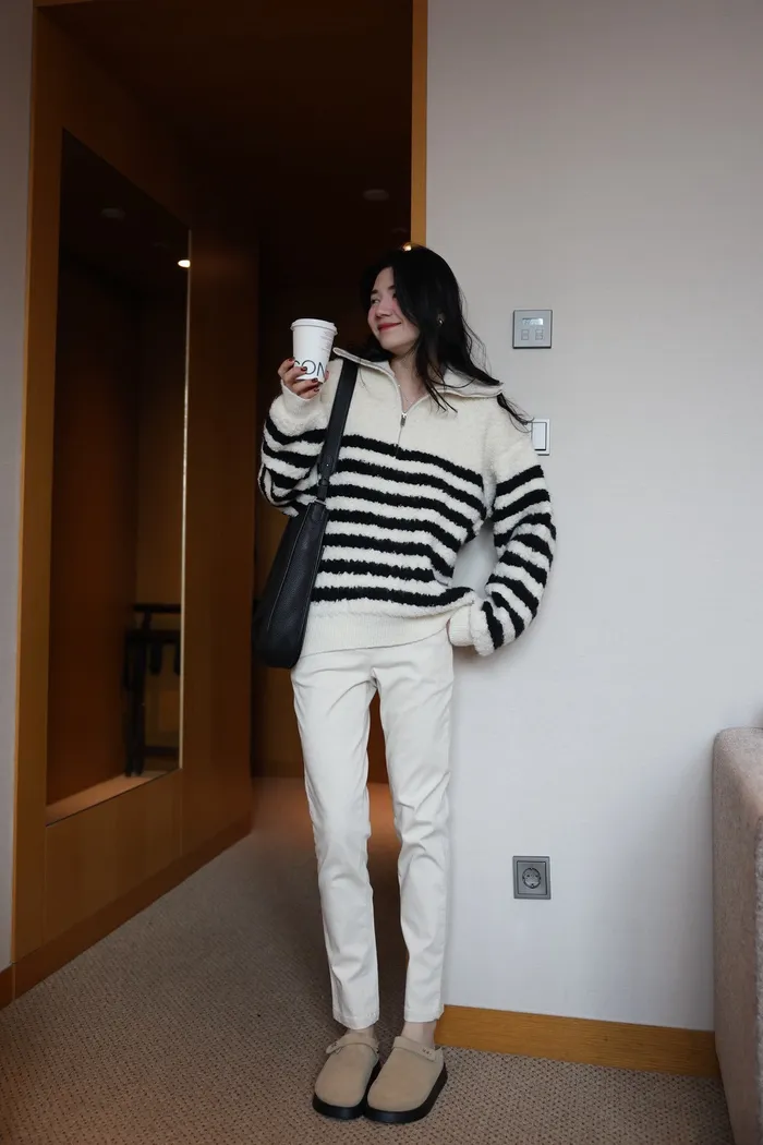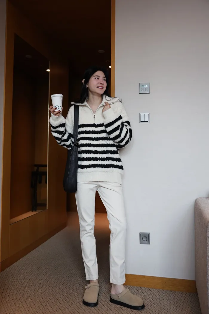 NV09 QQ毛翻領拉鏈條紋毛衣(白/黑)