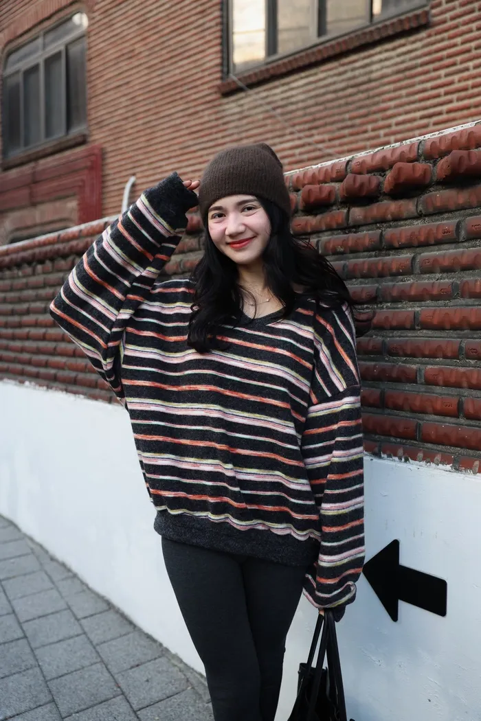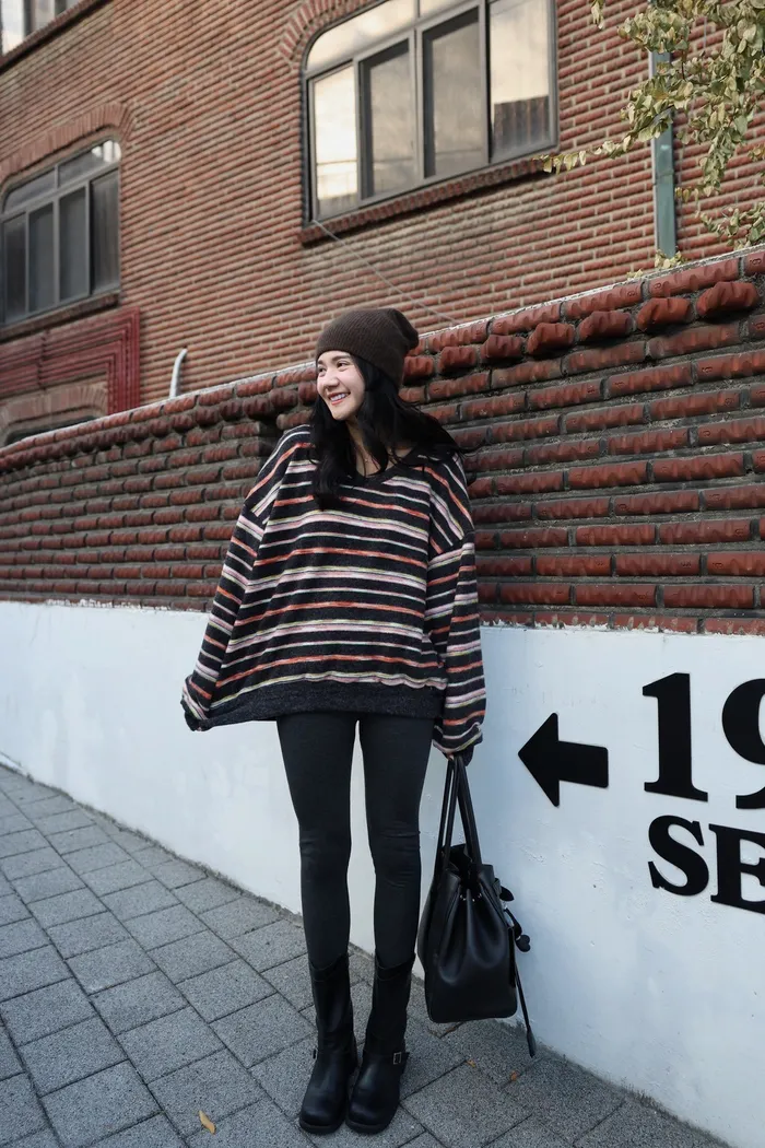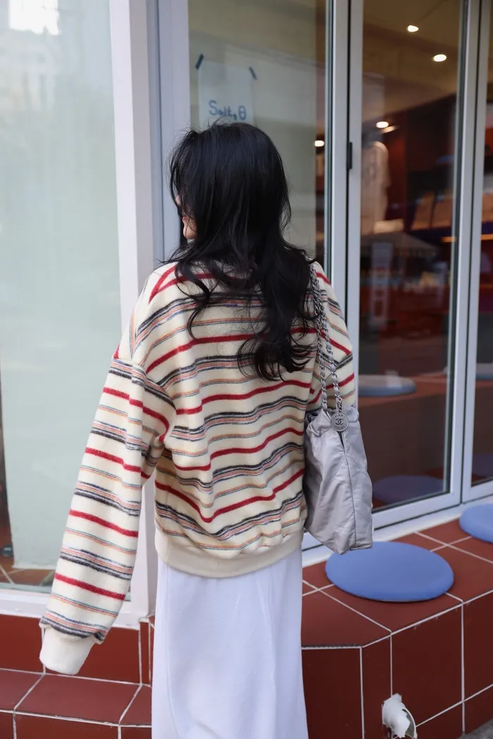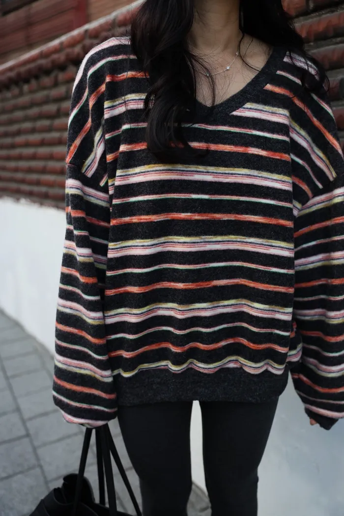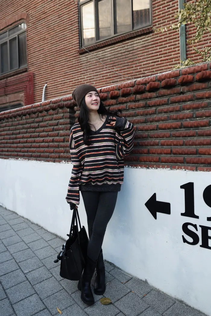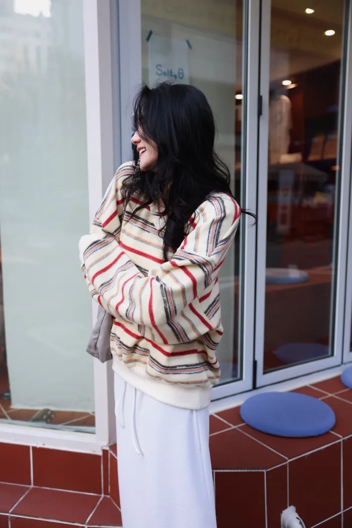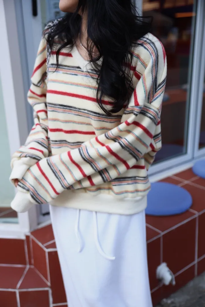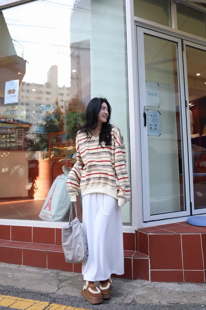 NV14 慵懶感V領條紋撞色寬鬆毛上衣(白/墨)