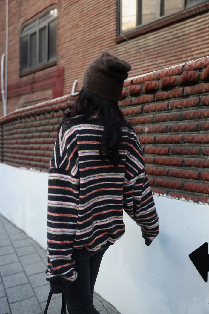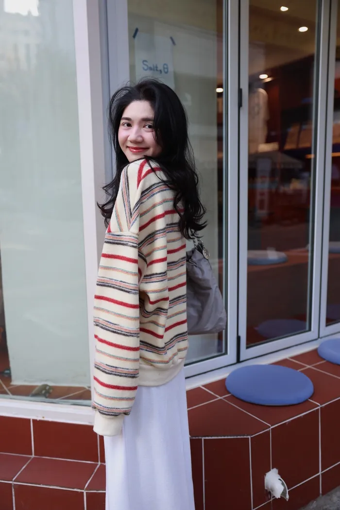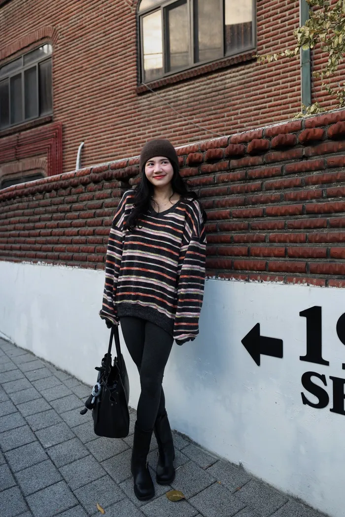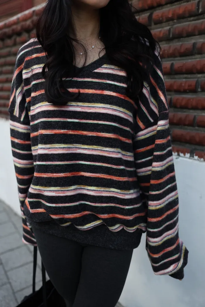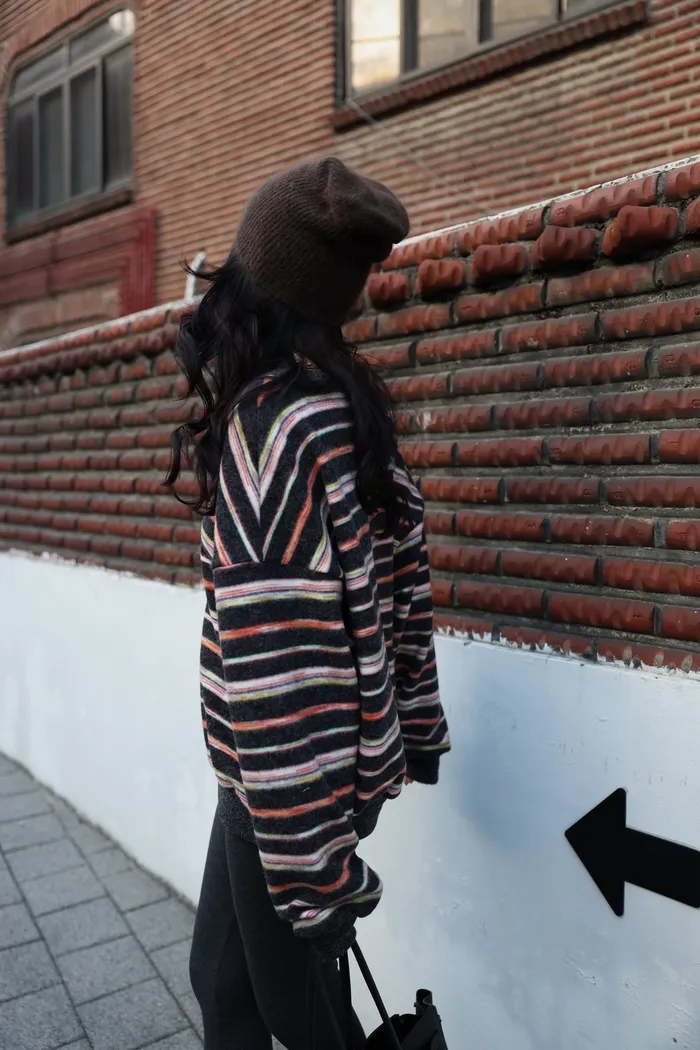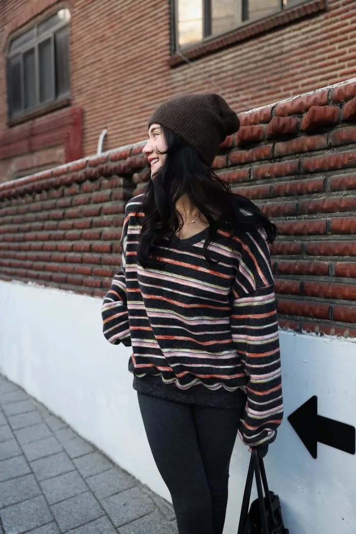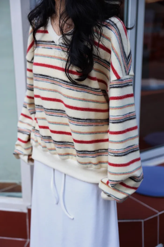 NV14 慵懶感V領條紋撞色寬鬆毛上衣(白/墨)