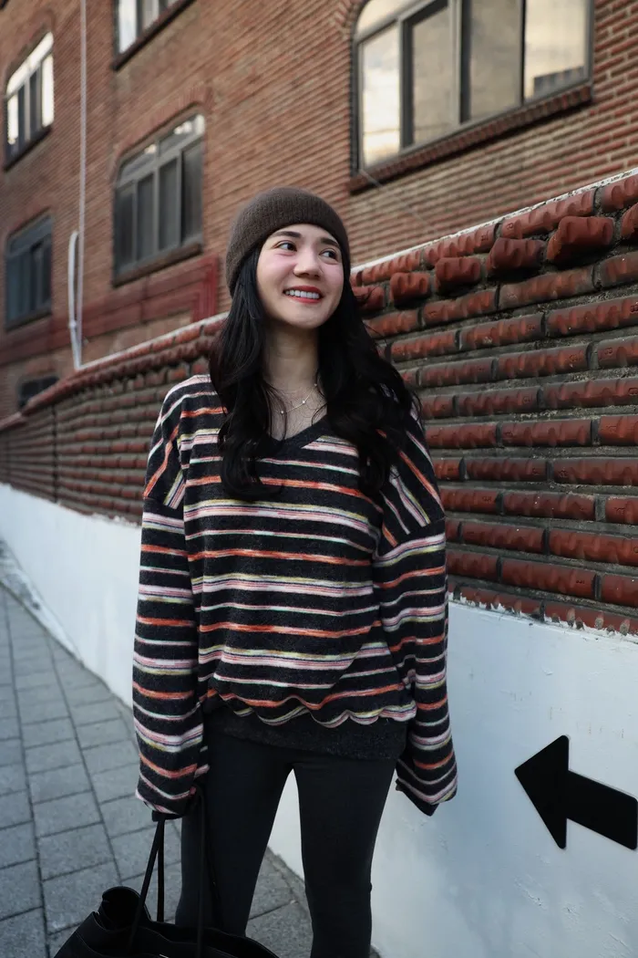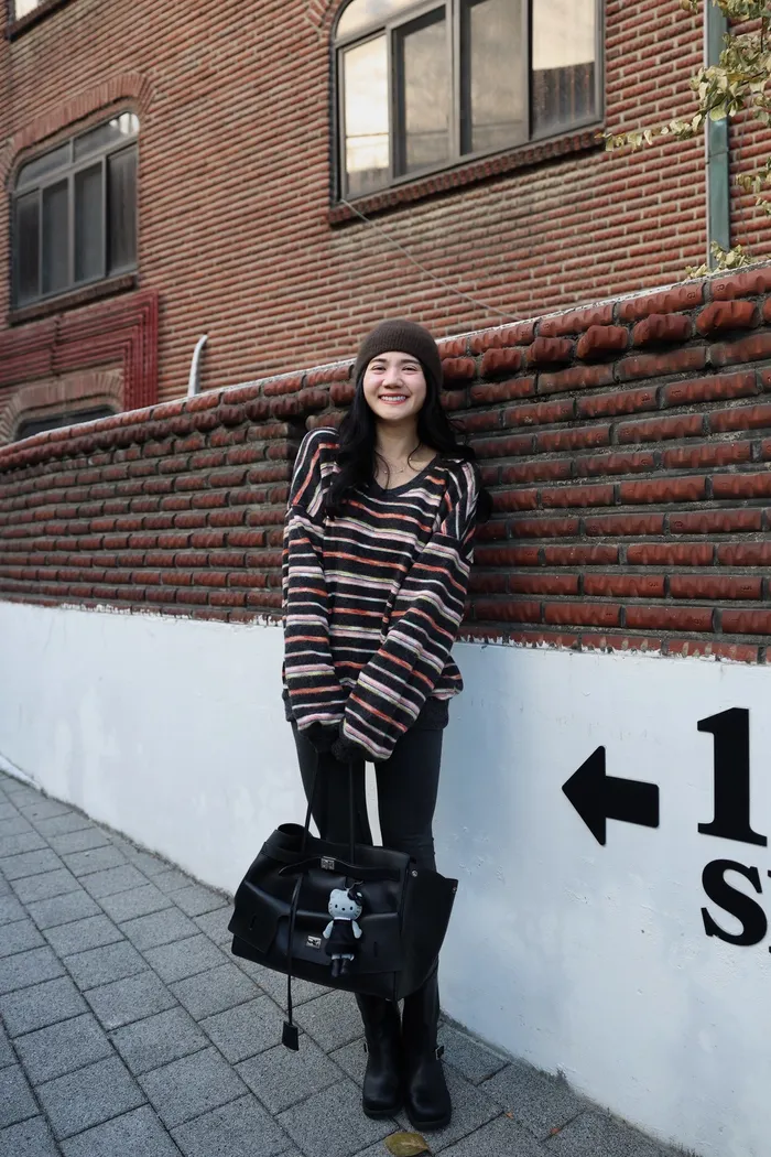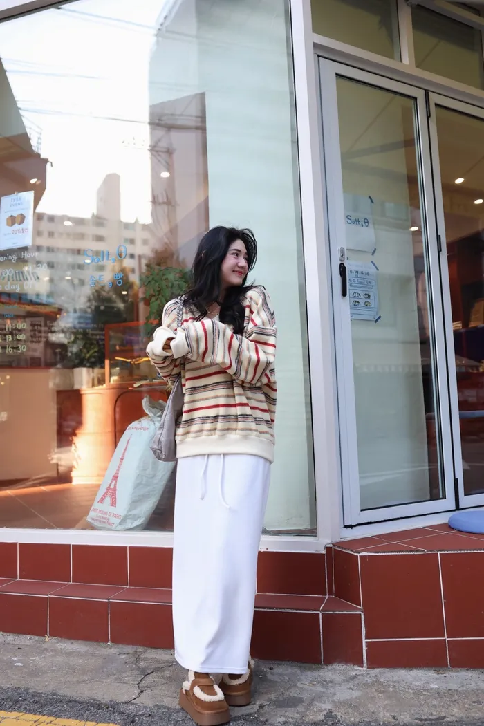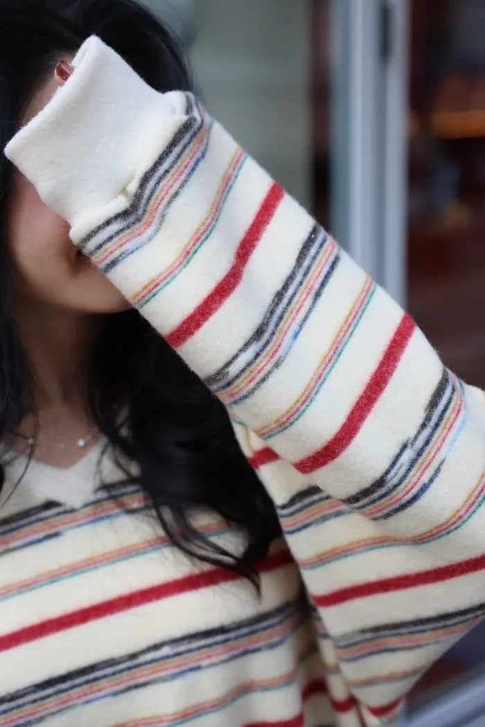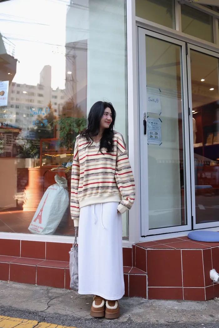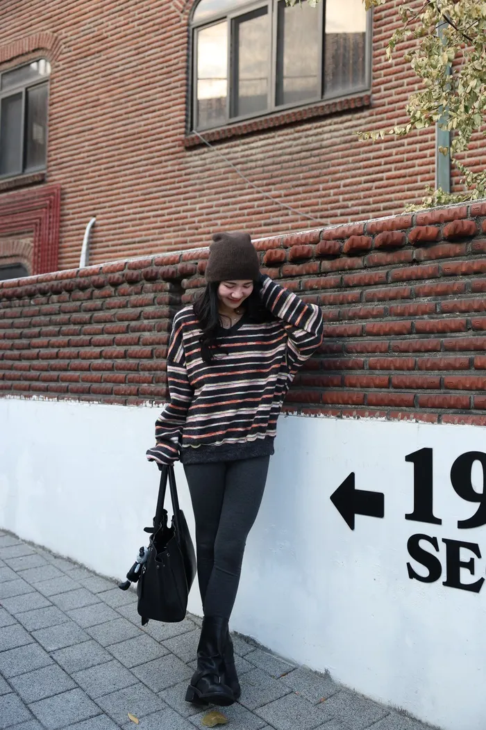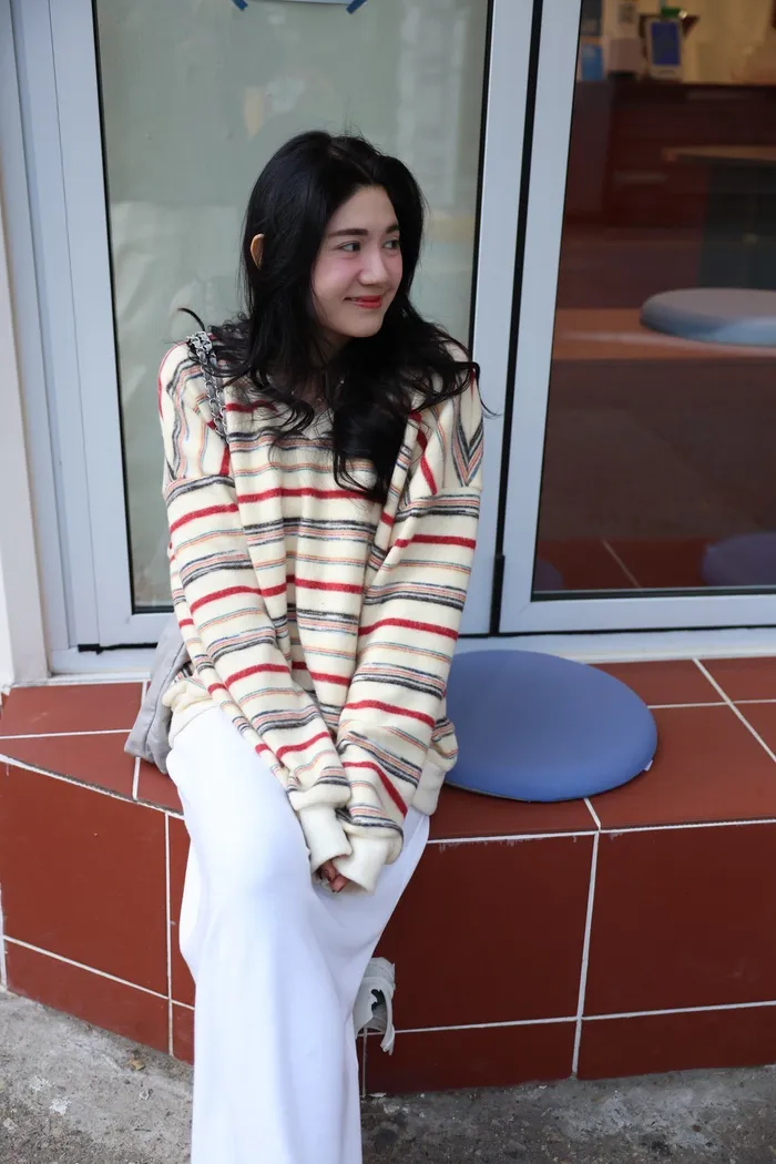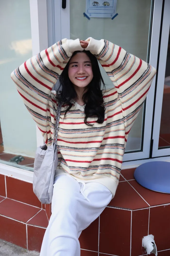 NV14 慵懶感V領條紋撞色寬鬆毛上衣(白/墨)