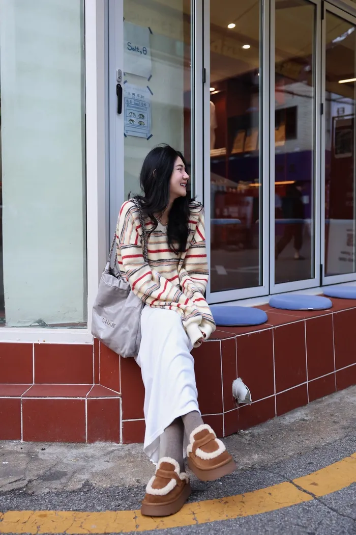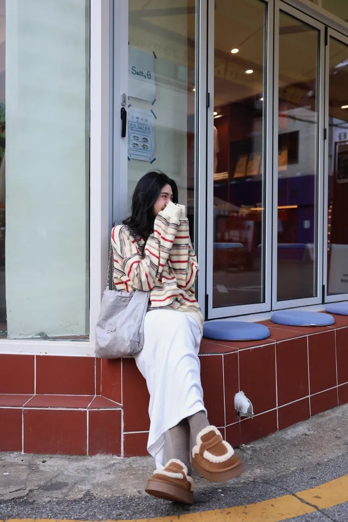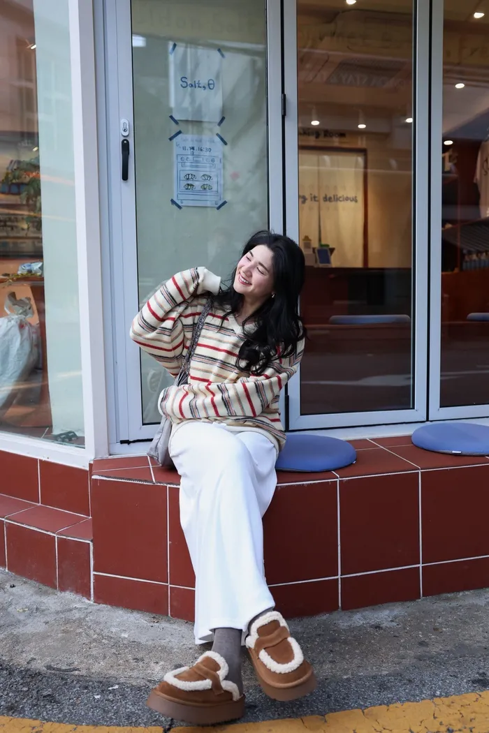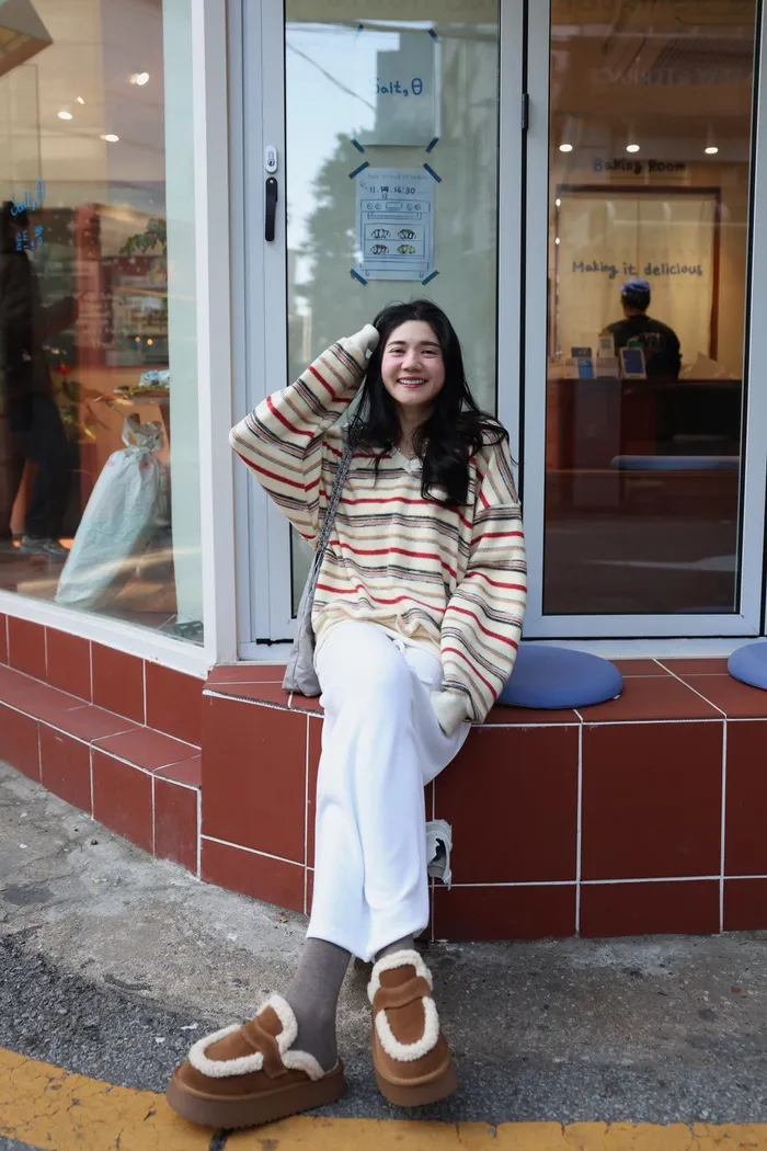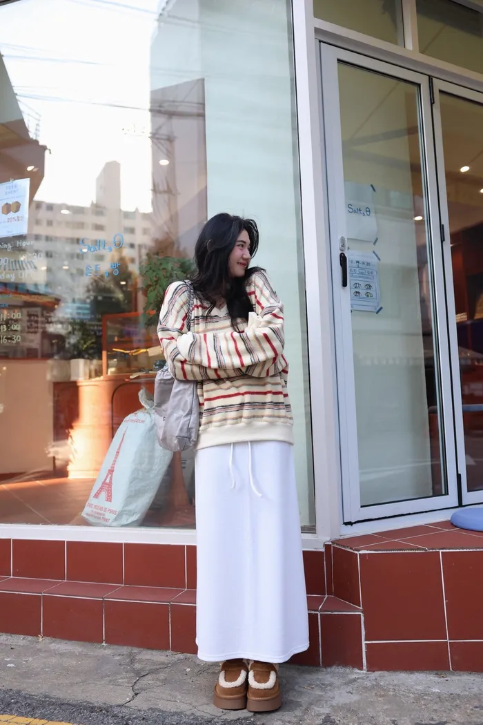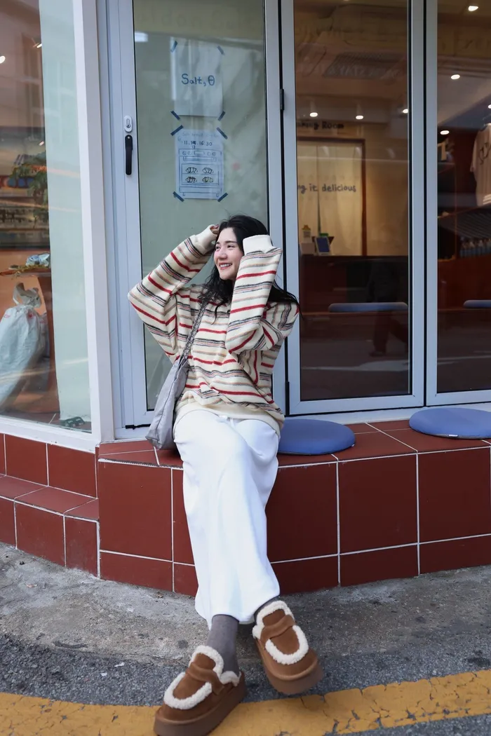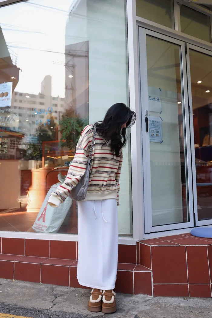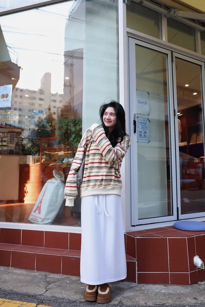 NV14 慵懶感V領條紋撞色寬鬆毛上衣(白/墨)