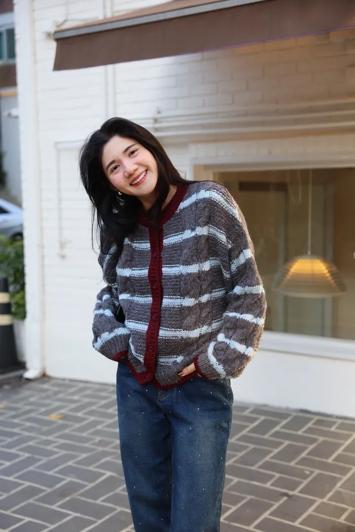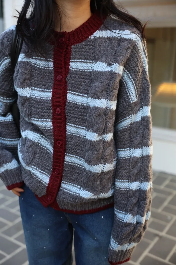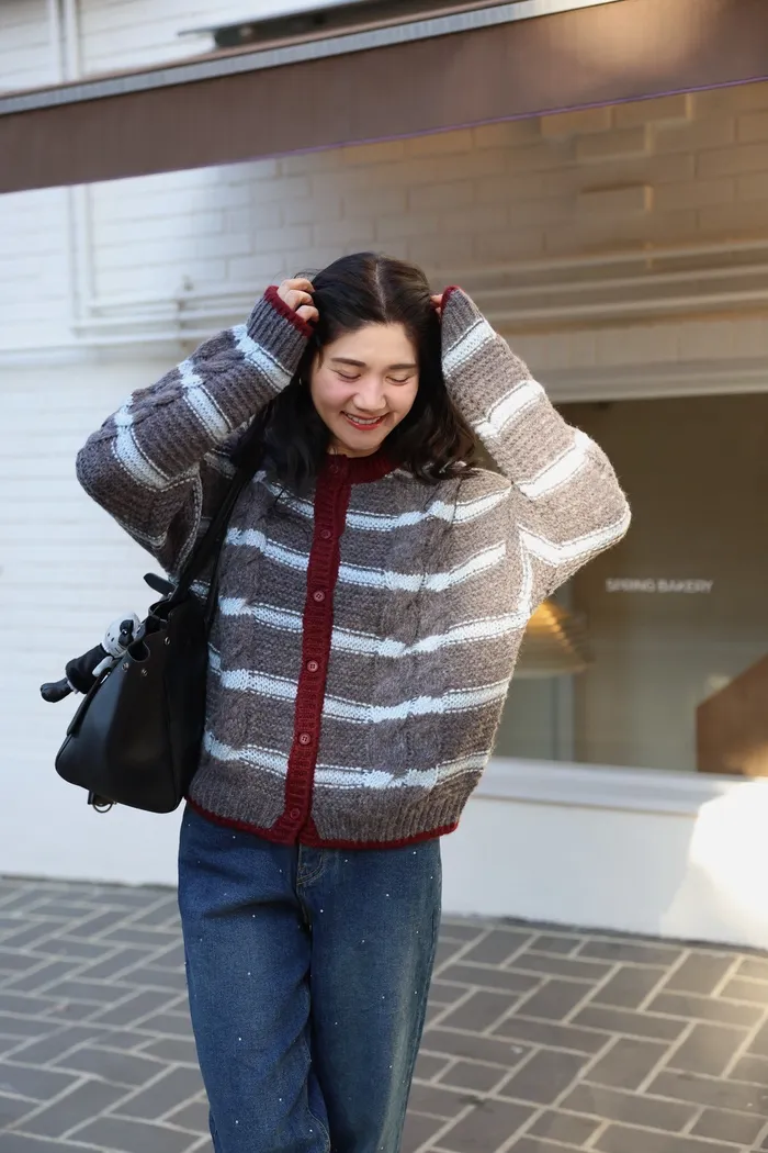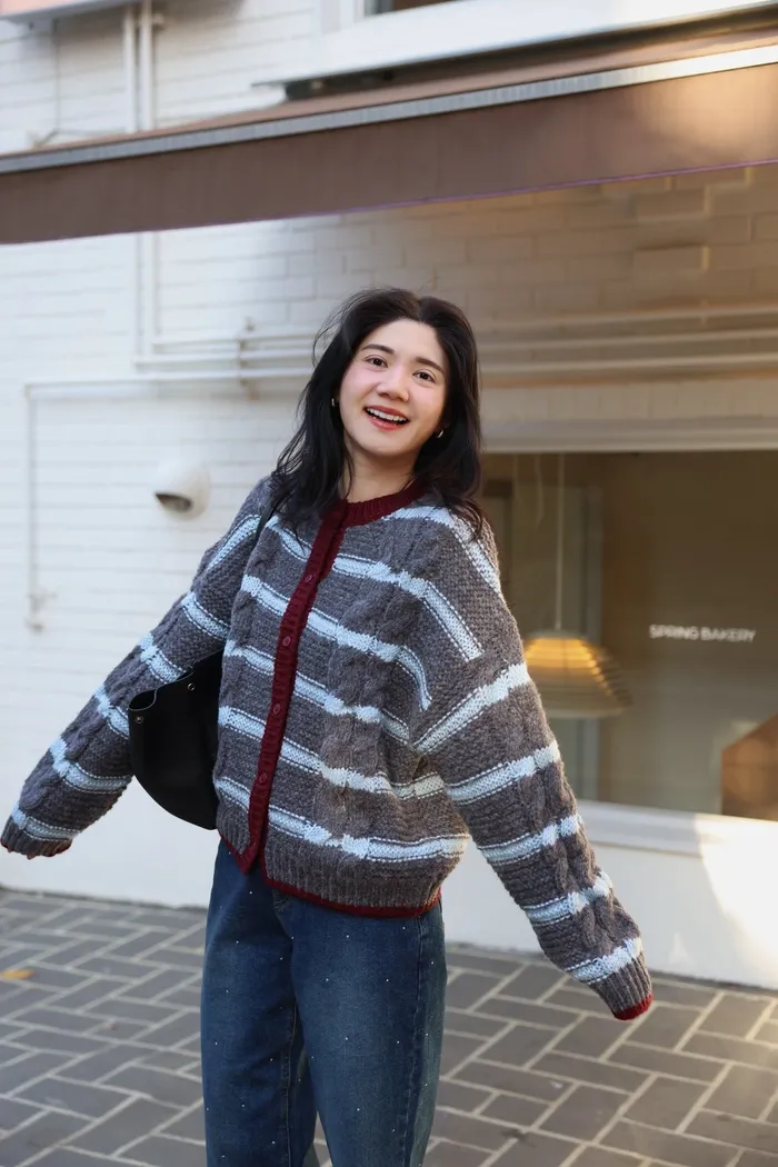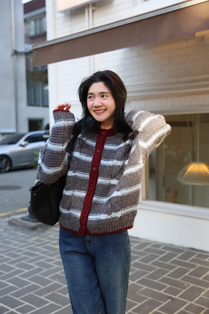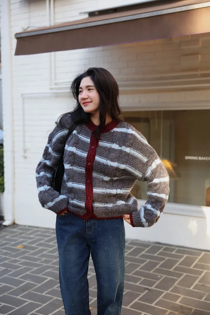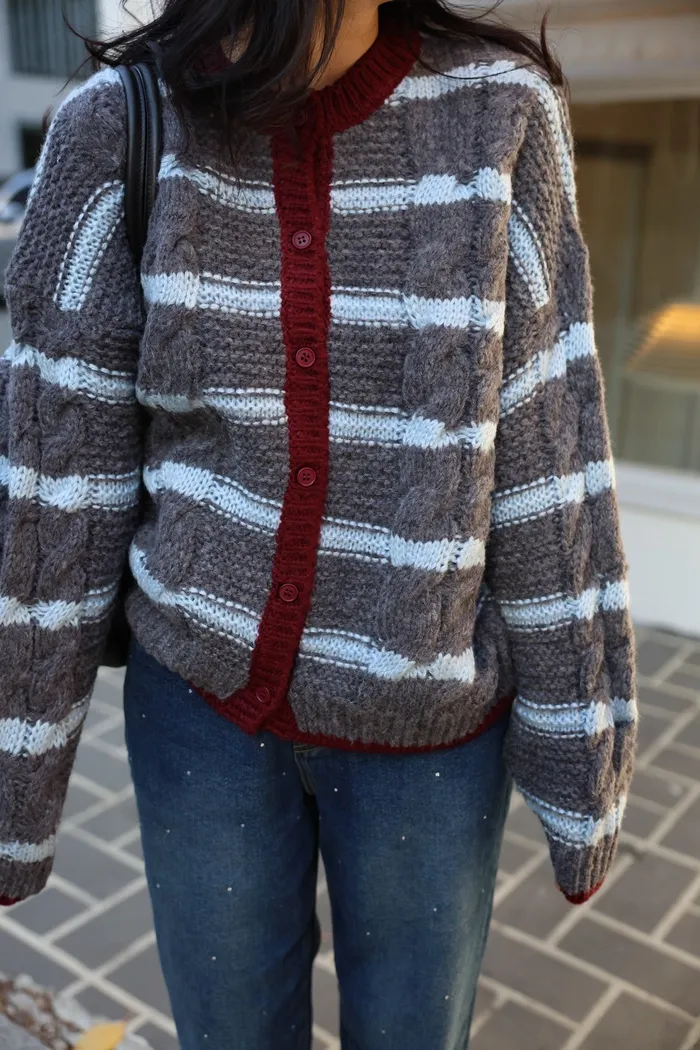 NV18 自留麻花撞色條紋開襟外套(紅灰/咖白)