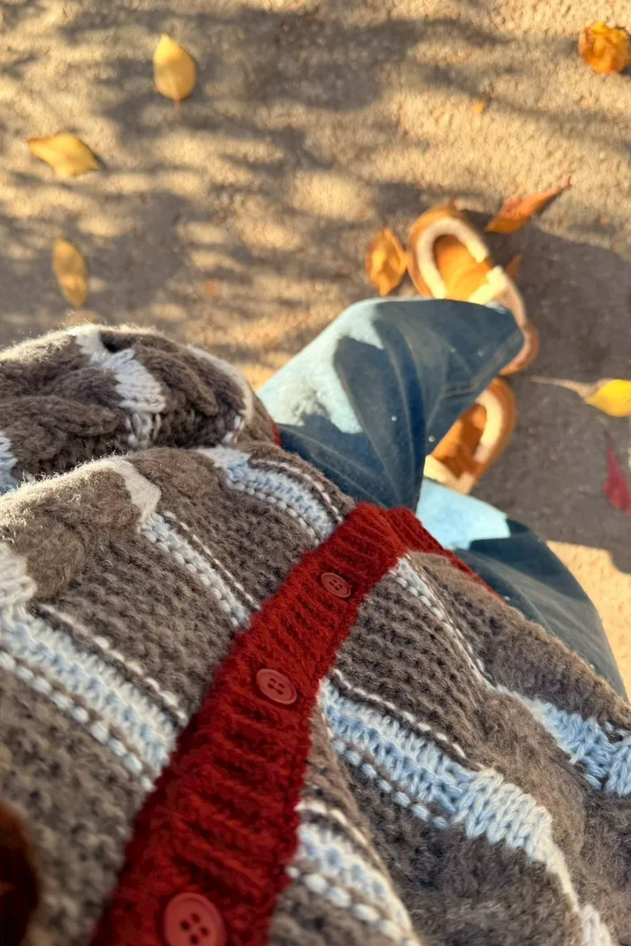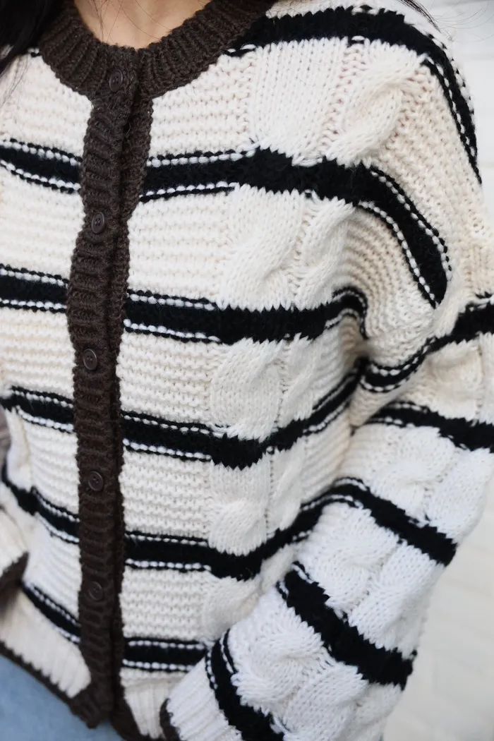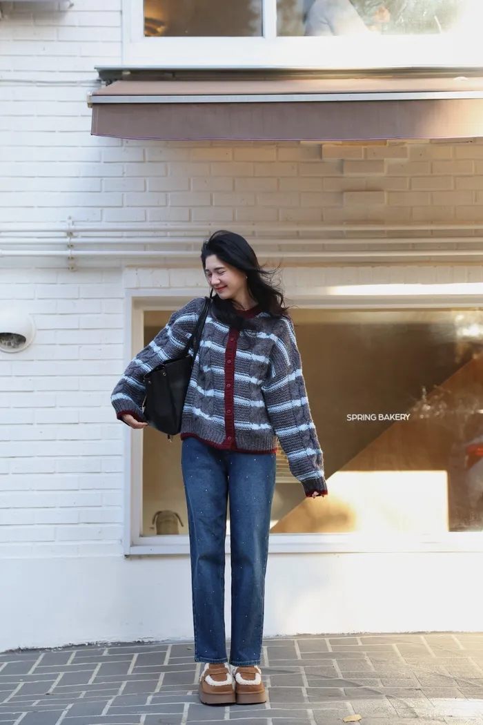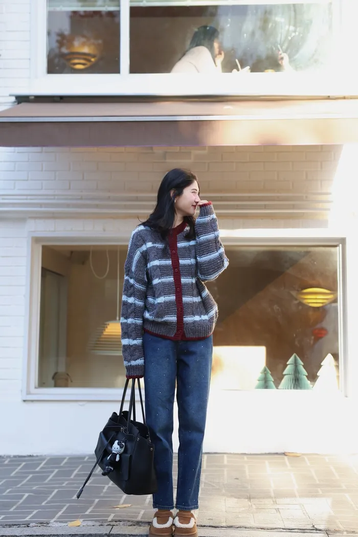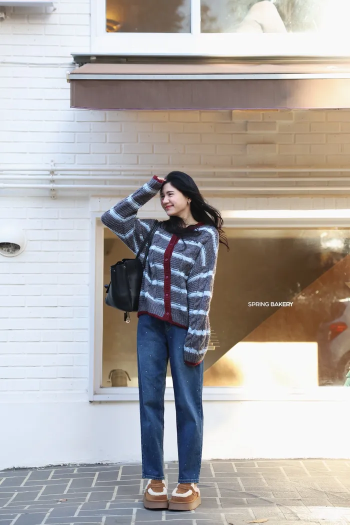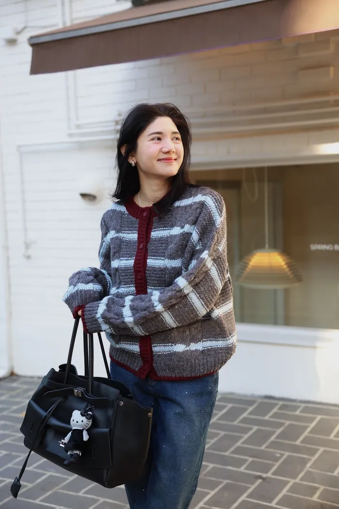 NV18 自留麻花撞色條紋開襟外套(紅灰/咖白)
