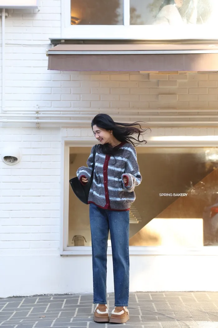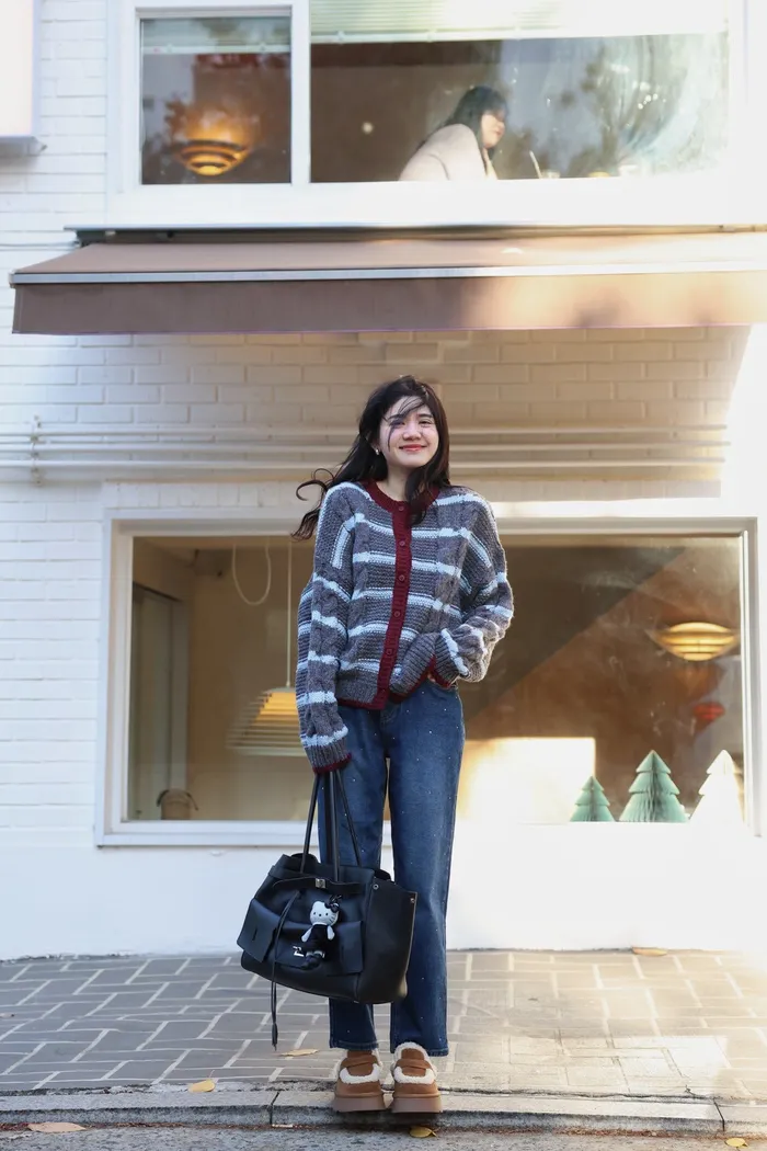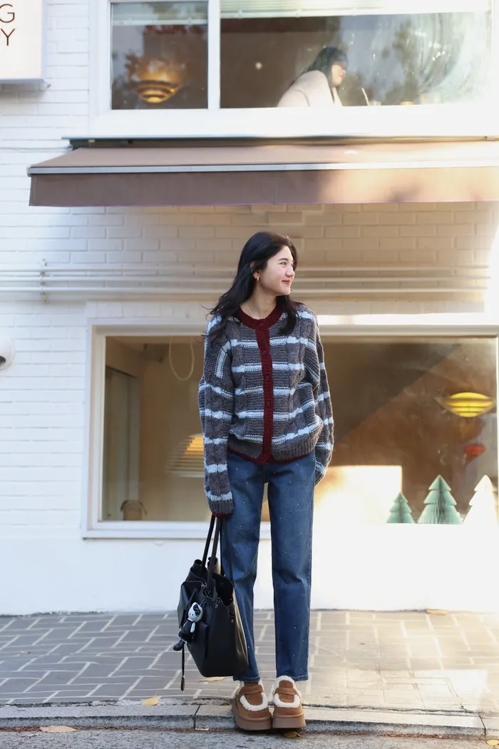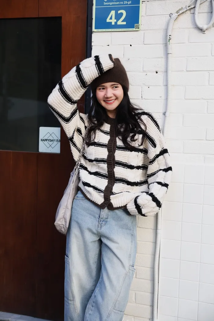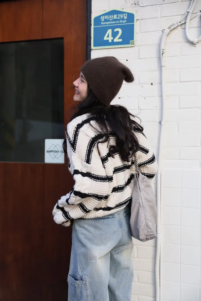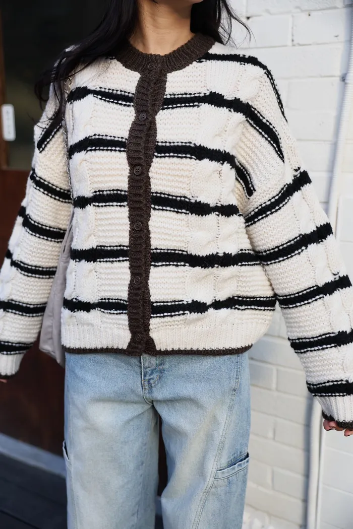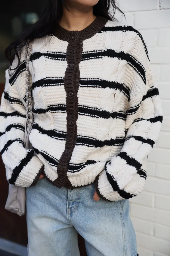 NV18 自留麻花撞色條紋開襟外套(紅灰/咖白)