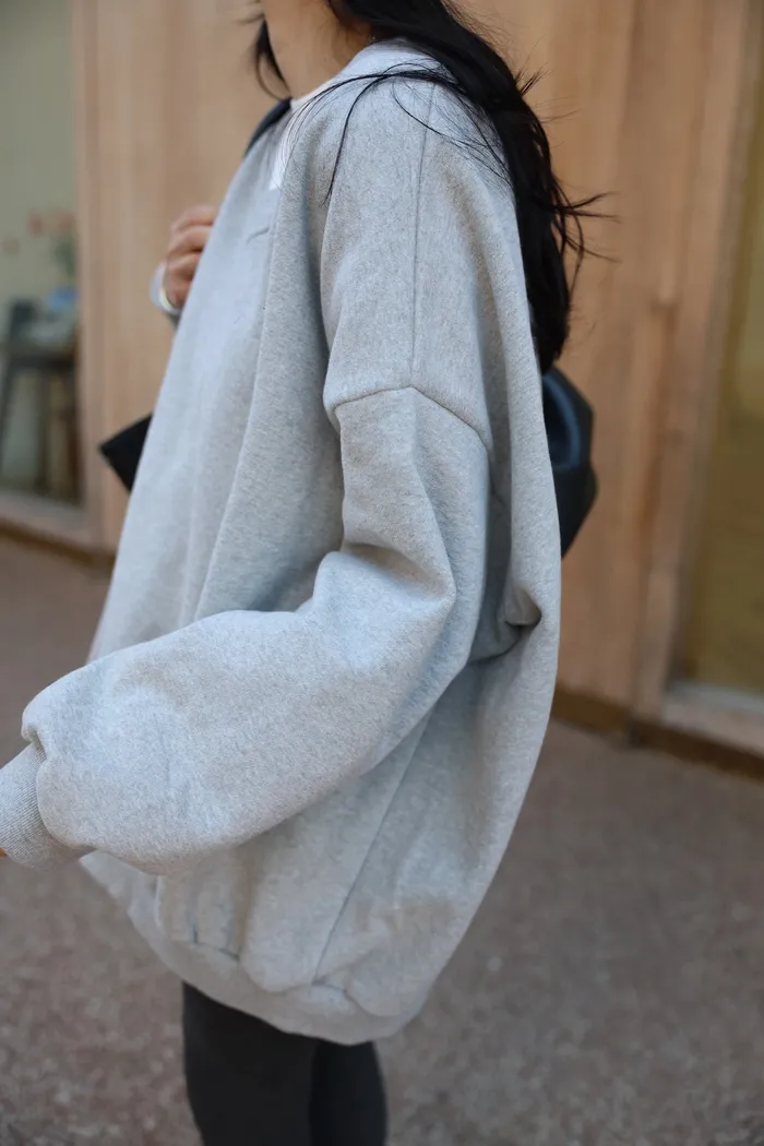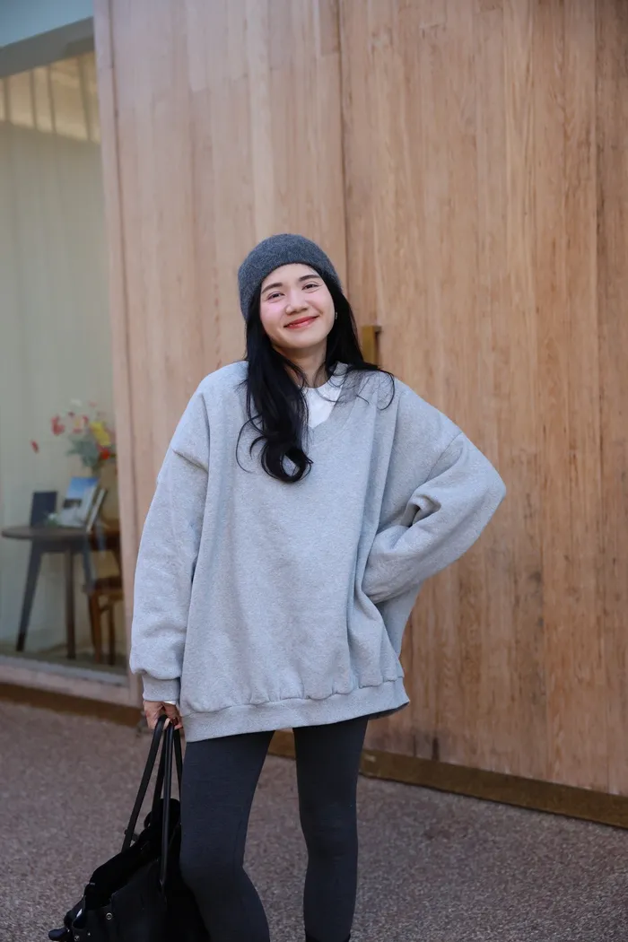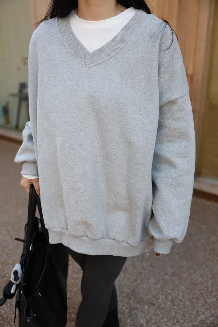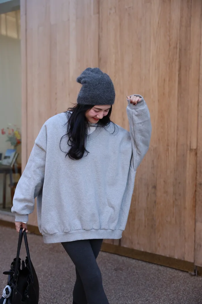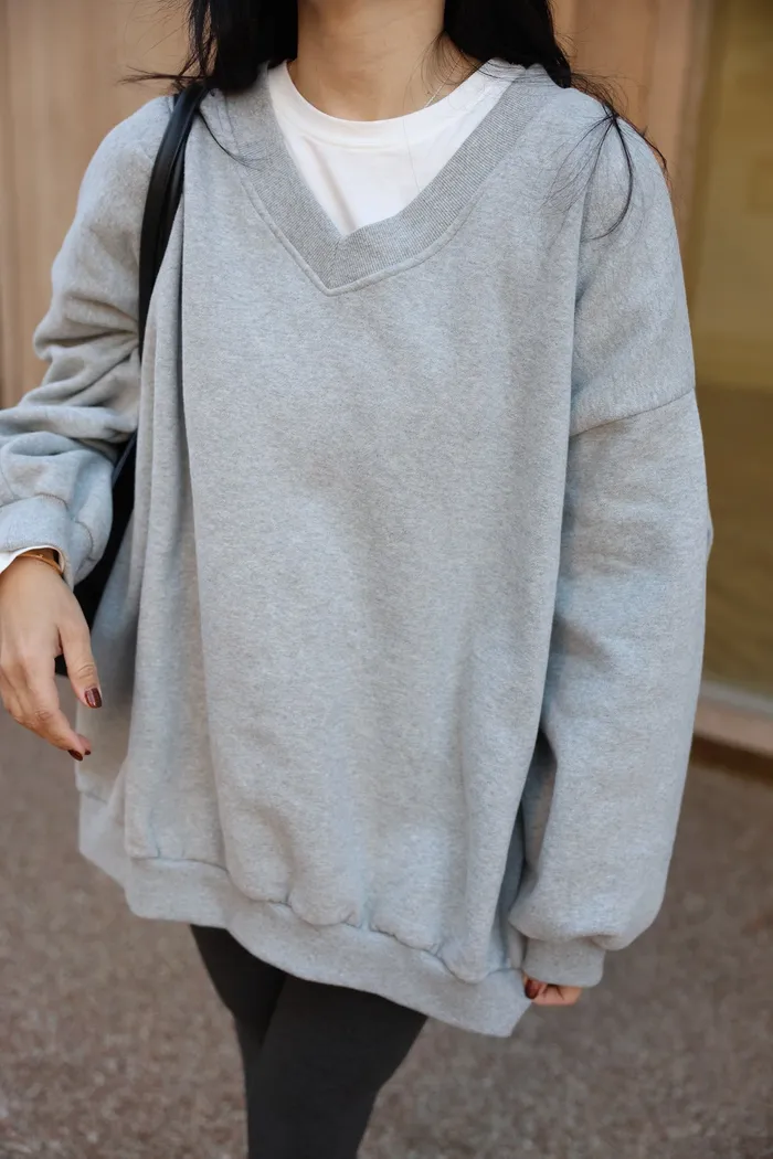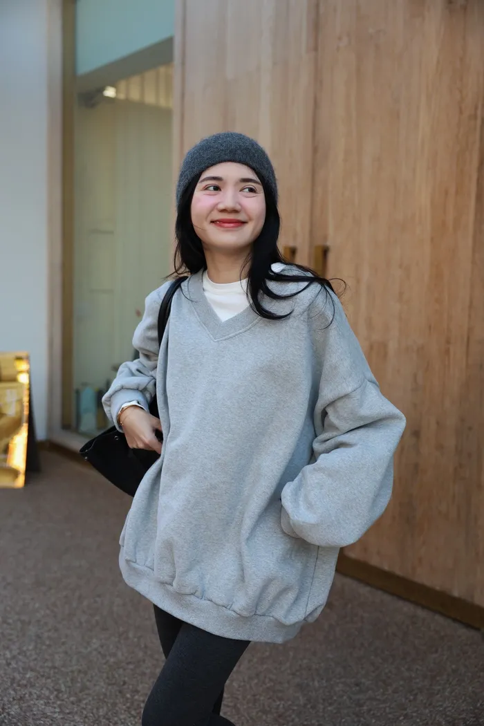 NV55 慵懶感淺灰V領內刷毛長版大學T